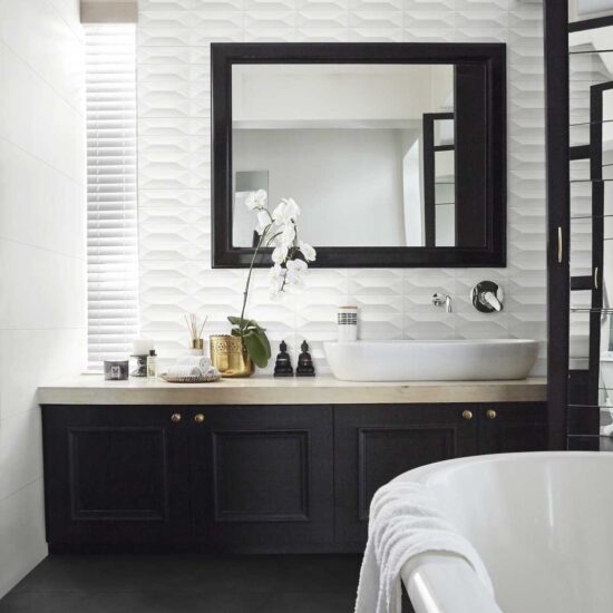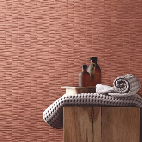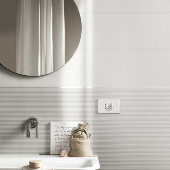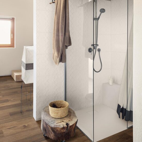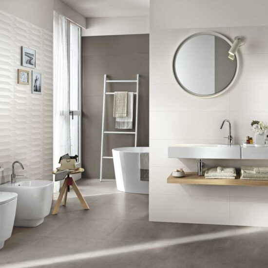 An excellent place to start when selecting 3D tiles for bathroom walls is the choice of colour; you may opt for warm or cool matt shades, such as those in the Ragno Resina slimline thickness wall tile collection: Avorio, Rosa and Terracotta on the one hand, and Bianco, Grigio and Ardesia on the other, in a single large 40×120 cm size.