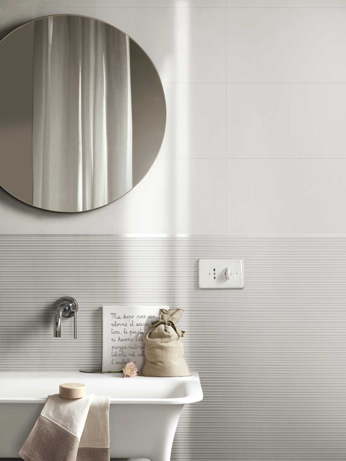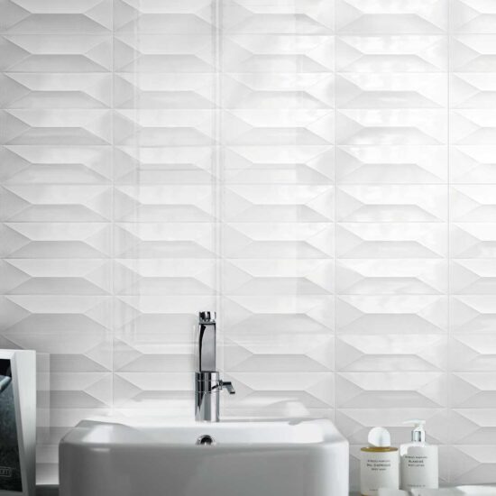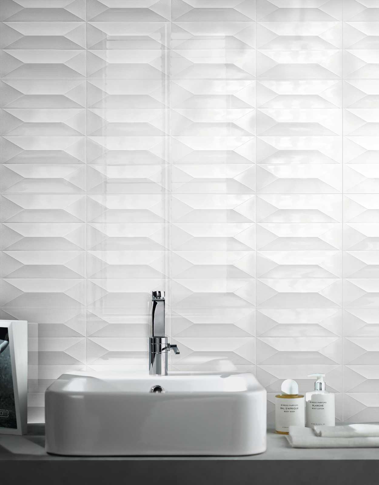 Looking for a total white 3D bathroom wall covering? In the Off ceramic wall tile collection by Ragno, the 30×90 cm tiles are all in white, both satiny and glossy. This makes the tactile consistencies of the 3D tiles, available both with diamond faceting and with three-dimensional stripes, and the sharp chiaroscuro patterns they create with the light, the dominant features of the walls.
