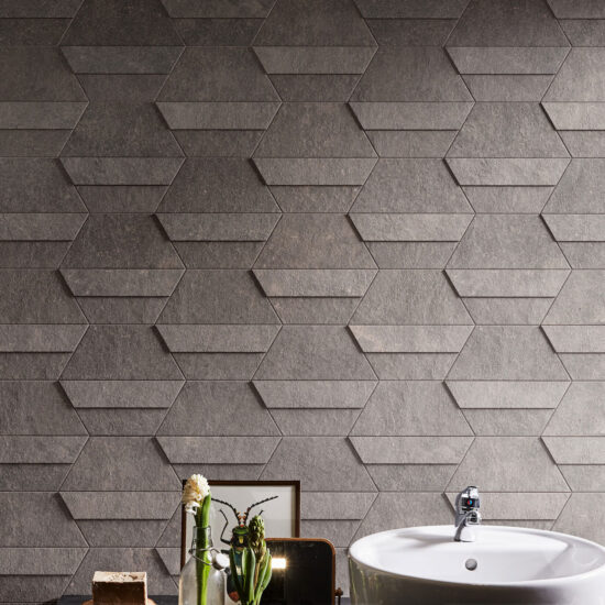 One possible option is the three-dimensional hexagon mosaics of the Realstone Lunar stone-effect porcelain stoneware collection. The 3D tiles in the Realstone Lunar collection are hexagons of 29×33.5 cm incorporating trapezoids in staggered planes. Ragno offers them in 5 timeless colours: White, Silver and Deep Grey, Beige and Uniform.