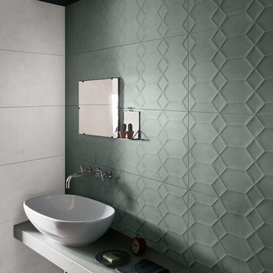 Resina also features an original texture with slightly twisted “pin-stripes”: the result is a surface full of vigour, irregular and different in every point. What’s more, the collection’s second three-dimensional idea is a geometric pattern of intersecting hexagons – just like the cells of a honeycomb. The perimeters of the hexagons consist of slightly raised lines that stand out a little from the surface of the tile, giving balance to the wall’s overall design.