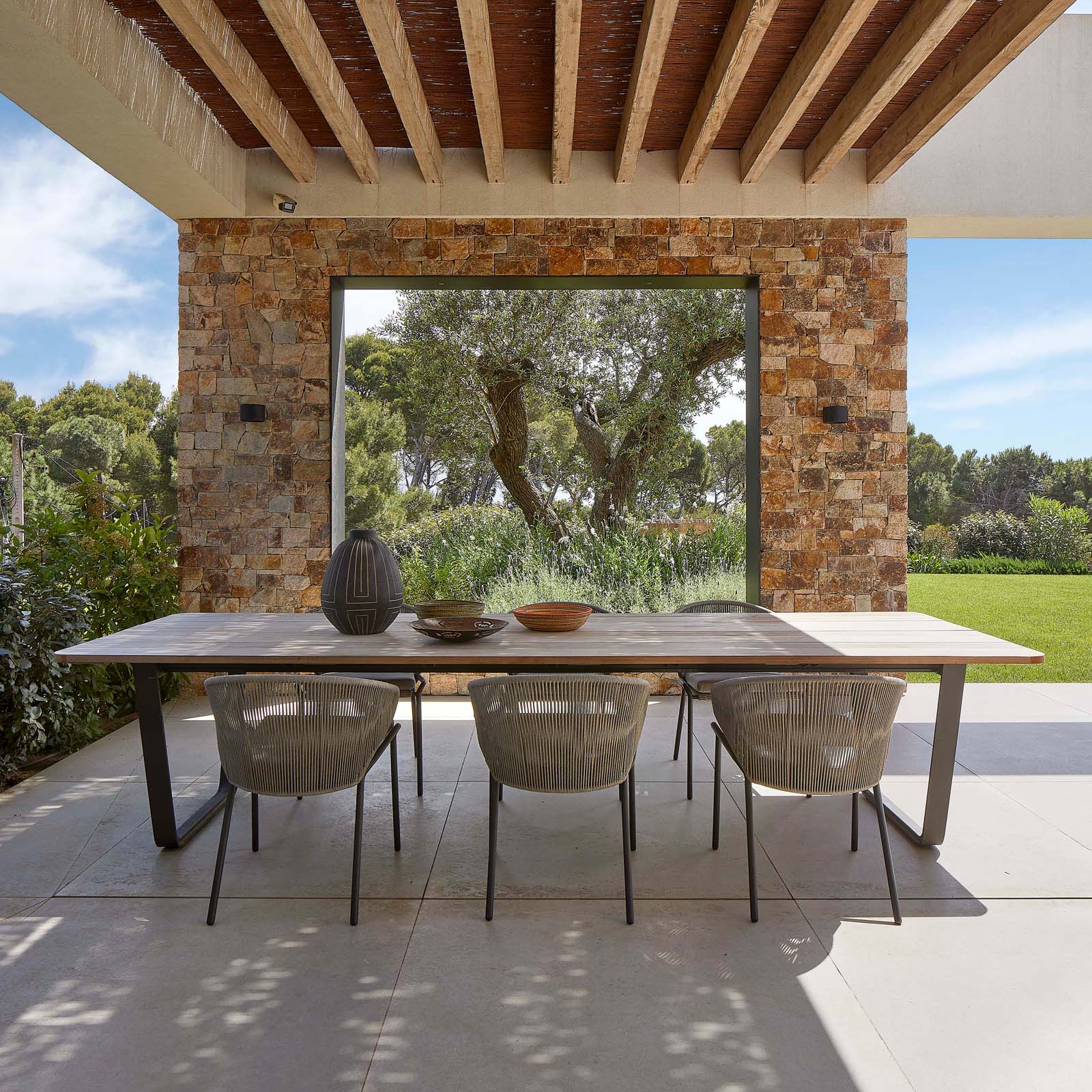 To maintain the connection between indoors and outdoors, the same material is used for the floors of the entire living and sleeping areas and some of the outdoor paving: this is the Ragno Realstone_Rain collection, a stoneware inspired by an English limestone featuring subtle shade variations in tones of greige, which also harmonises with the colors of the drystone finish of the external walls.