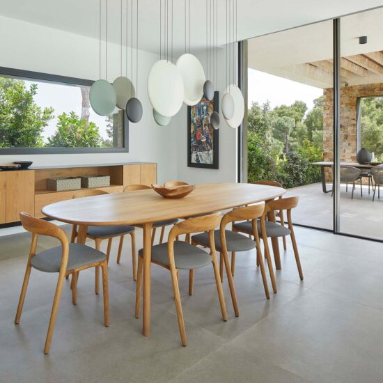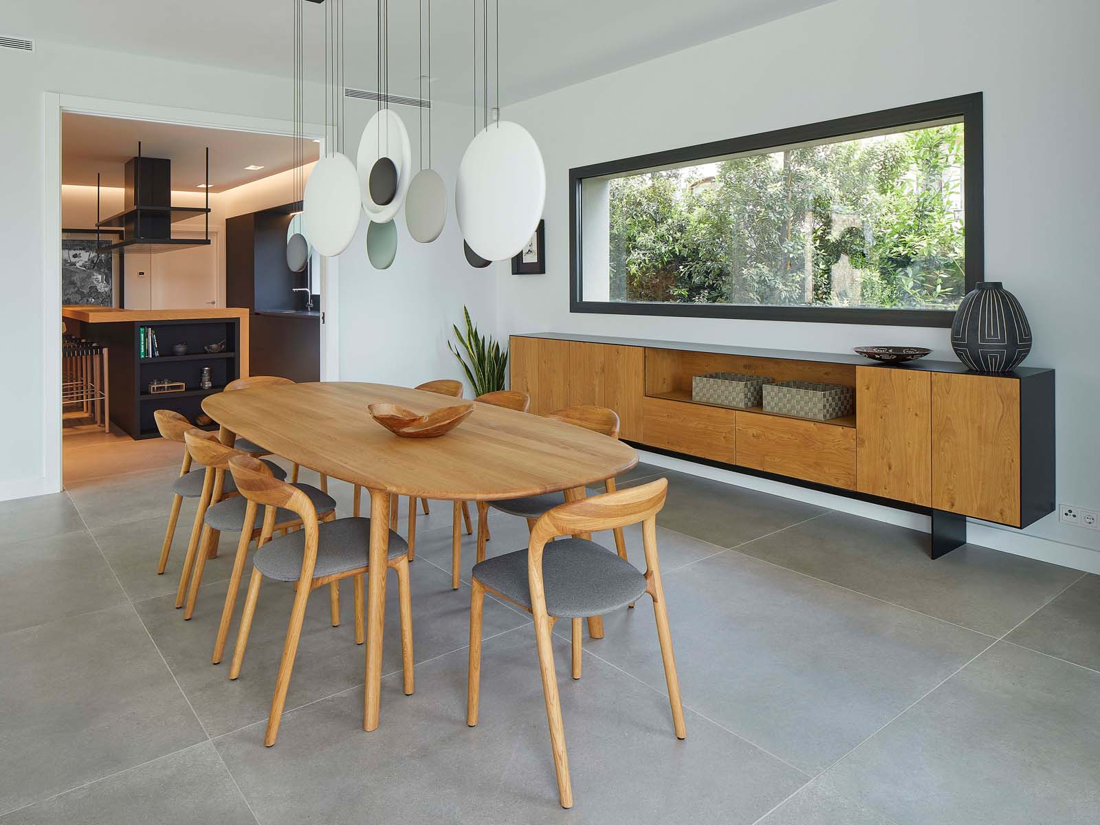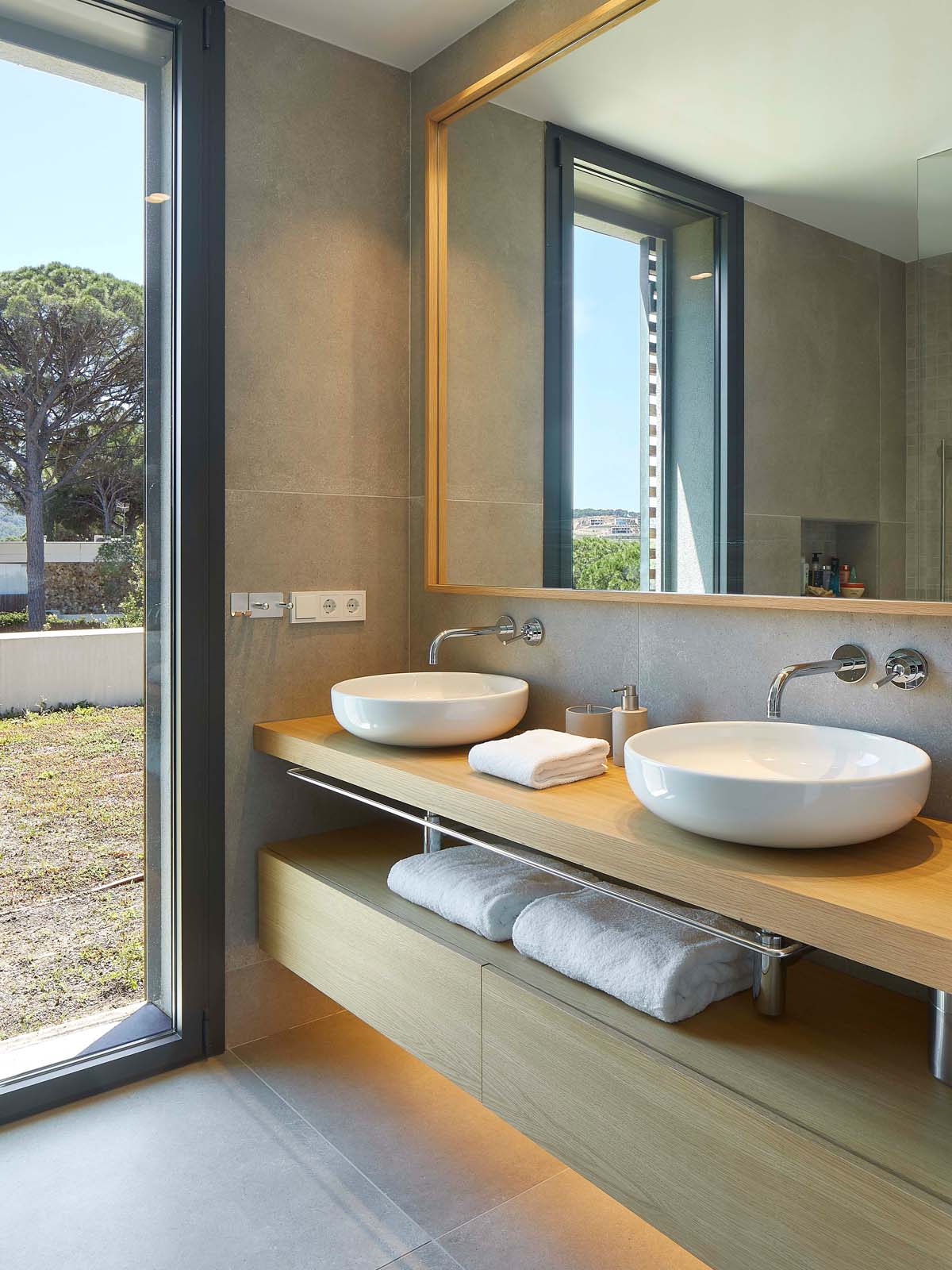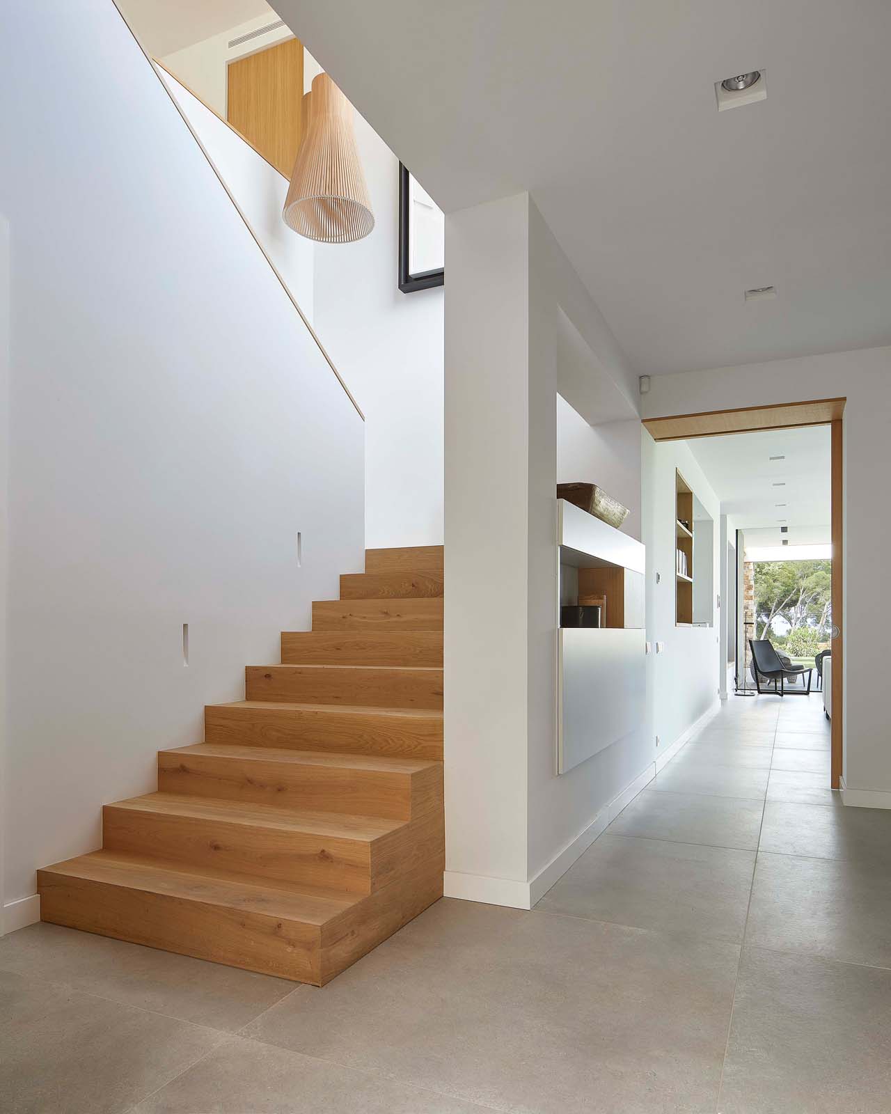 The furnishings – all in warm varieties of wood and neutral shades embracing the whole range of greys – maintain the house’s immaculate contemporary look, also supported by the finishes chosen for the coverings.