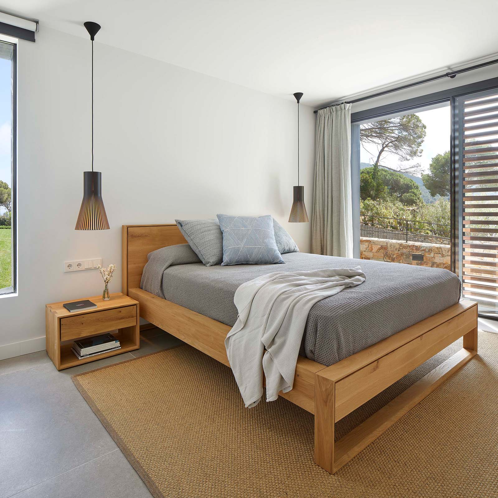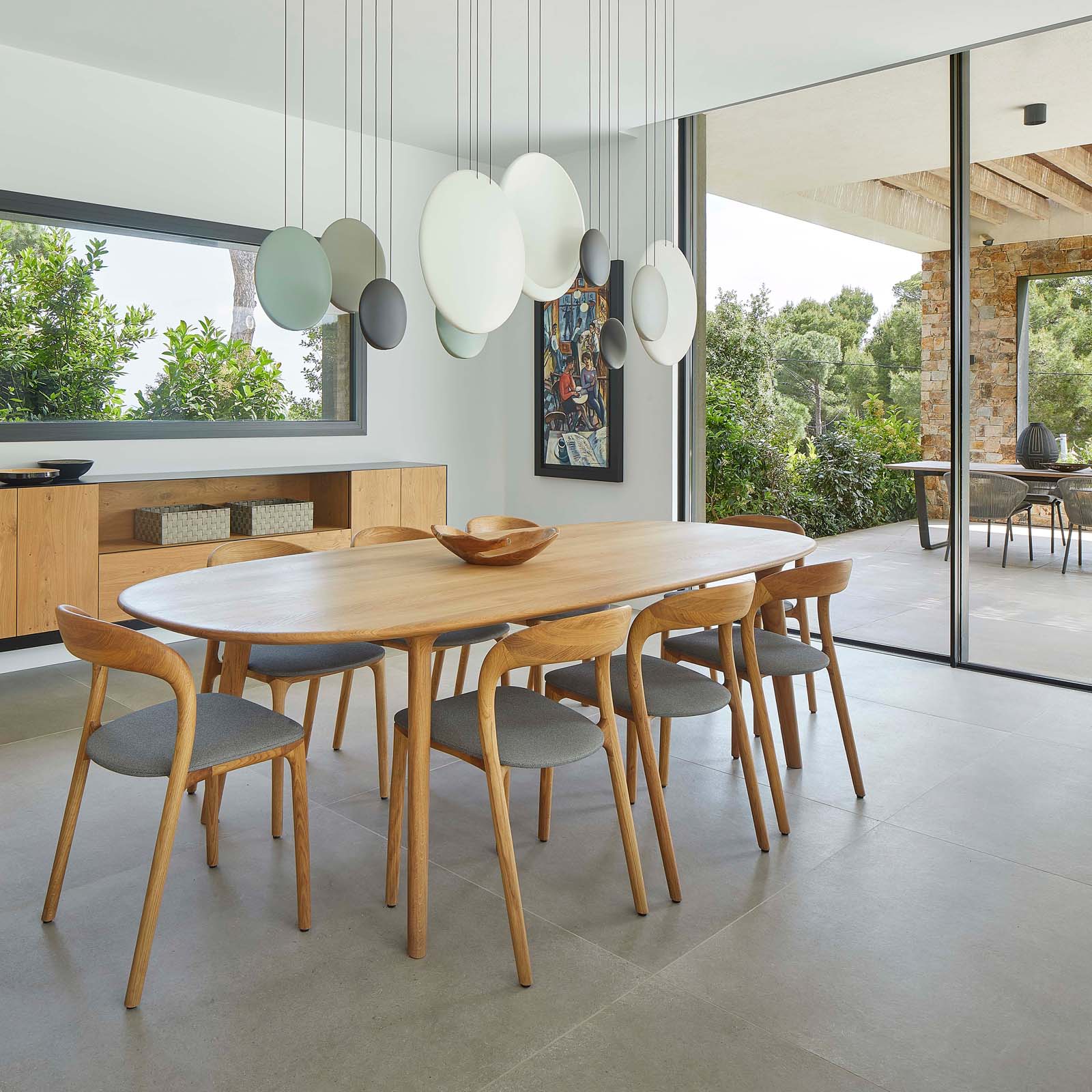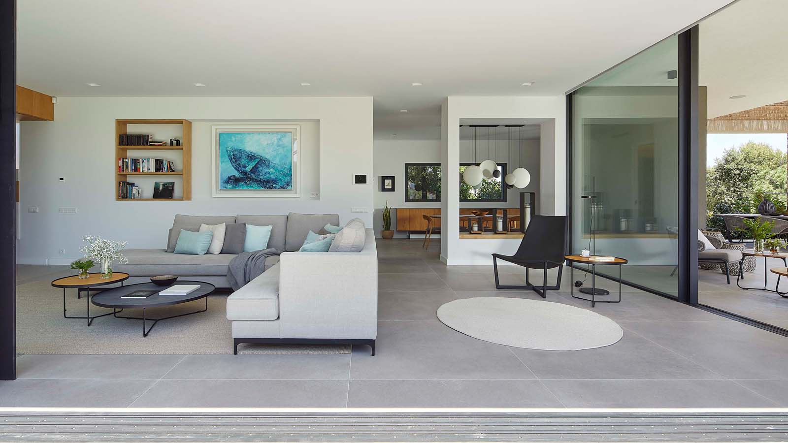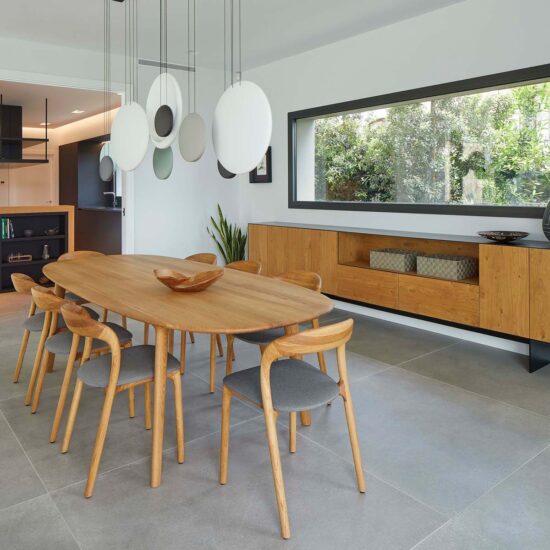 The furnishings – all in warm varieties of wood and neutral shades embracing the whole range of greys – maintain the house’s immaculate contemporary look, also supported by the finishes chosen for the coverings.