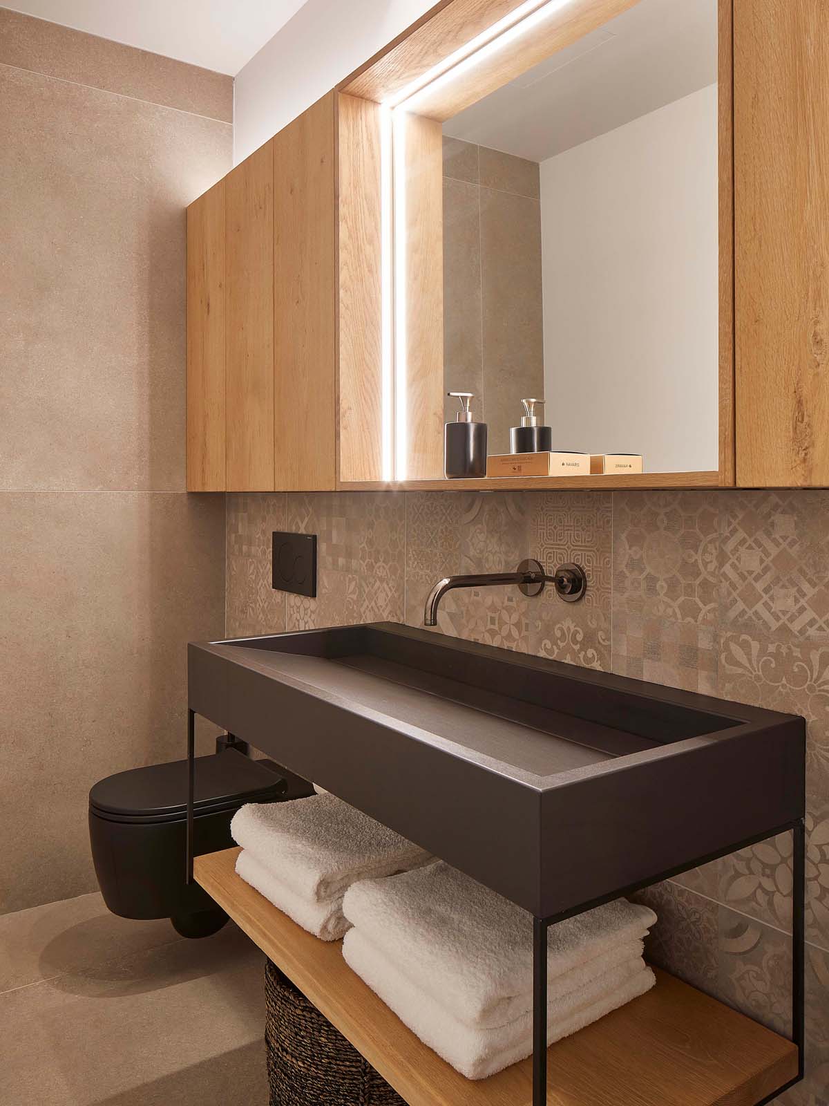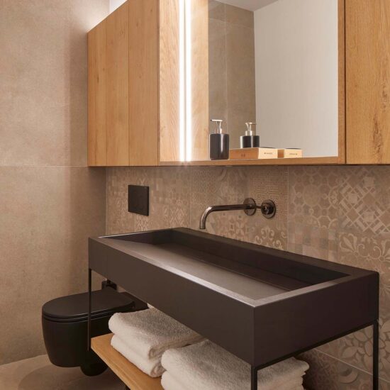 Specifically, the architects chose the 120×120 cm size in Greige finish, the intermediate shade in the collection’s set of three – Almond, Greige and Taupe, also designed to enable attractive combinations of them.