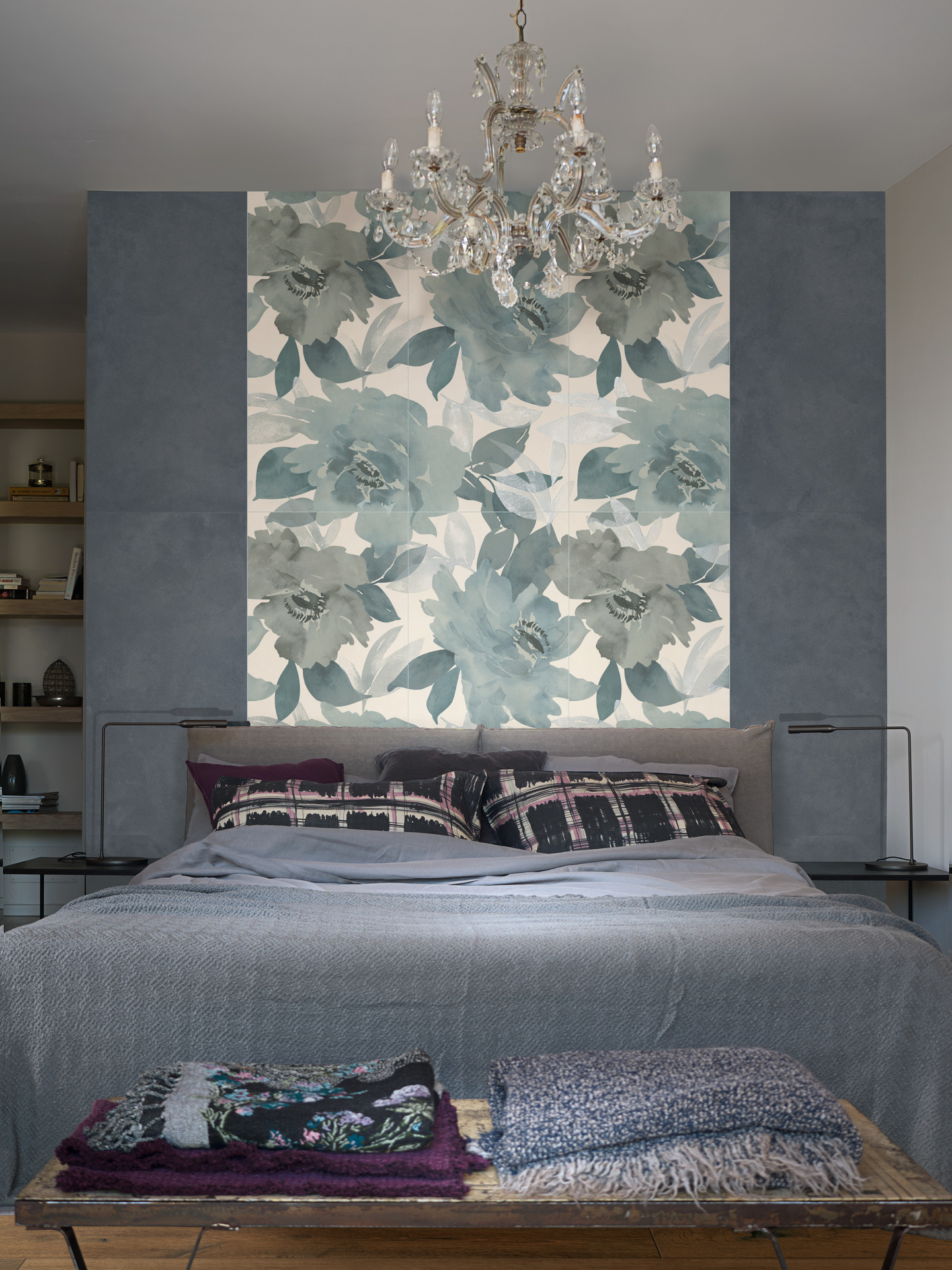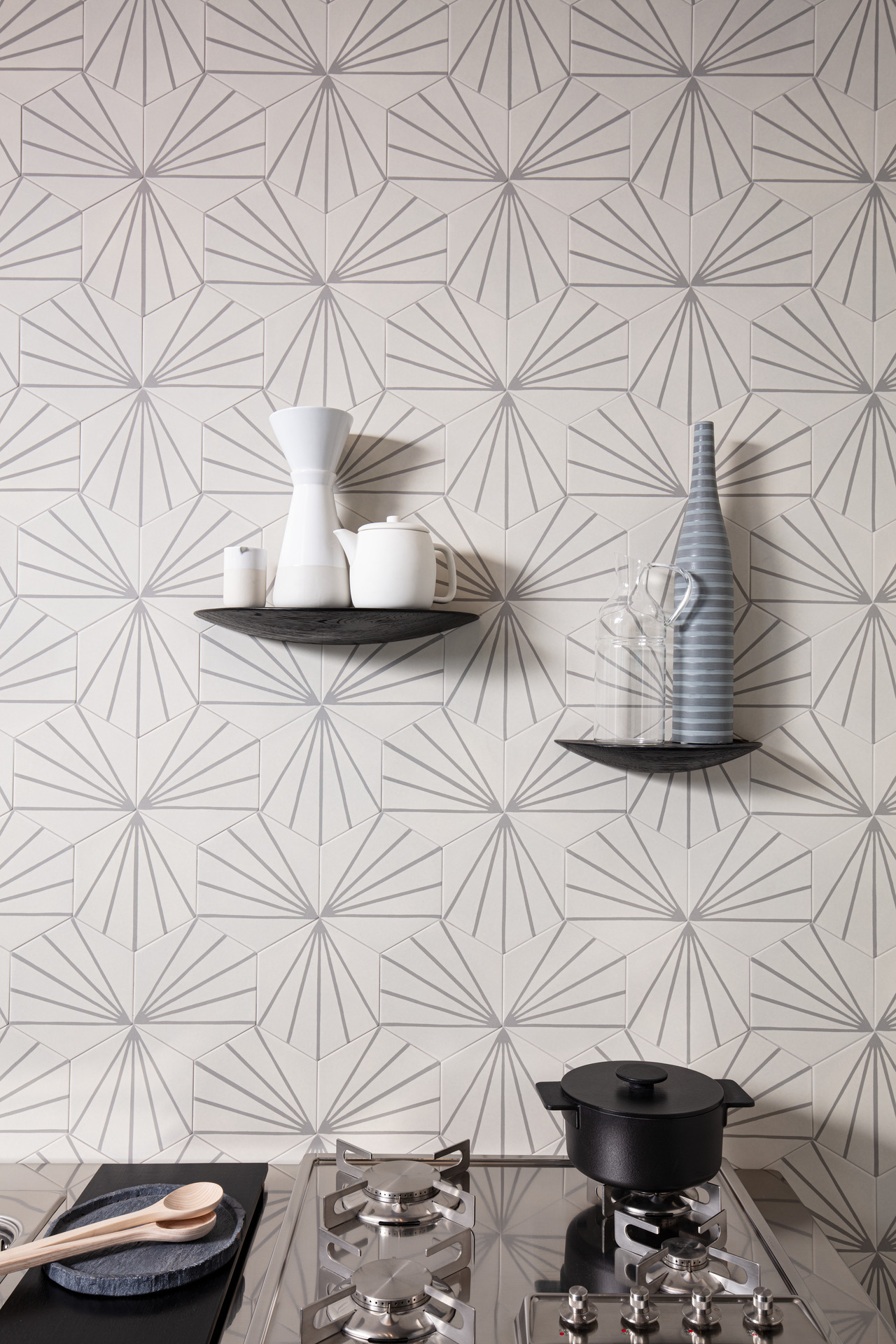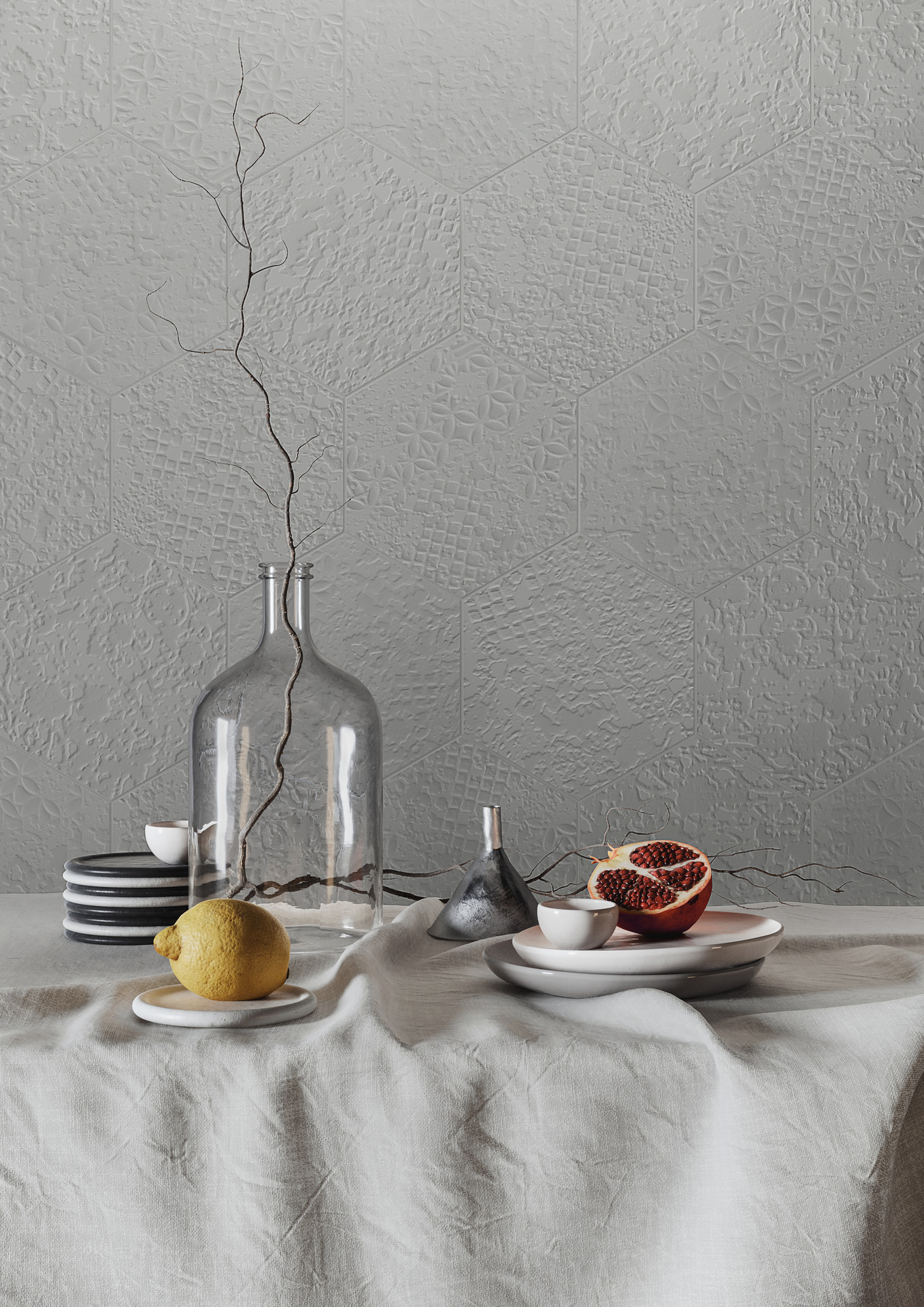 The colour range, consisting of 8 different shades, is fresh and balanced between monochrome hues of blue, green and red juxtaposed with neutral tones of grey and beige; the graphic designs of the hexagon size and the botanical and oriental-inspired patterns with foliage, 3D structures and mosaics immerse you in an exclusive living atmosphere.