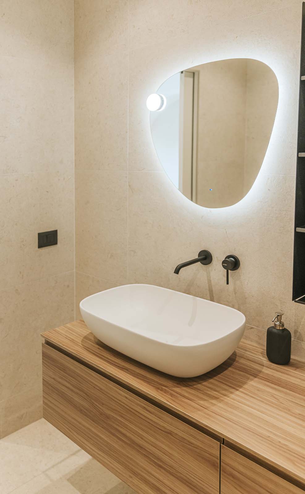 In the bathroom, the Eterna stone-effect stoneware also extends to the walls, creating an inviting ambience of pure elegance. The black details of the furnishings and finishes underline the overall harmony of the interior, which is elegant yet welcoming.