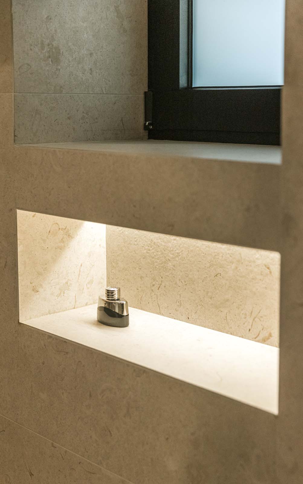 The Eterna collection, adopted in sizes 60×60 cm for the floors throughout the house and 60×120 cm for the bathroom walls, was selected to create an elegant graduated color scheme that runs from the white plaster to the black furniture, by way of a rich assortment of neutral and natural shades.