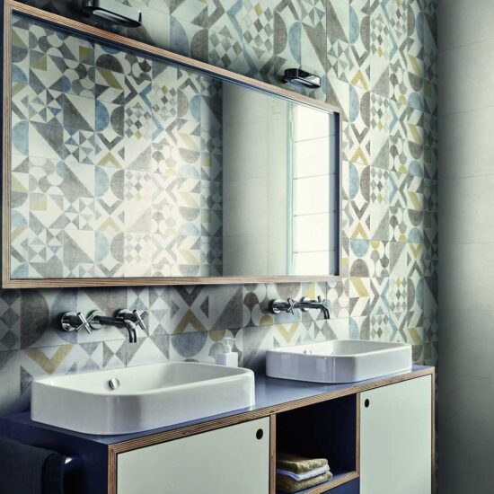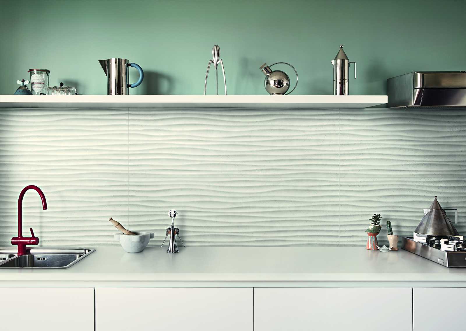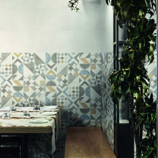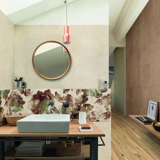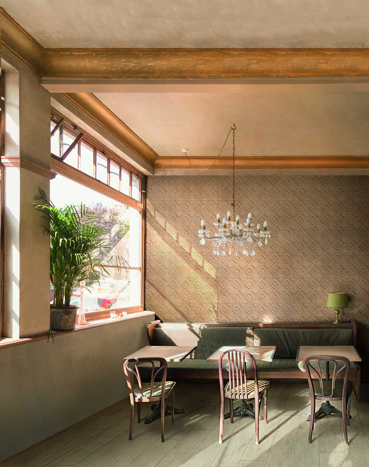 The Arena and Class three-dimensional structures express the earthy granular consistency of crushed brick, the former apparently raked into ridges and the latter featuring hexagonal patterning. Caleido, Opera and Botanico, on the other hand, reflect the surface's response to the passage of time, as the ornamental motifs, including fashionable geometrical and floral patterns, are veiled by a light patina.