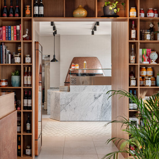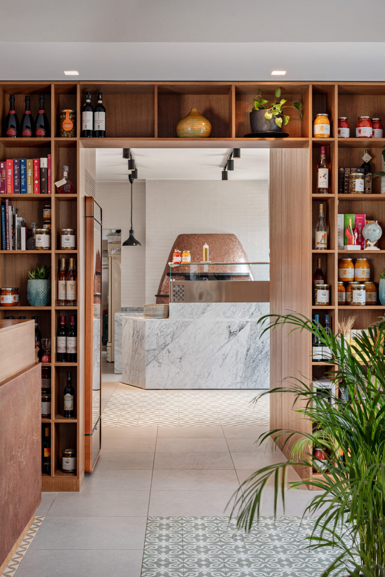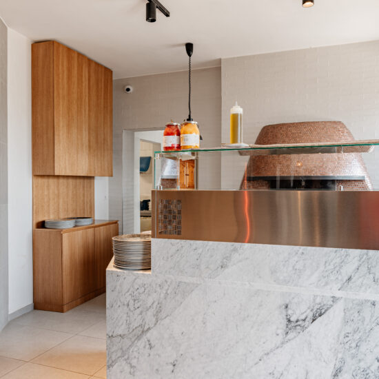 On the right of the entrance is the pizzeria area, a simple, uncluttered interior dominated by the pizza counter, entirely covered with white Carrara marble, which protects the oven. The floor covering chosen here is Tappeto 10 in a neutral color to give the interior unity and elegance.