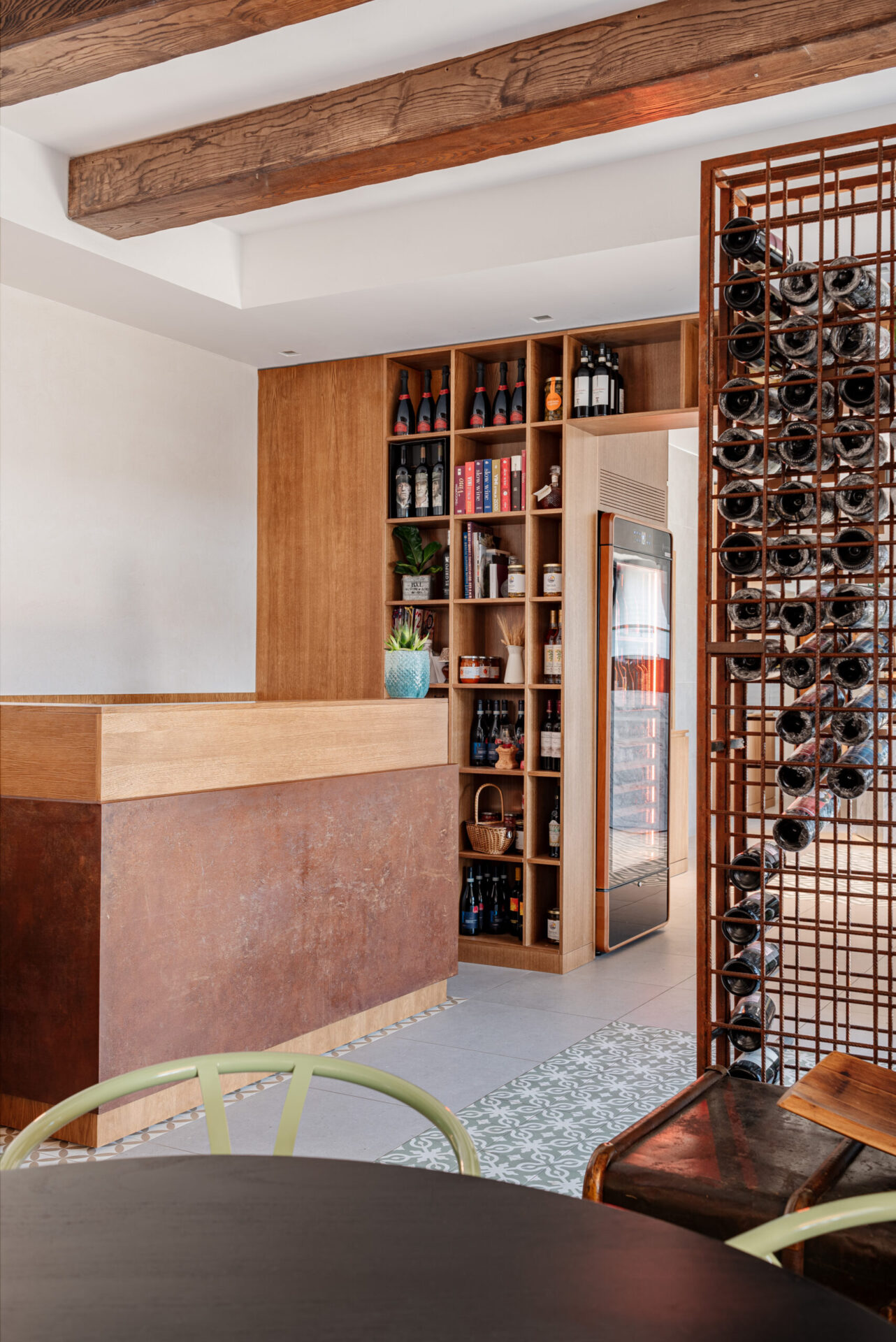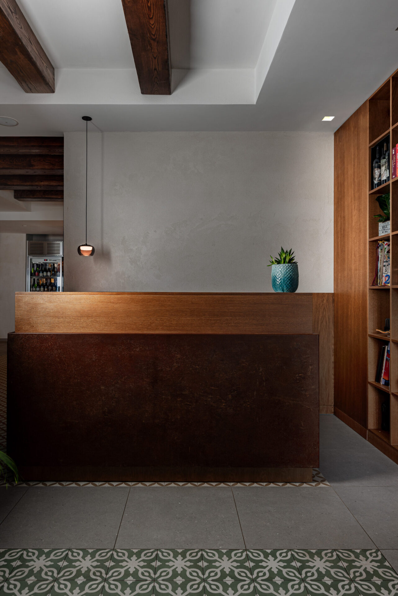 The entrance zone is finished with Contrasti Tappeto 9 in Celadon color, which leads guests to the reception/cash desk area with a wood and Corten steel counter standing on another, different floor covering in a geometrical pattern in shades of beige: Tappeto 4, also from the Contrasti collection.