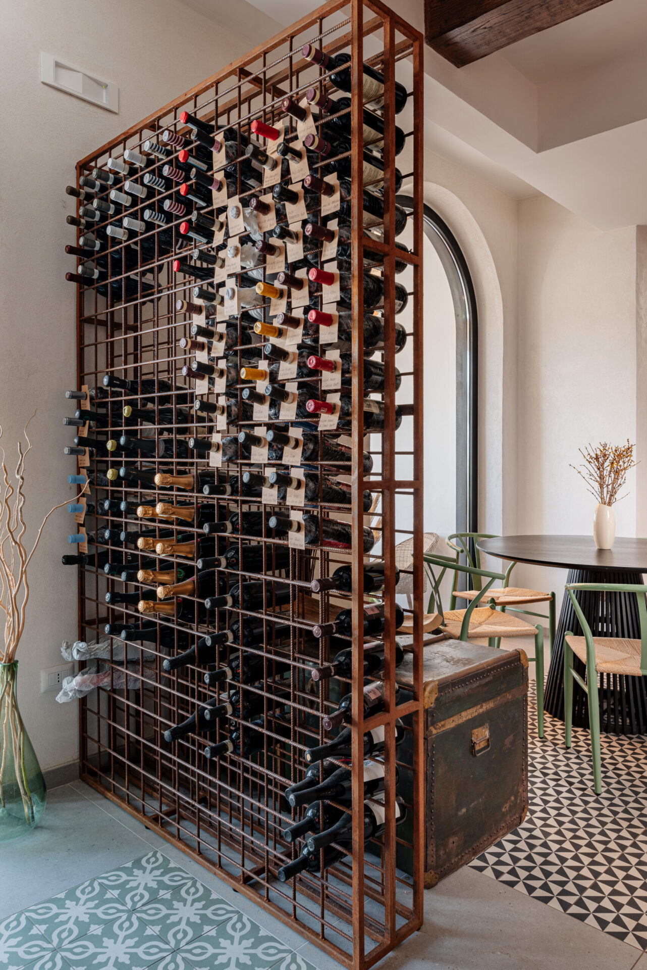 To the left of the entrance, the locale expands into the hospitality zone, also designed to accommodate meetings and interviews: it is therefore furnished with a round table and a partition consisting of an industrial-style bottle rack to screen it from the entrance. The floor in this area is in Contrasti Tappeto 8, with a very contemporary look thanks to its pattern of small black and white triangles.