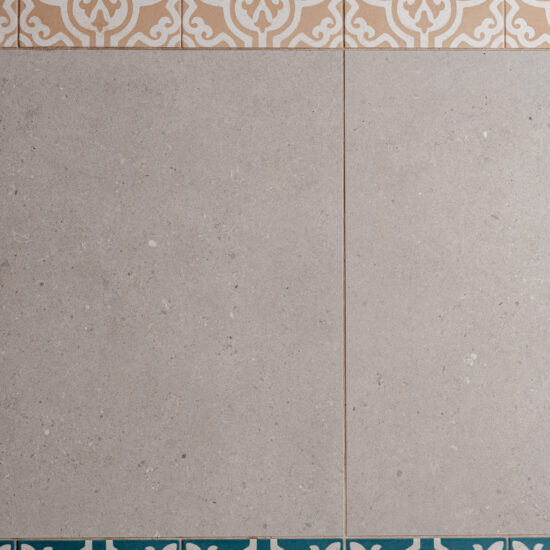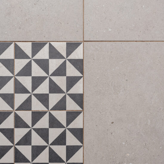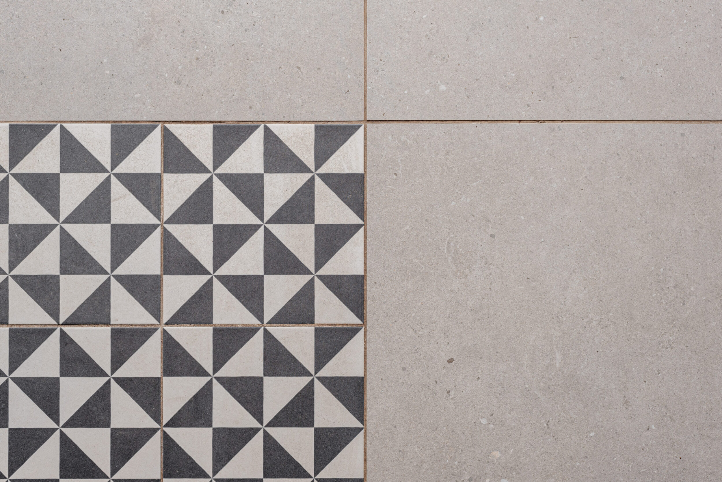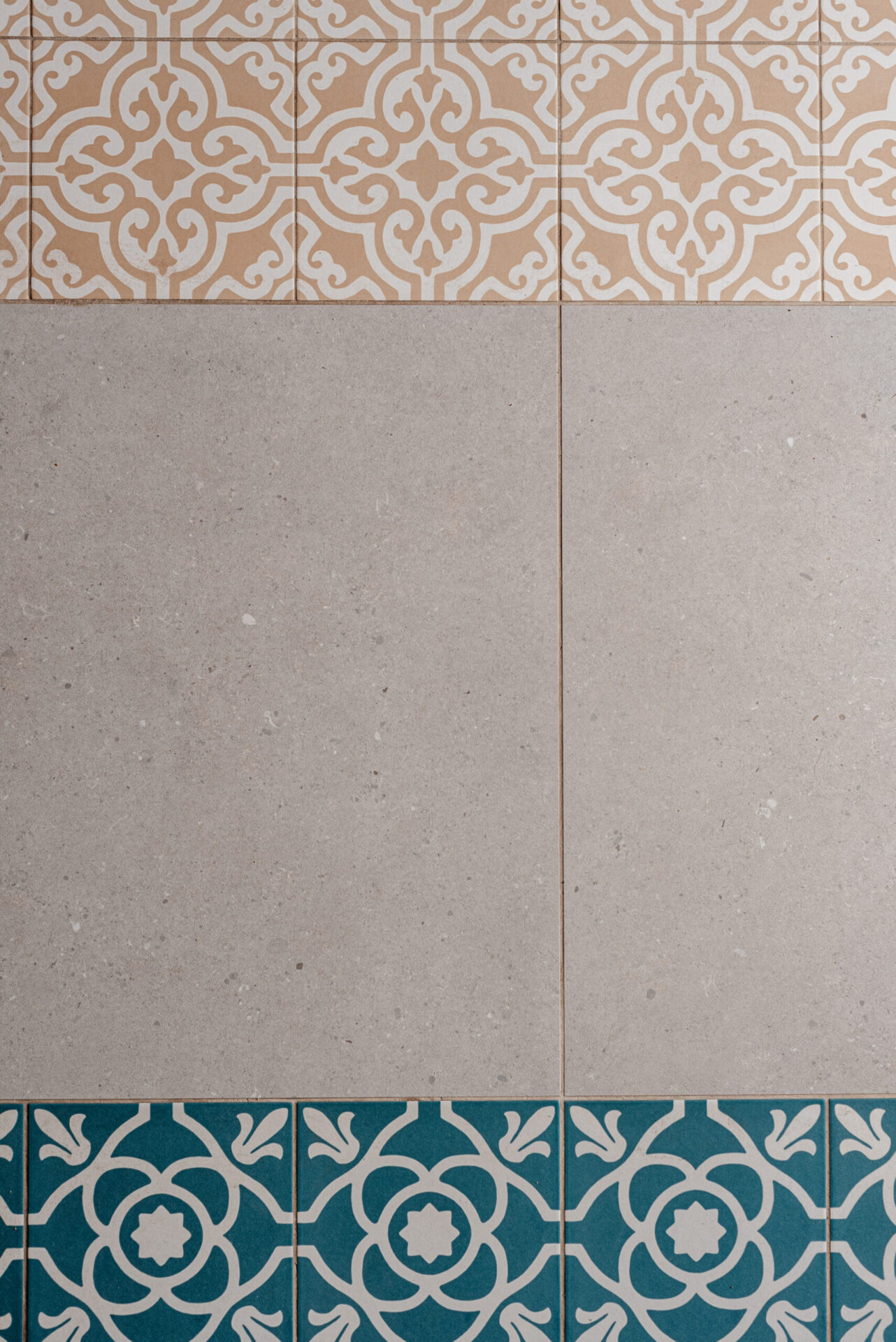 Existing grey porcelain stoneware slabs are interrupted by inserts of 20×20 tiles from the Contrasti collection, in different patterns and colors to define the various areas.