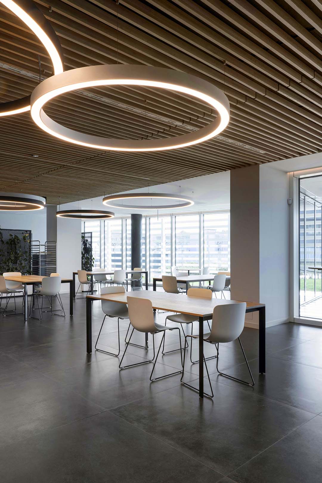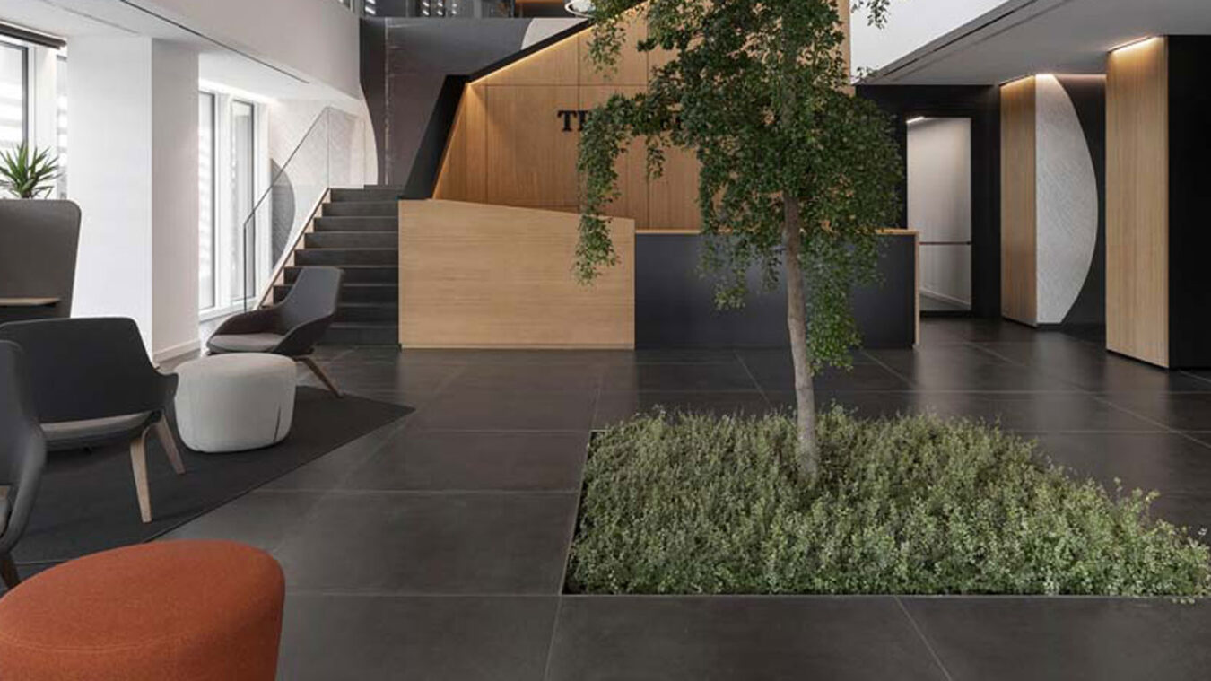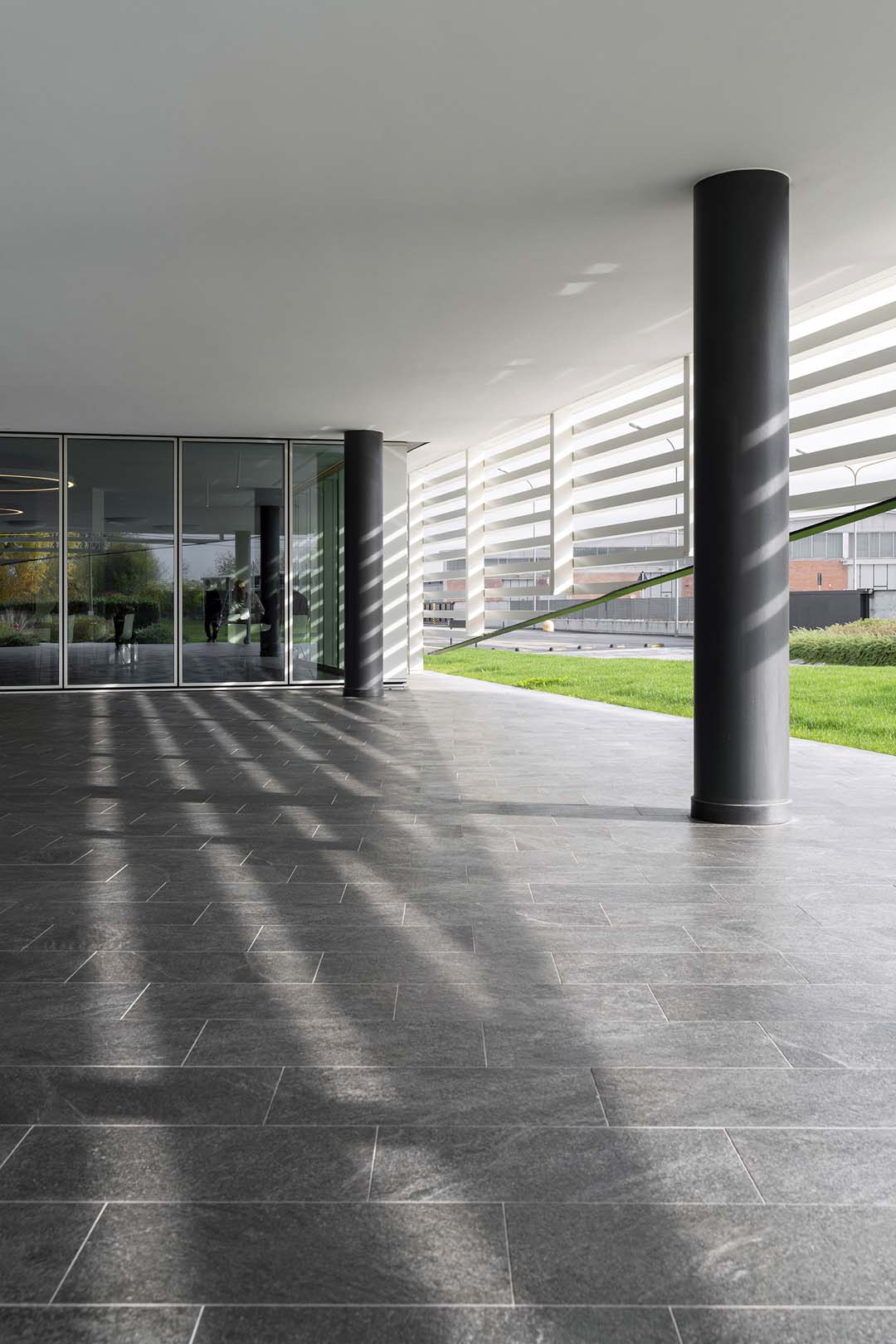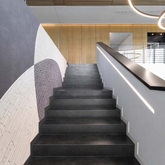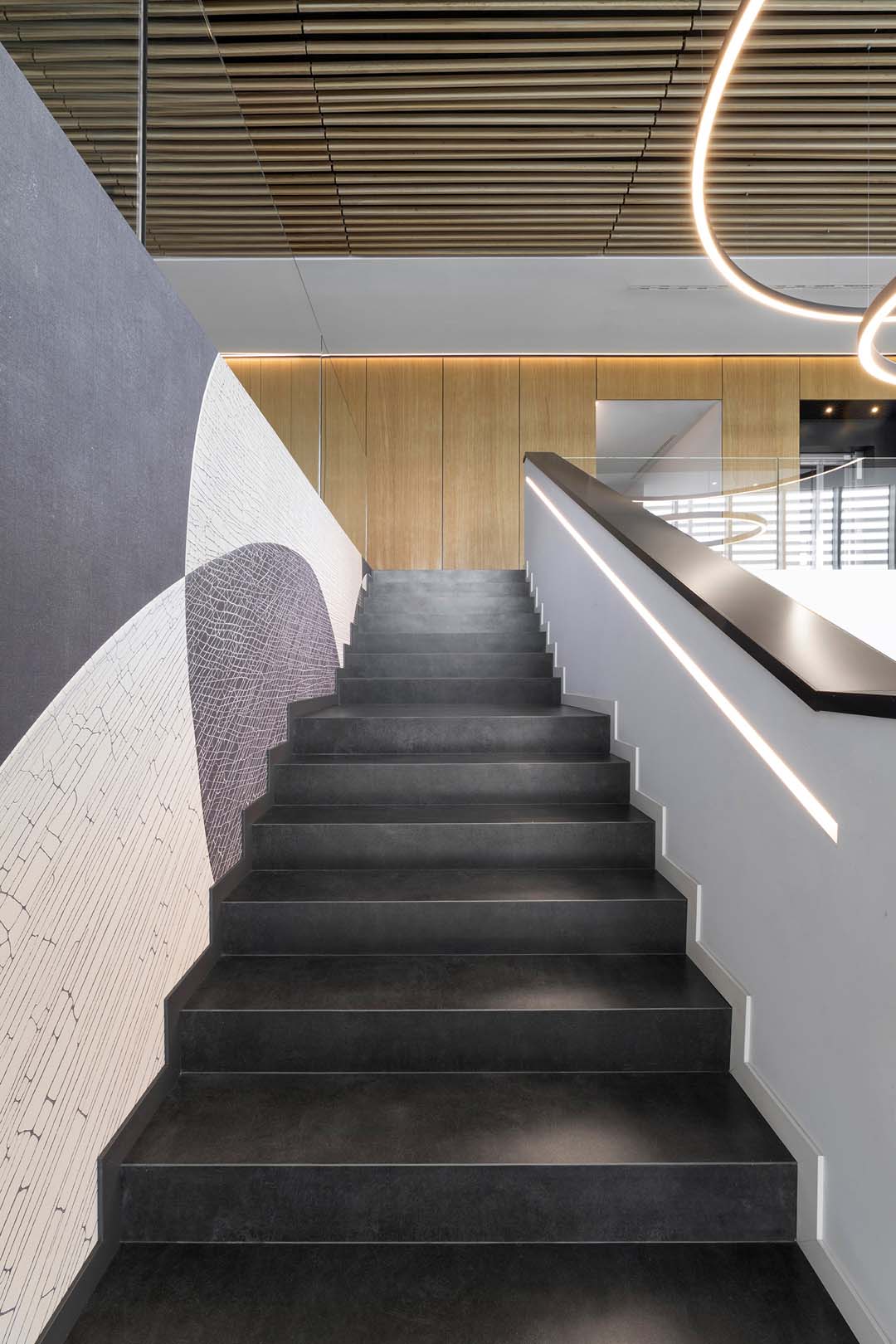 The offices’ internal layout is conceived to make the areas between the various sectors more comfortable and interactive, encouraging communication between them and, above all, the people who work in them. The materials chosen by the architects for the various interior areas followed the same principle, especially with regard to the porcelain stoneware ceramic surfaces, where Ragno products played a key role.