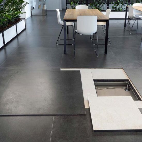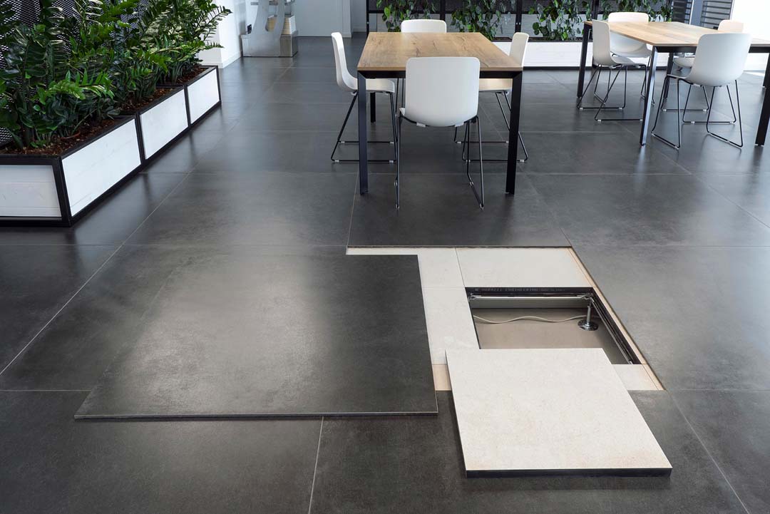 The self-laying raised floors were constructed using the Patina Petrolio collection in the large 120×120 size, with a waxy appearance evoking the color of dark grey metal with iridescent glints.