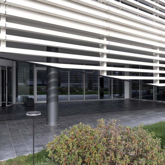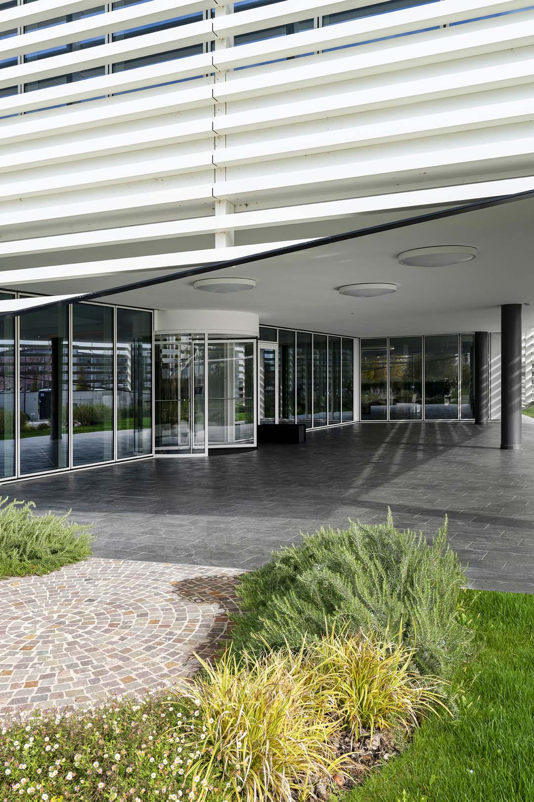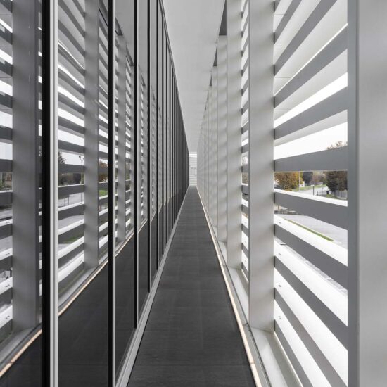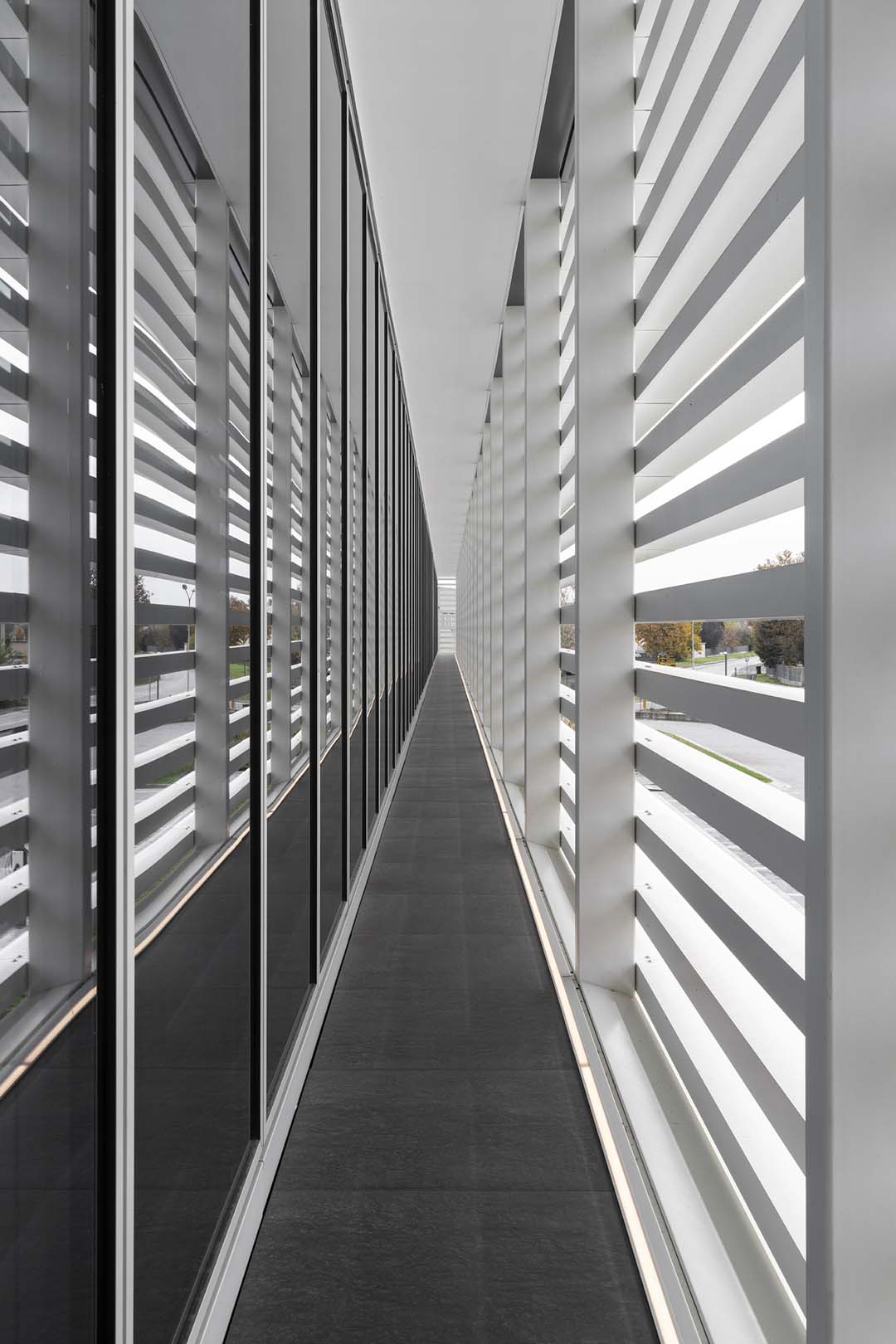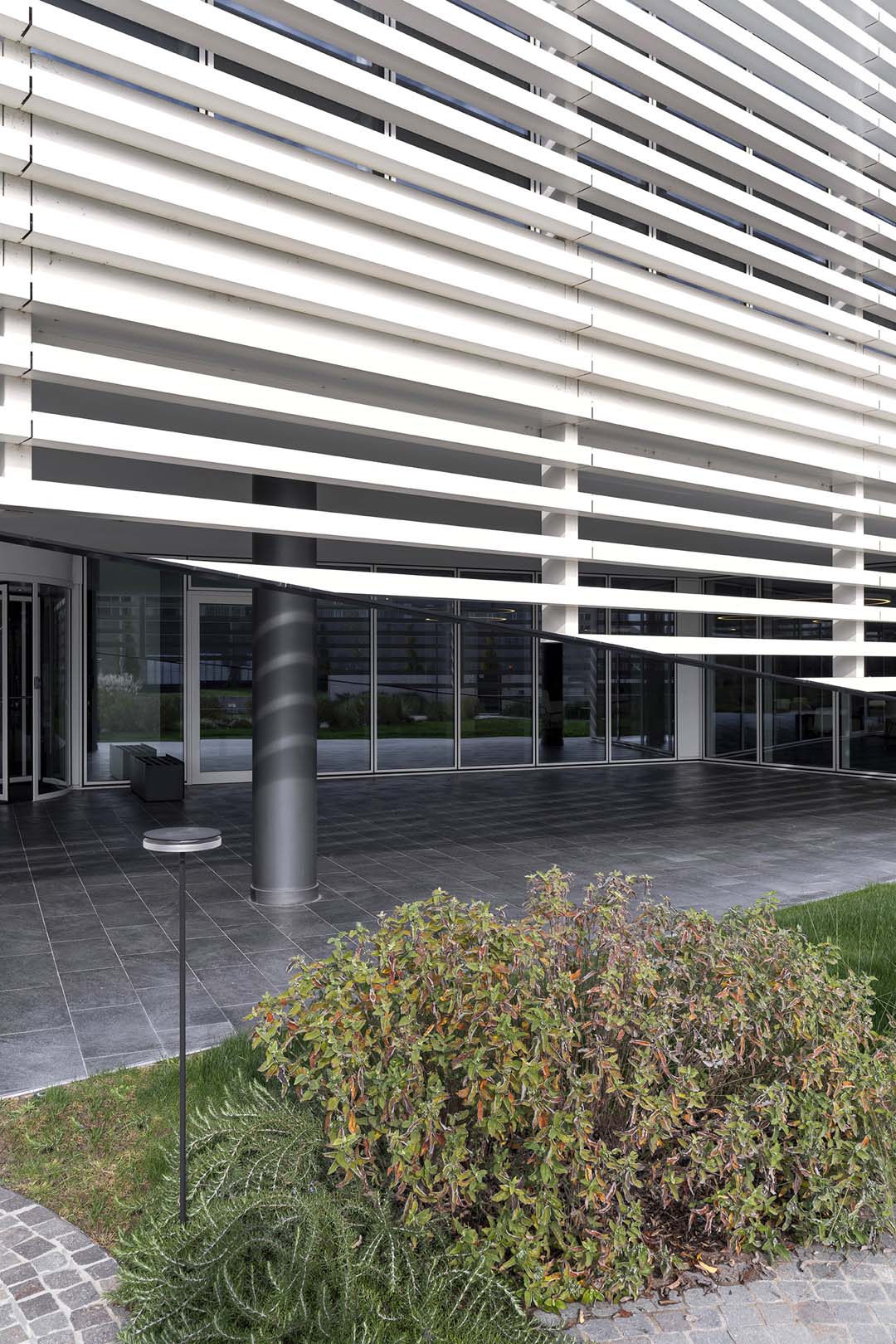 What was originally a ‘90s office building constructed with prefabricated elements and concrete filler panels has now been transformed into a modern facility with a facade of white aluminium bars which also serve as a screen against the sun.