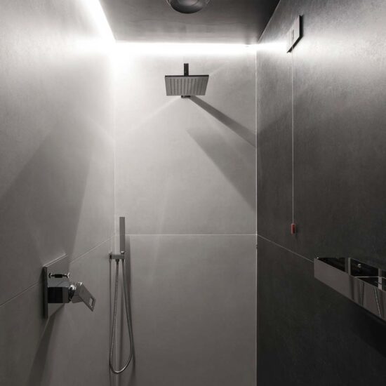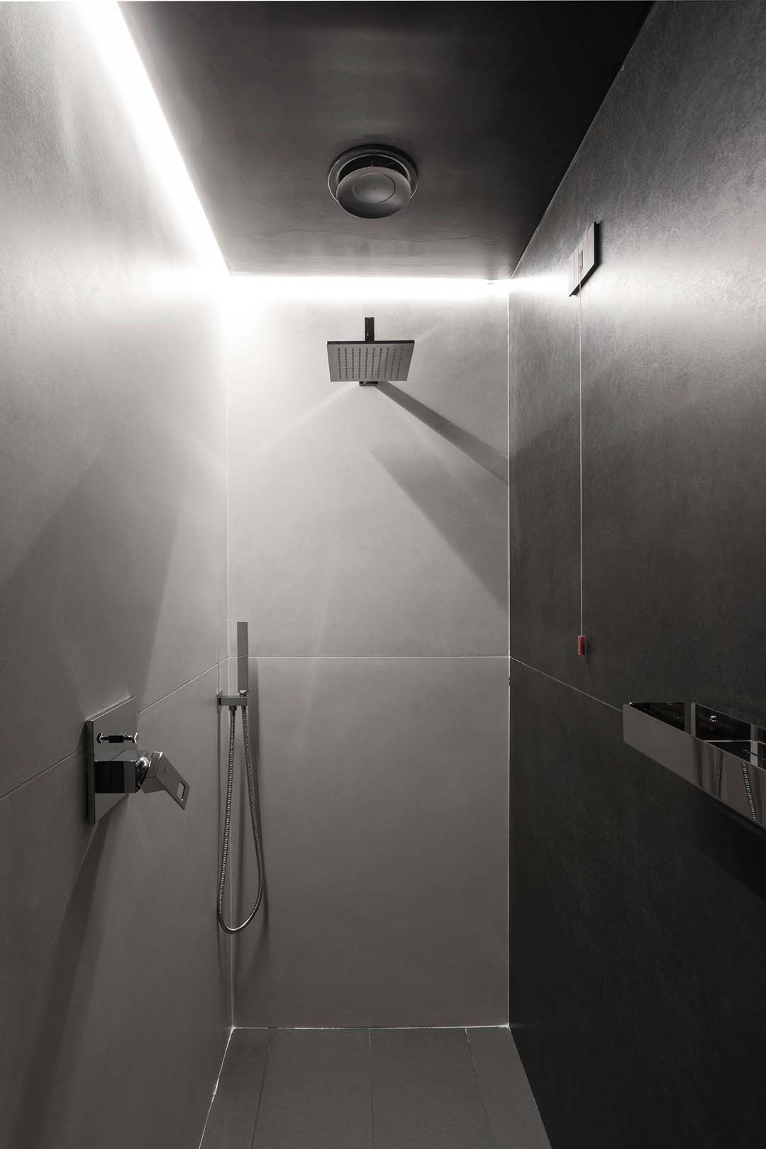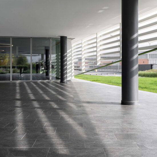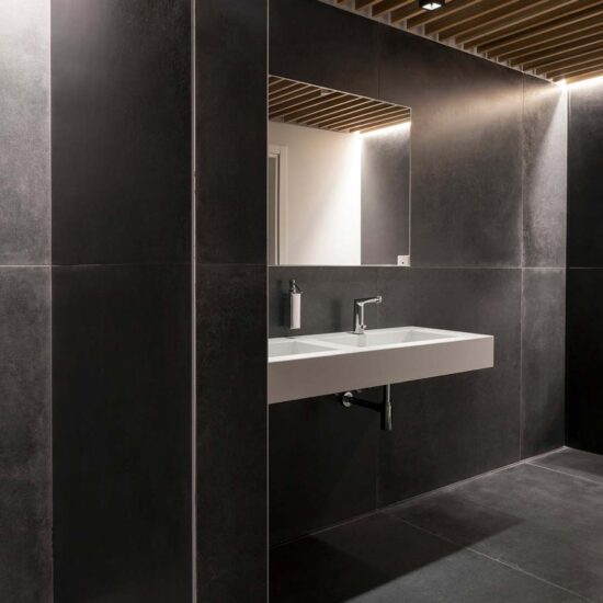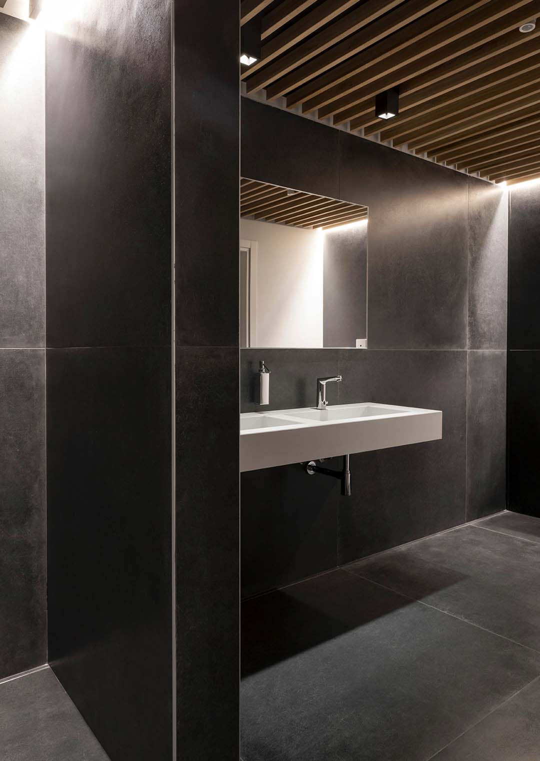 The Patina Cera large slabs in pale grey color and 120×120 size were chosen for the wall coverings of the toilets, while Patina Petrolio was selected for the walls of the stairway, with 75×150 tiles with 45° bevel cuts to highlight their profile. The interface between the building’s internal walls and external facade was covered with Ragno Patina Petrolio XT20 collection slabs in the square 80×80 size, once again a metal effect in dark grey color.