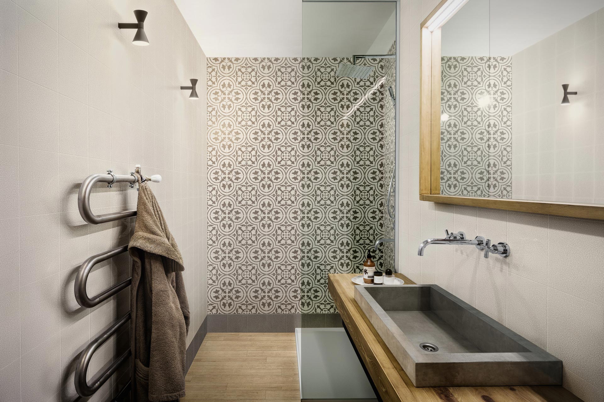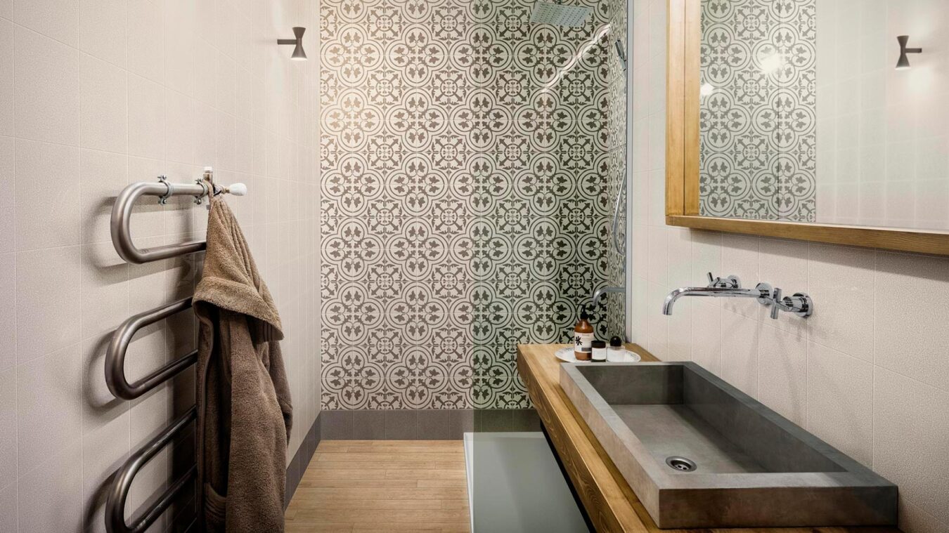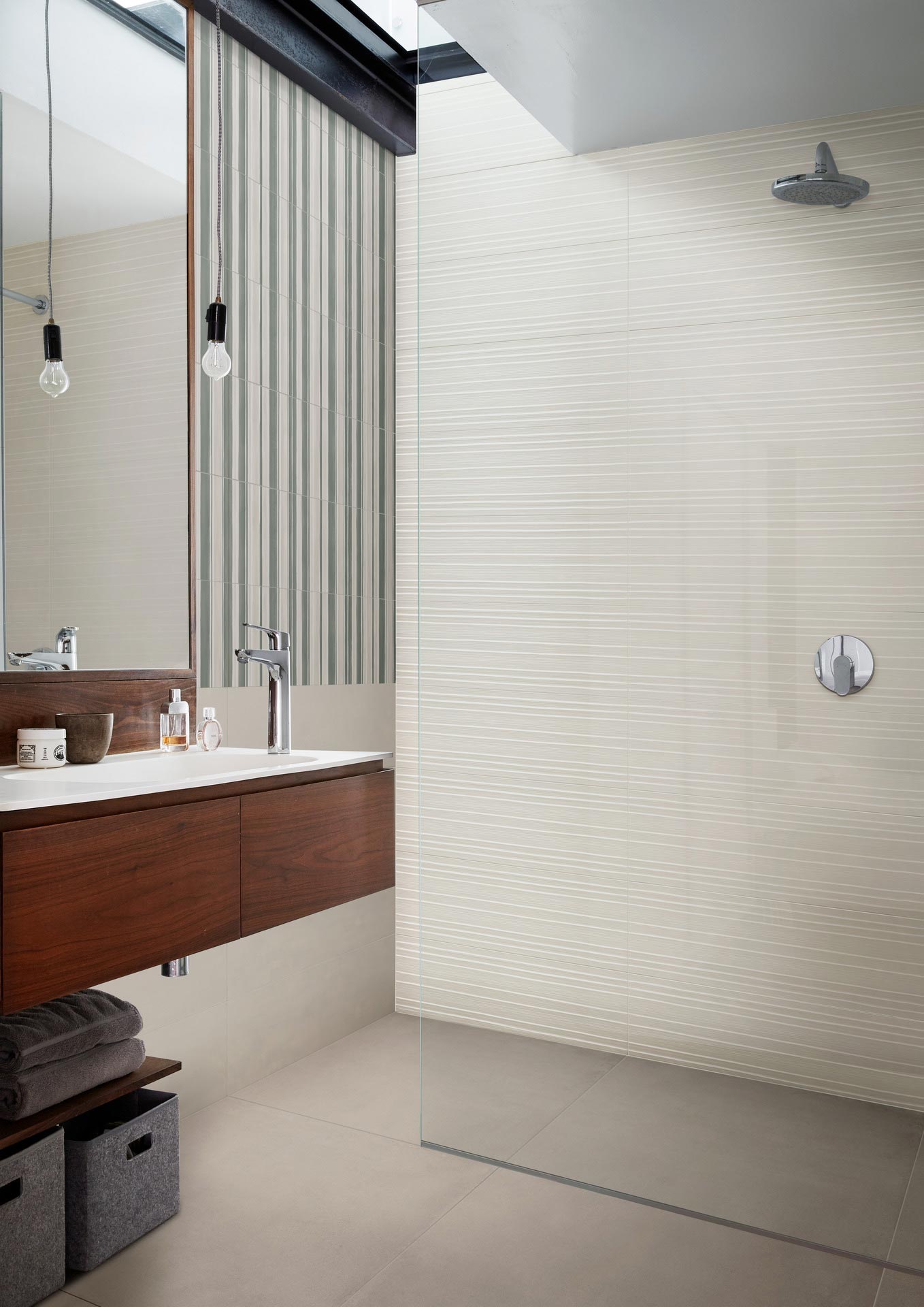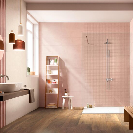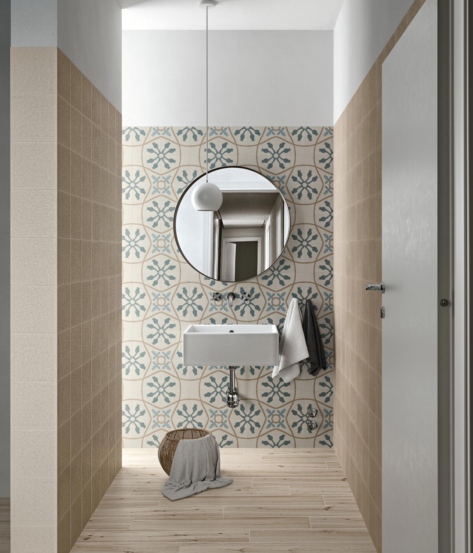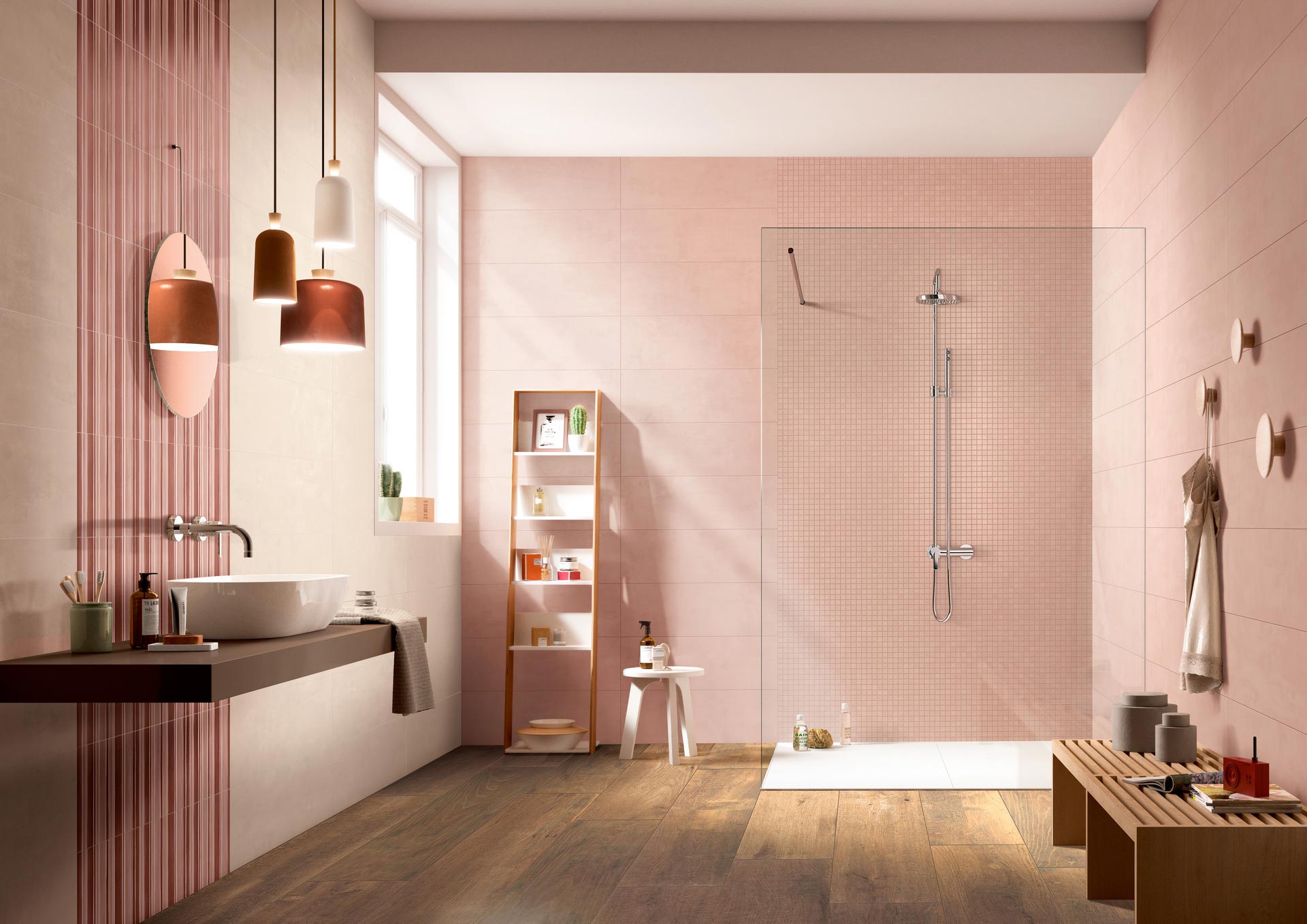 Using bold colours, with textured, shiny surfaces, is an excellent way to furnish restricted spaces. Green, blue and pink pastels are a fashionable choice, combined with more neutral tones like greige; as for the floor and shower cabinet, try using decorative carpets and contrasting textures as a backdrop. The sanitary fixtures can also be colourful, either matching or contrasting with the walls.