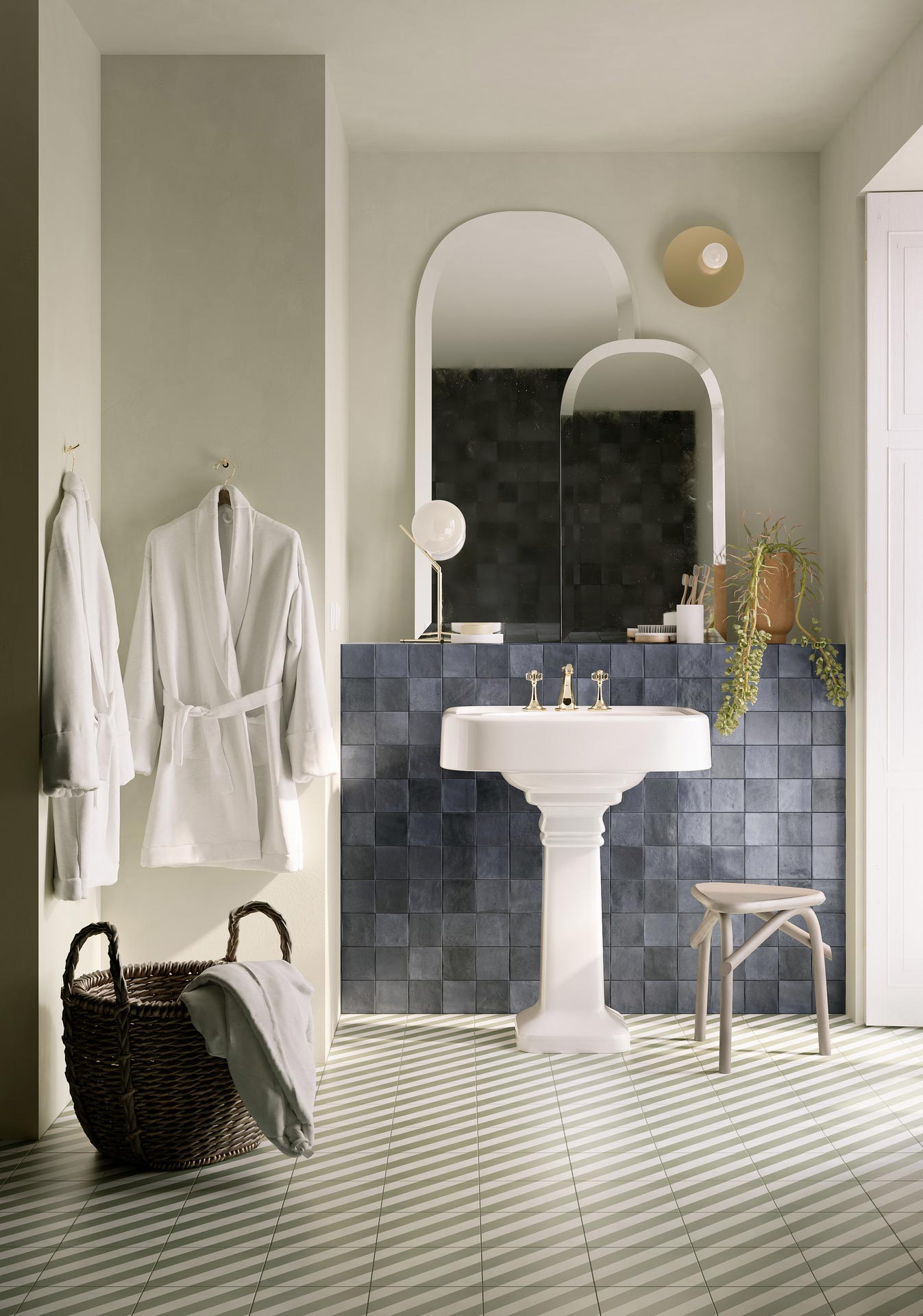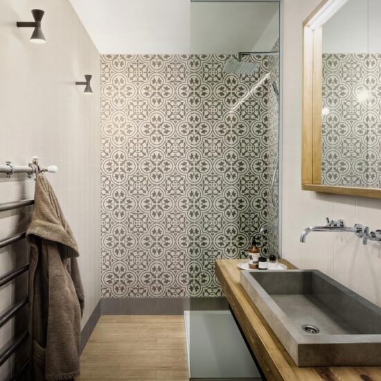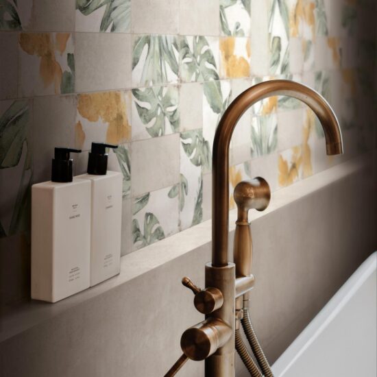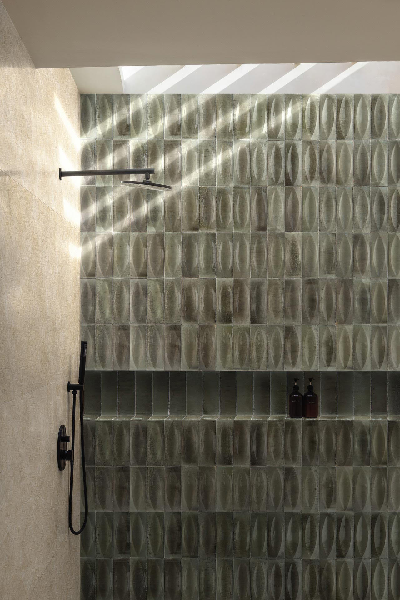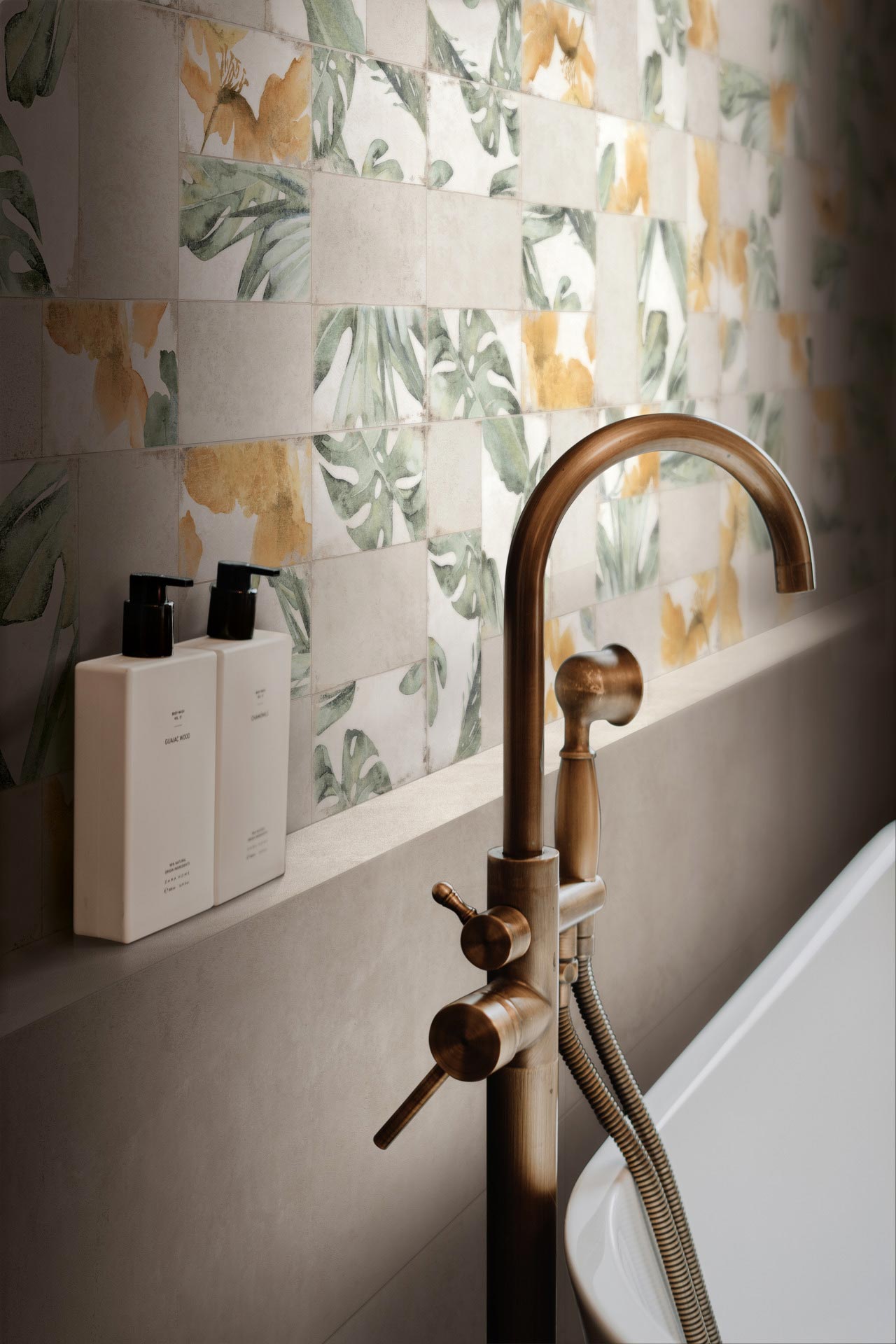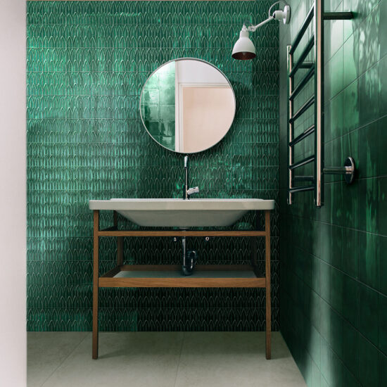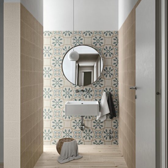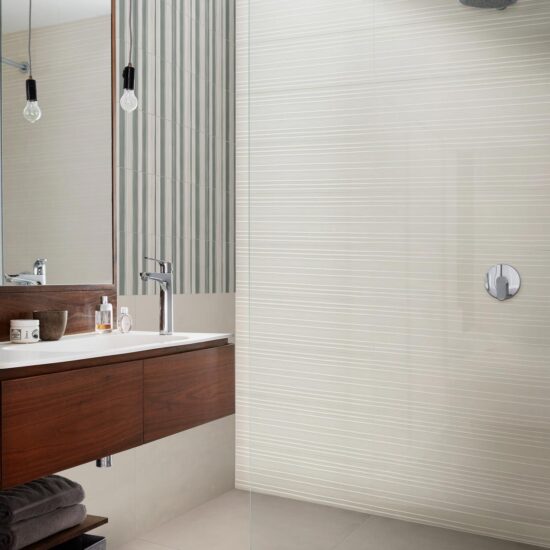 Using bold colours, with textured, shiny surfaces, is an excellent way to furnish restricted spaces. Green, blue and pink pastels are a fashionable choice, combined with more neutral tones like greige; as for the floor and shower cabinet, try using decorative carpets and contrasting textures as a backdrop. The sanitary fixtures can also be colourful, either matching or contrasting with the walls.