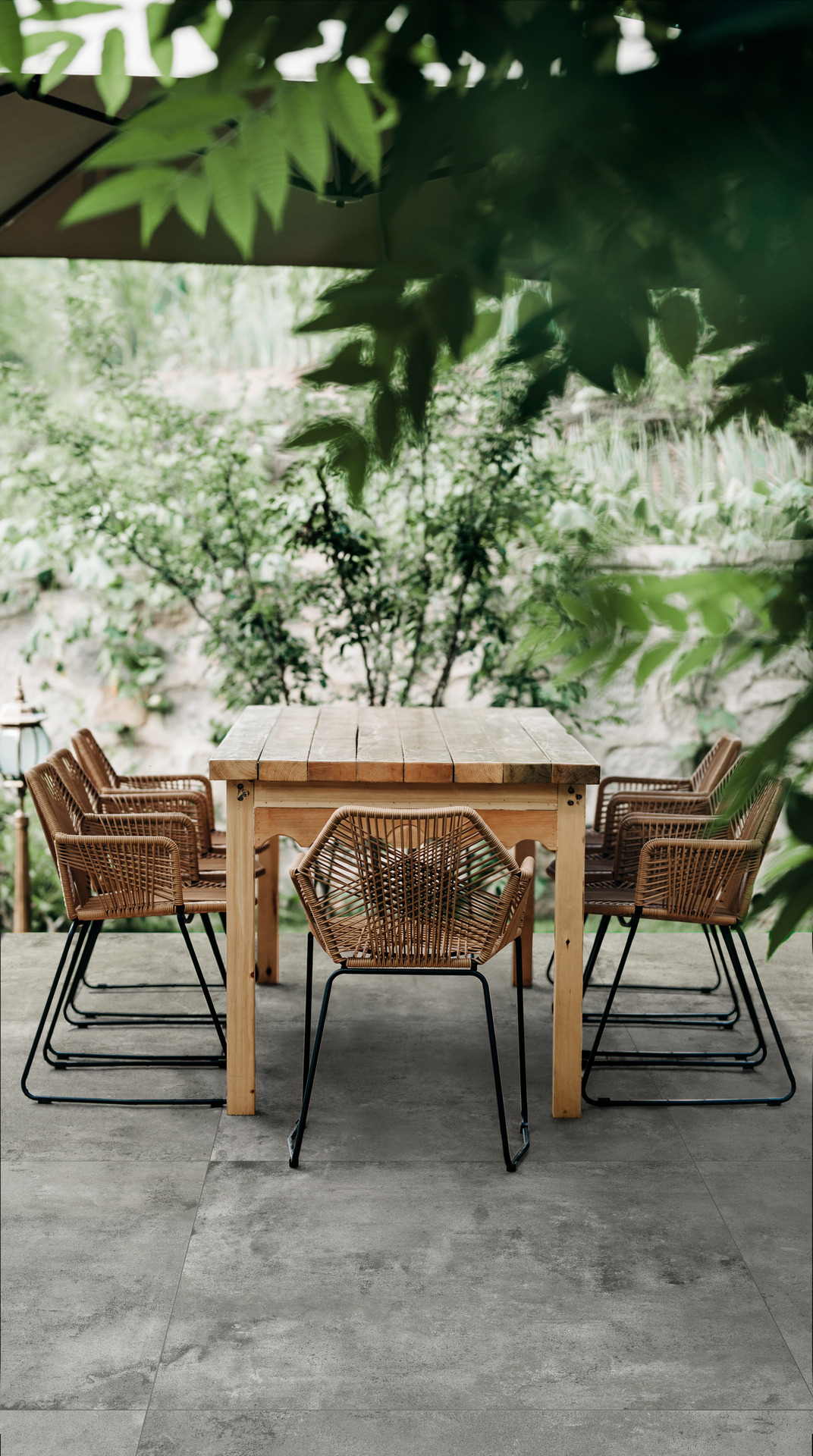 Outdoor porcelain stoneware is invaluable for defining these functional zones: it can be used to pave the dining or relaxation area, leaving the rest of the garden under grass, or to create a raised platform that highlights the lounge area. With its continuous surfaces and stone, concrete or wood-effect textures, you can draw up matching, unified design schemes for small outdoor spaces, transforming every square metre into a creative opportunity. It’s an excellent strategy if you’re in search of ideas for designing a stylish small garden without any loss of comfort or practicality.