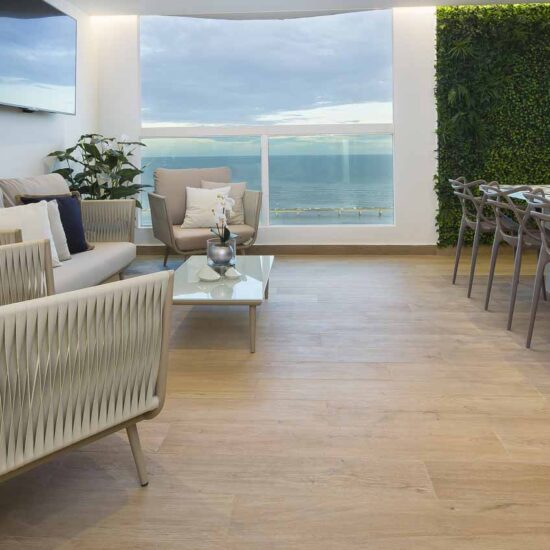 Stone-effect stoneware and wood come together in a meeting of land and sea