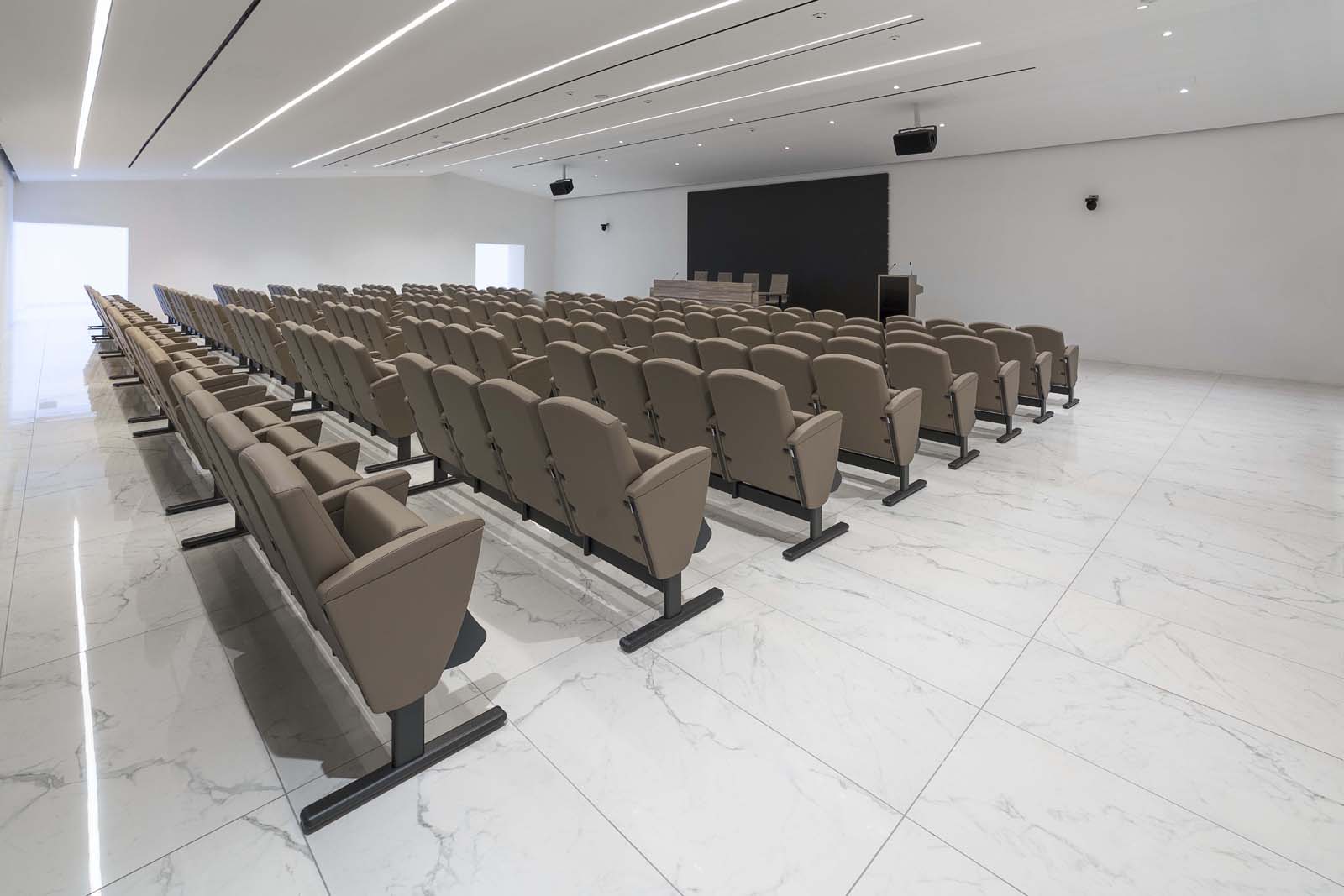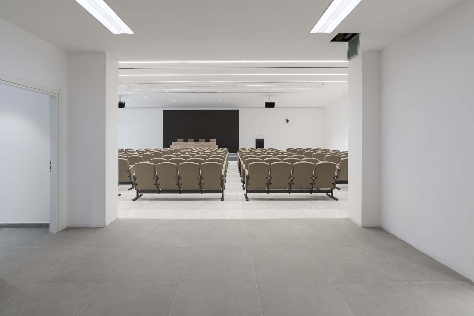 The various Ragno porcelain stoneware collections, chosen for their breadth of range and technical characteristic, alternate in the indoor and outdoor areas, giving the various spaces a distinctive personality. The institutional importance of the lecture rooms was impeccably underlined by the use of Imperiale Statuarietto marble-look large slabs in glossy finish. Similarly, the slightly uneven texture of Stratford in the severe Beige, White and Grey shades in Natural finish proved perfect for the offices and public areas. The glossy 3D effect of the bar counter covered with Glacé Muschio tiles, also with Rayé structure, again in Muschio color (7.5×20 cm), alternating with the warm shade of parquet-look Woodmania Honey (60×120 cm), is particularly eye-catching. This sophistication in the choice of coverings is found throughout the project.