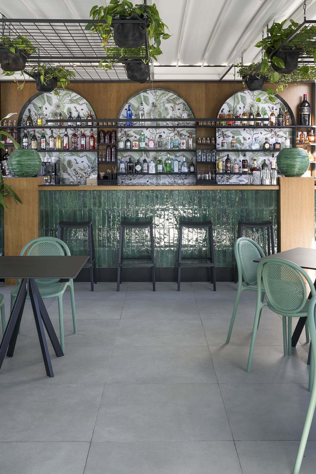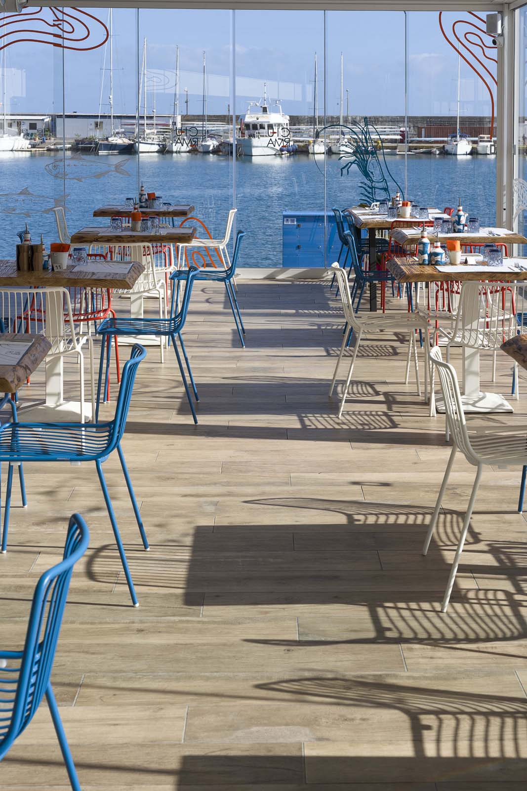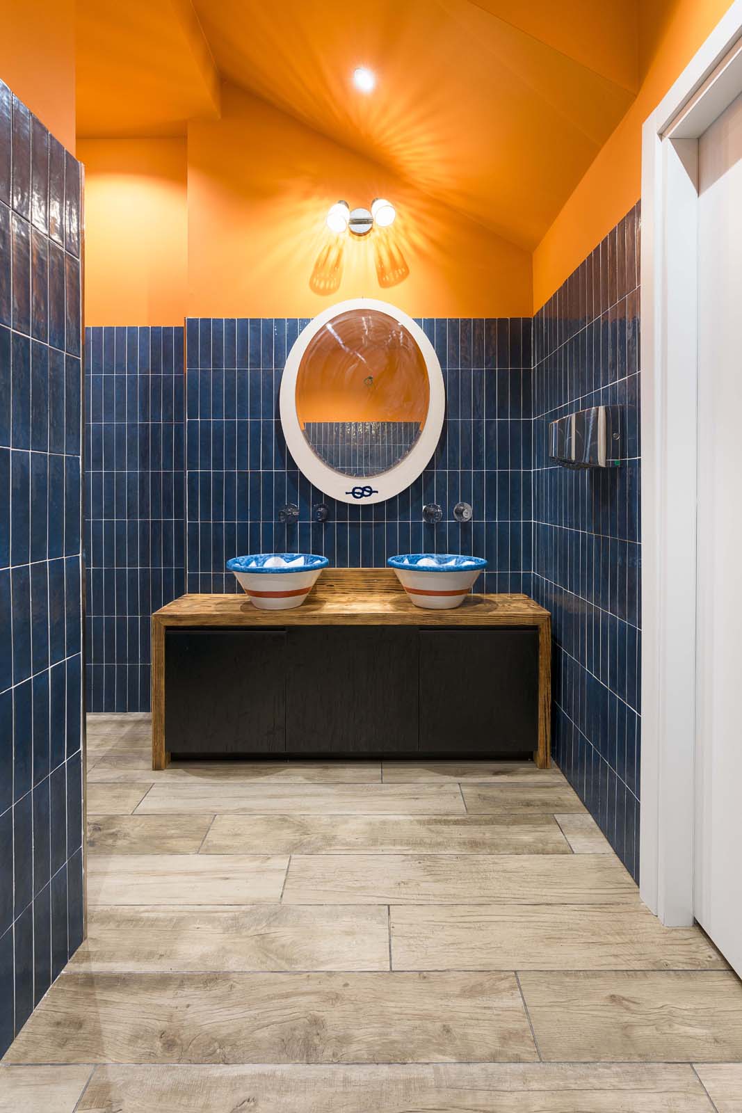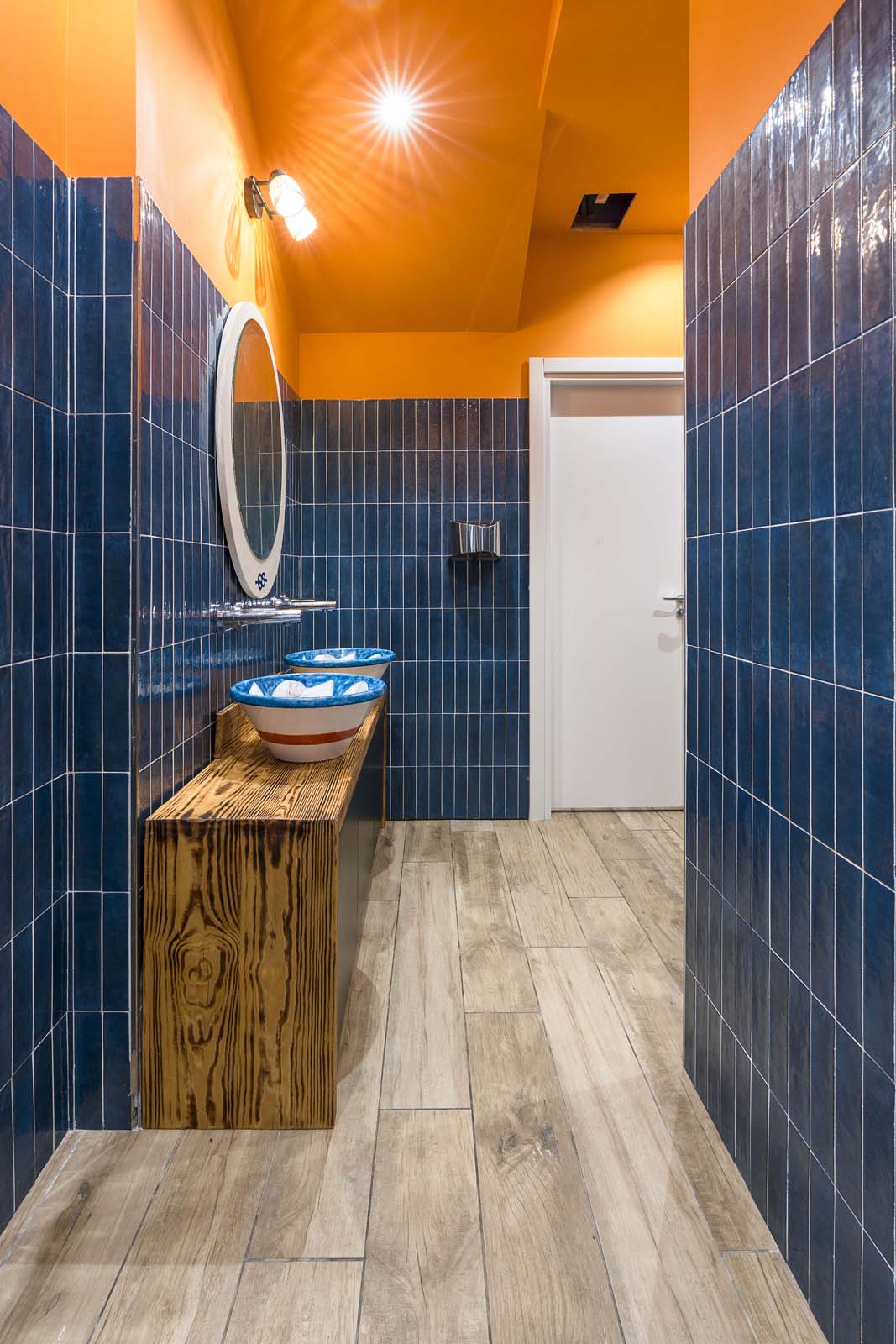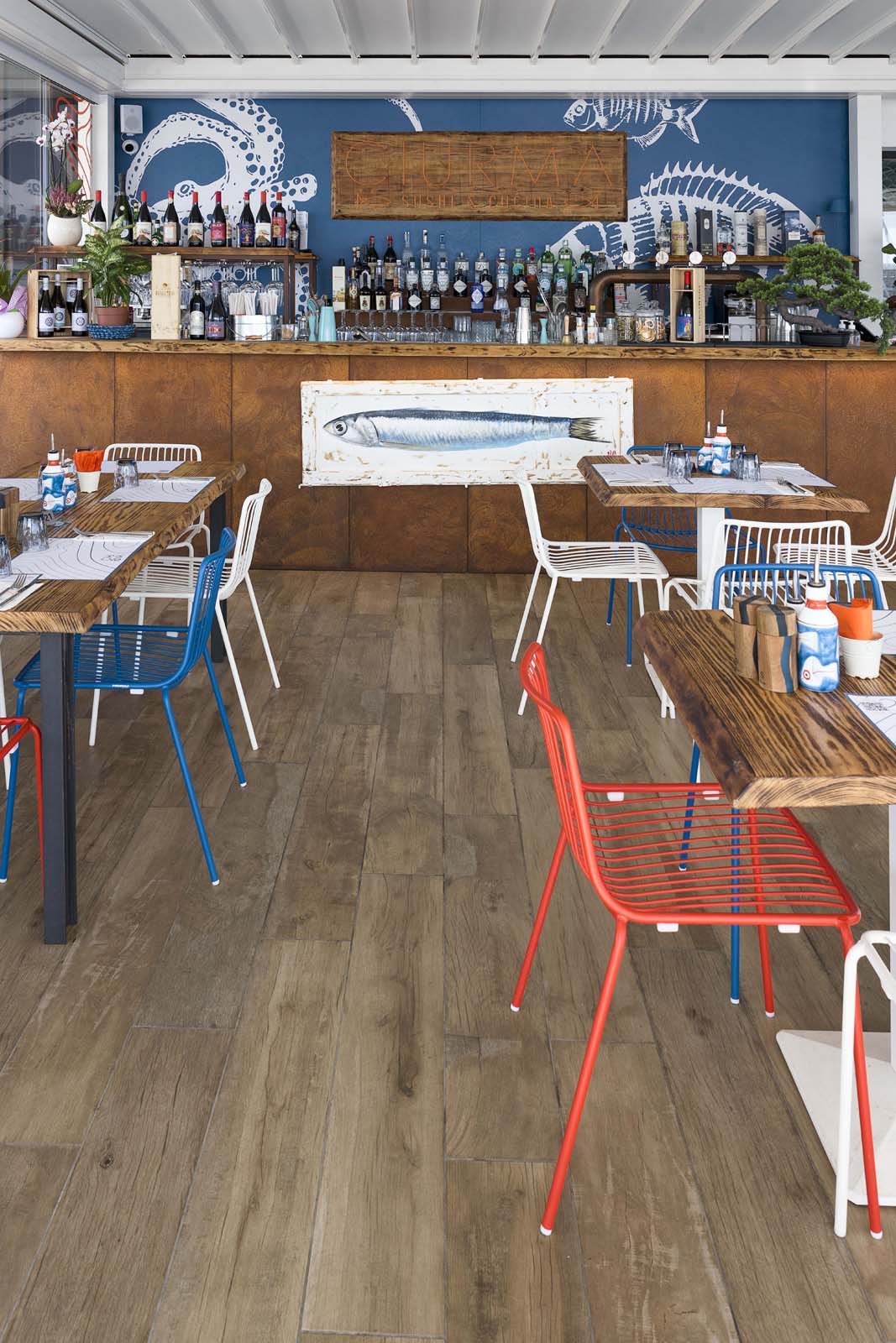 The washrooms are finished with Look tiles in Blu shade in 6×24 cm size; the material’s intentional color flaws on the glossy surface evoke hand-craftsmanship for contemporary taste. The same Look collection appears on the bar counter of the veranda restaurant overlooking the sea, but this time in the warmer Oliva color.