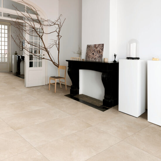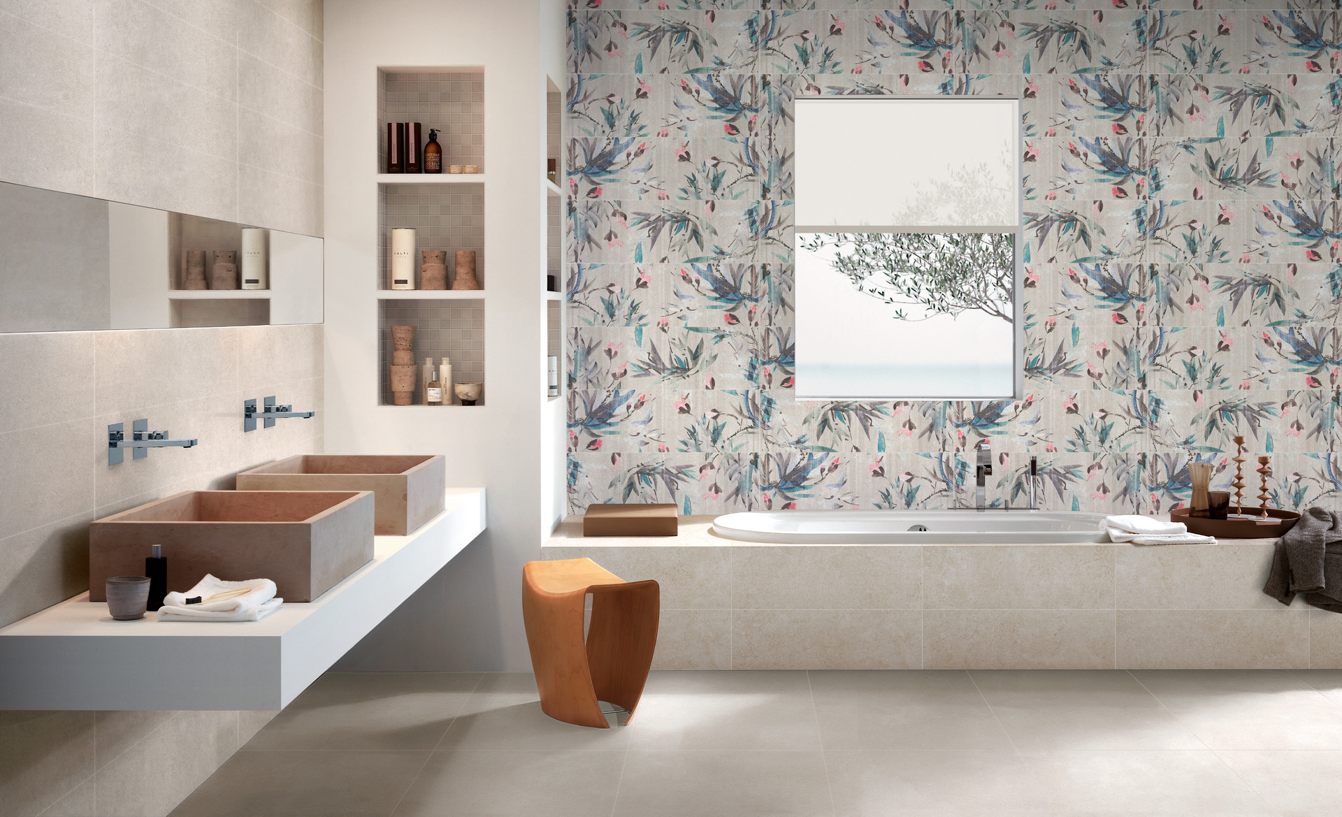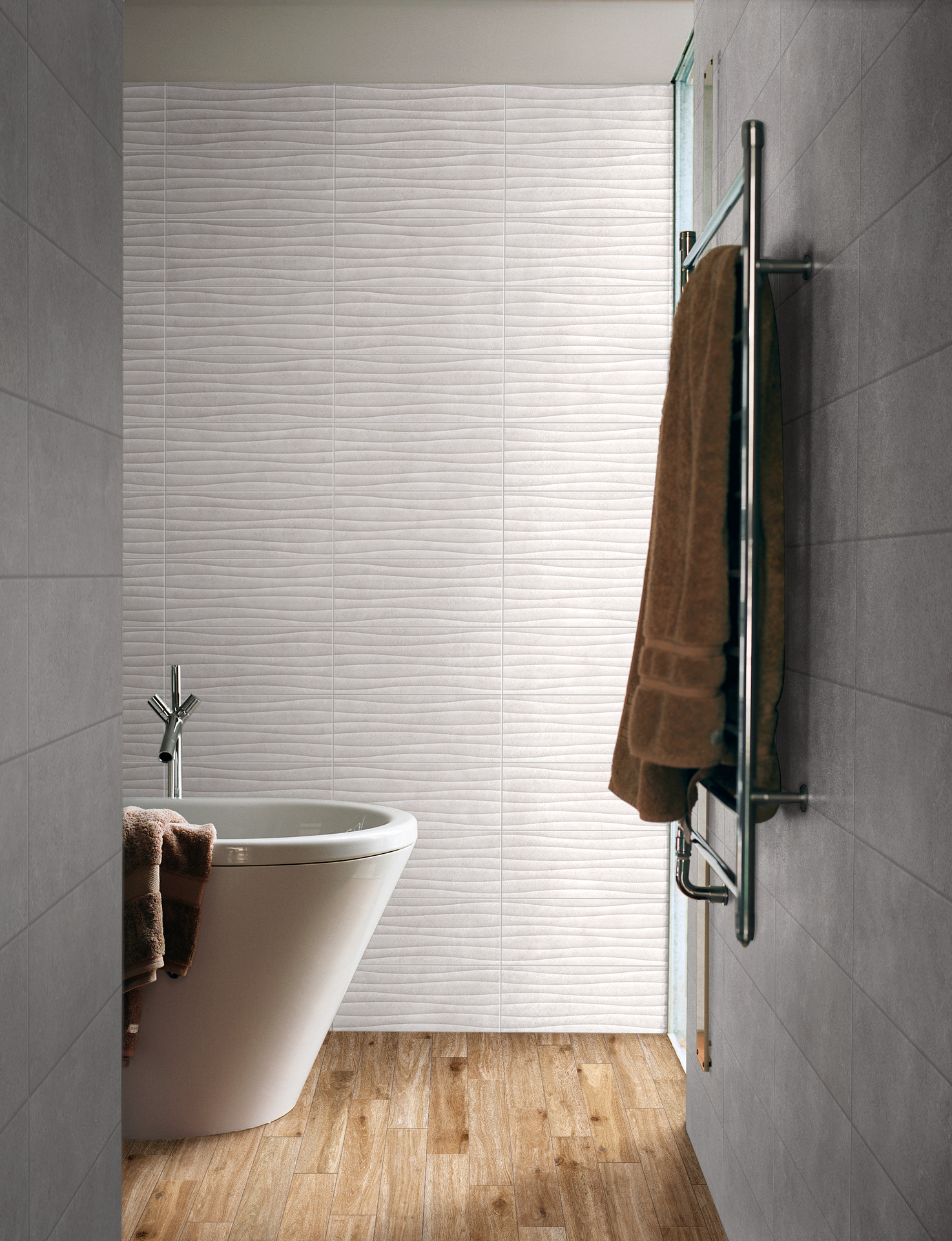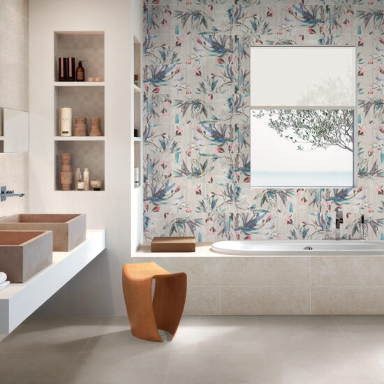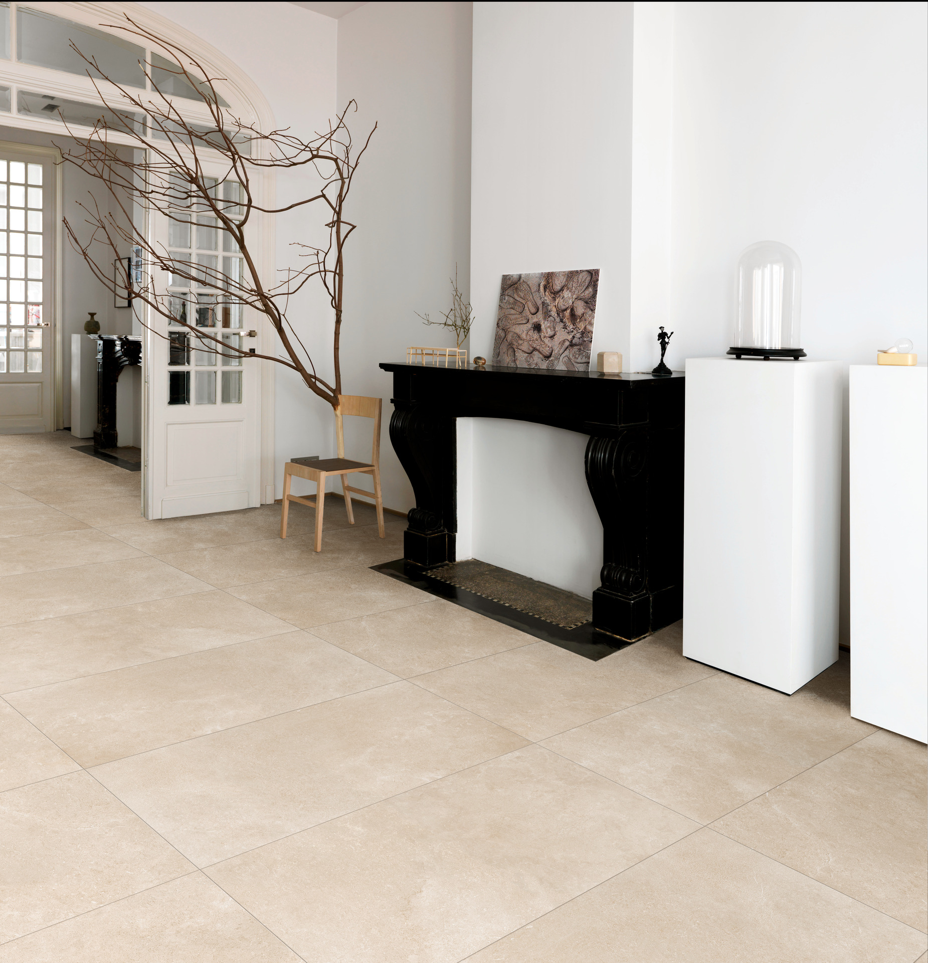 The monocalibre rectified porcelain stoneware tiles in the collection feature light, exquisite veining reminiscent of very ancient, timeless limestone. The neutral palette – ranging from white to grey and anthracite for the cold tones and from ivory to beige for the warm shades – redefines an informal, delicate style for a product with enduring appeal.
