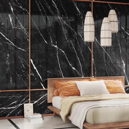 A glimpse of a private room can be seen from the entrance: it is the bedroom, where Sky Black Glossy in the large 120×278 cm size, installed on the walls, enhances the purity of the forms and the simplicity of the materials and furnishings. The two-color geometrical pattern of the slabs installed on the floor evokes the idea of tatami, defining the home’s interiors with tasteful discretion.