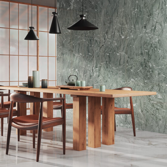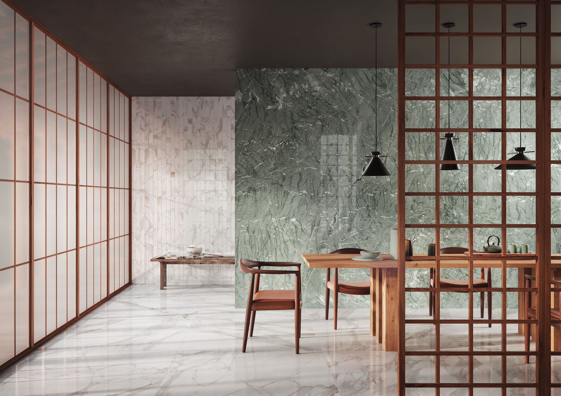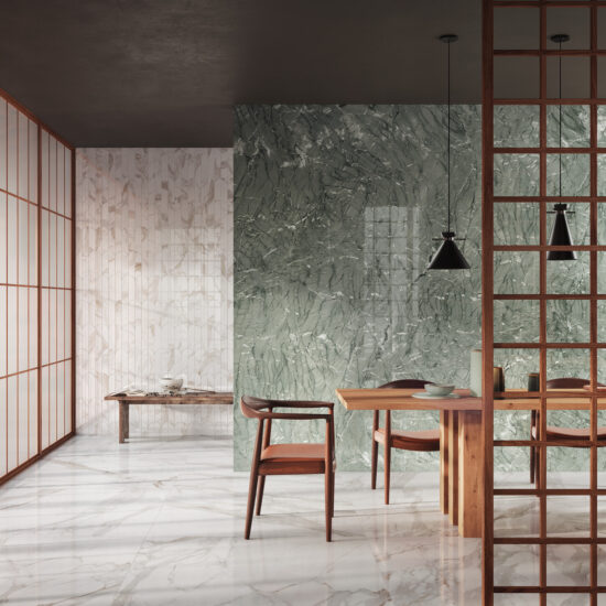 We return to the large dining room, the heart of the home, where the tea ceremony takes place. The space is surrounded by walls covered with Verde Antigua slabs, an evocation of celadon pottery, for combination with Mosaico Ventaglio Calacatta Nobile tiles in the glossy finish.