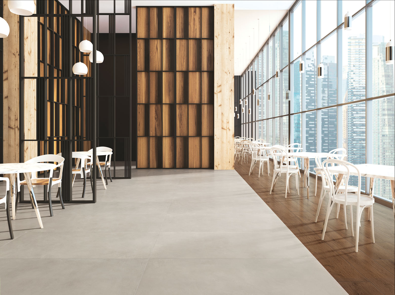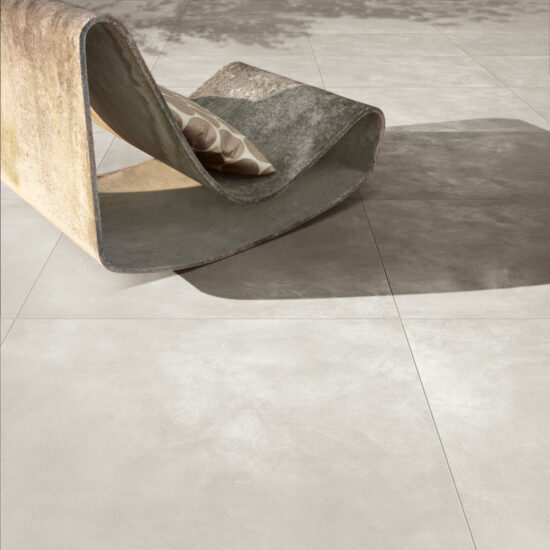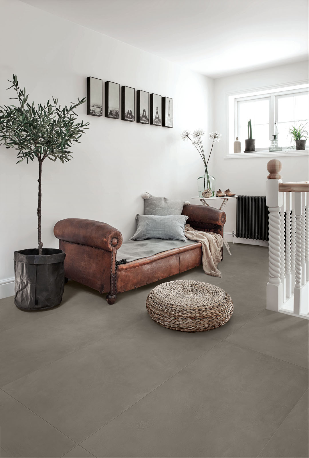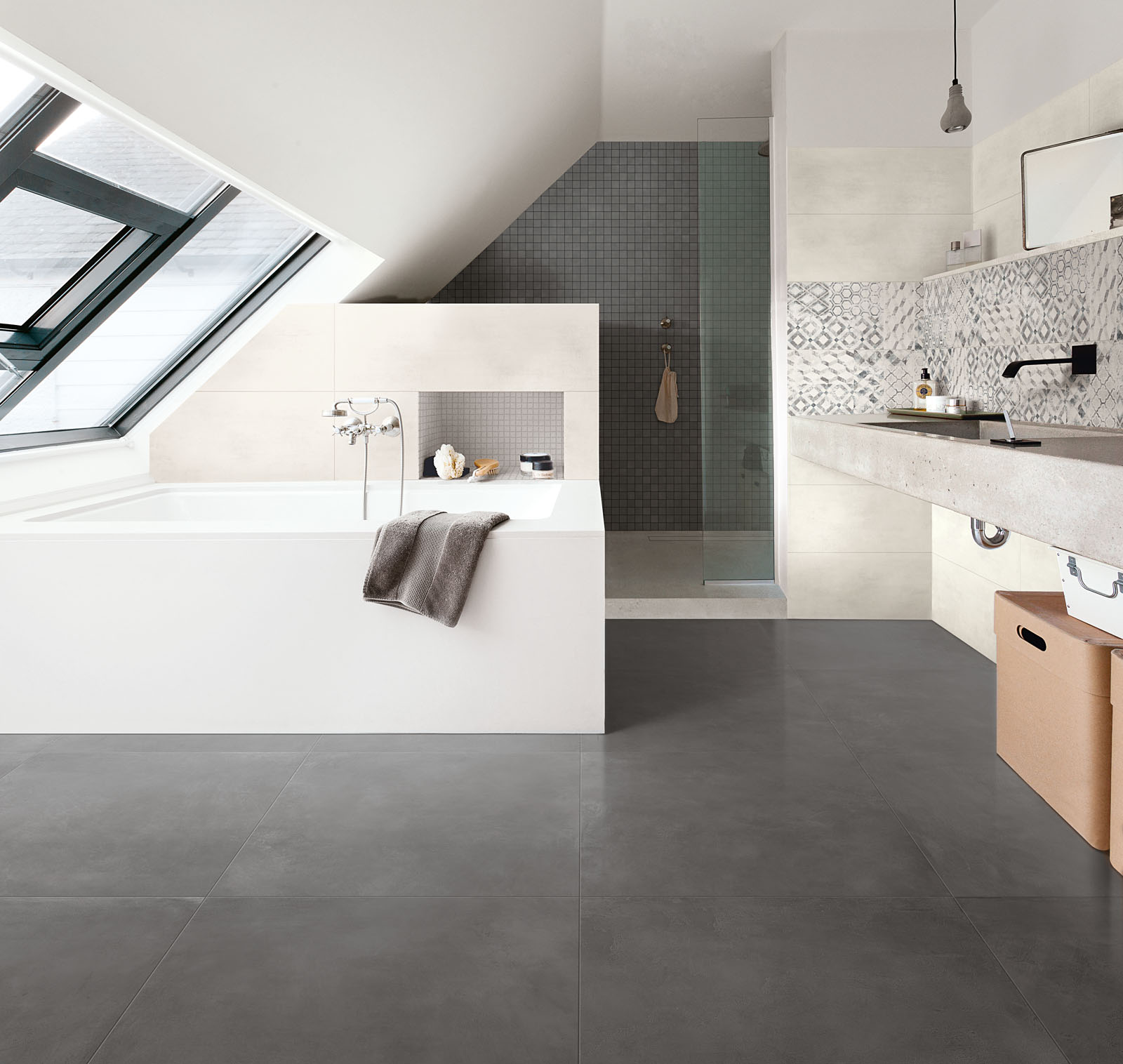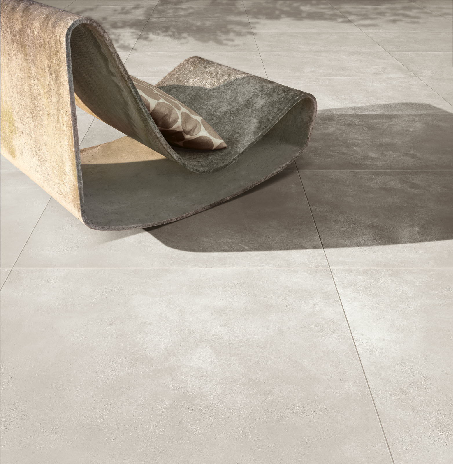 This effect of continuity is achieved by applying the resin look to the surfaces of rectified stoneware slabs, available in several sizes from 75×150 to 30×60 cm, by way of square tiles of 75×75 and 60×60 cm. Each piece, regardless of size, is placed next to the others with a minimal joint, and the continuous surface effect can be enhanced, during installation, by the use of a grout in a matching colour.