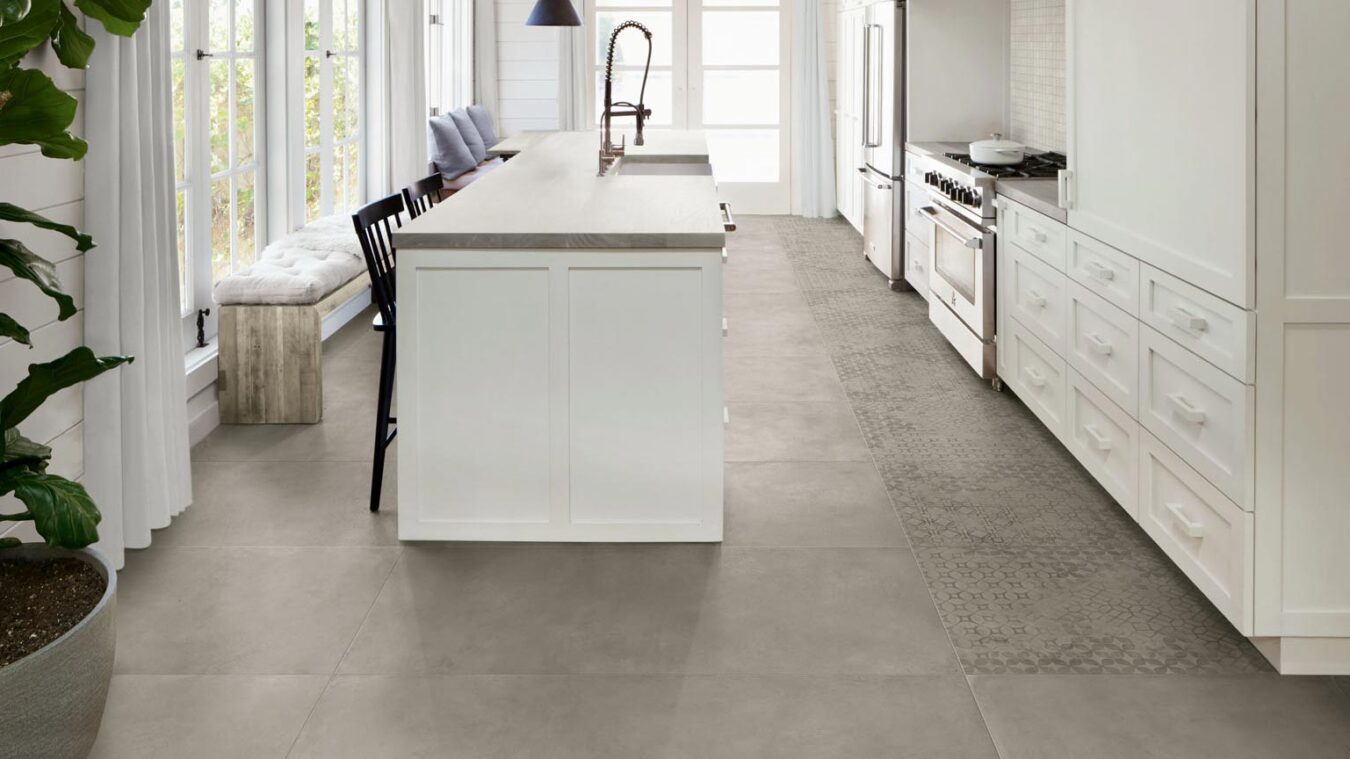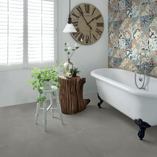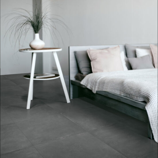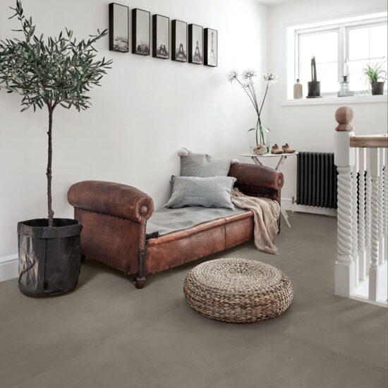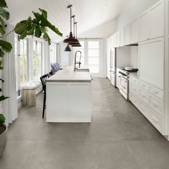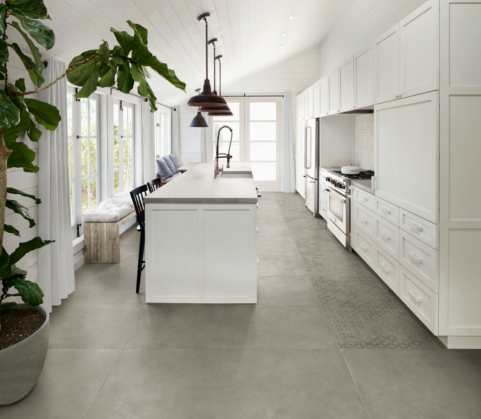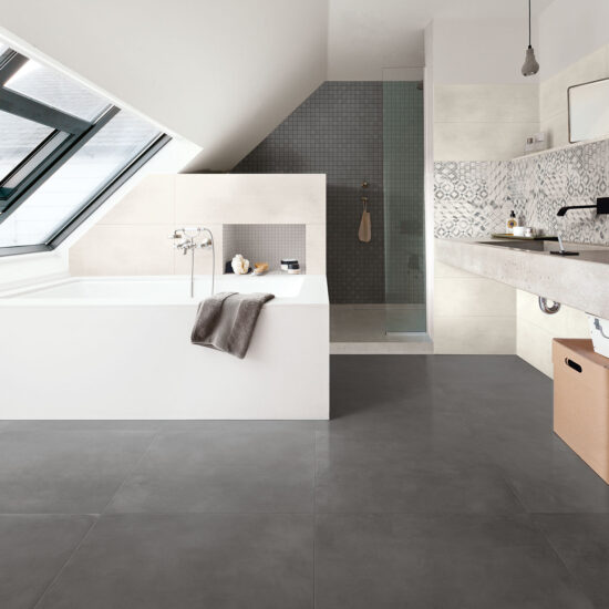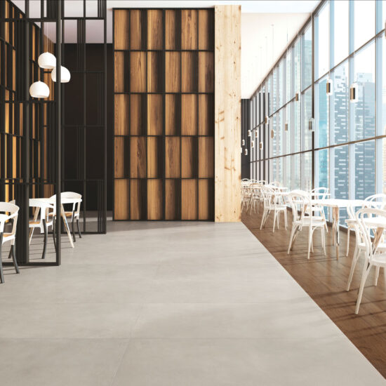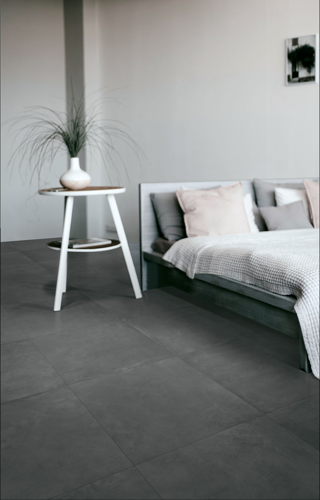 This effect of continuity is achieved by applying the resin look to the surfaces of rectified stoneware slabs, available in several sizes from 75×150 to 30×60 cm, by way of square tiles of 75×75 and 60×60 cm. Each piece, regardless of size, is placed next to the others with a minimal joint, and the continuous surface effect can be enhanced, during installation, by the use of a grout in a matching colour.