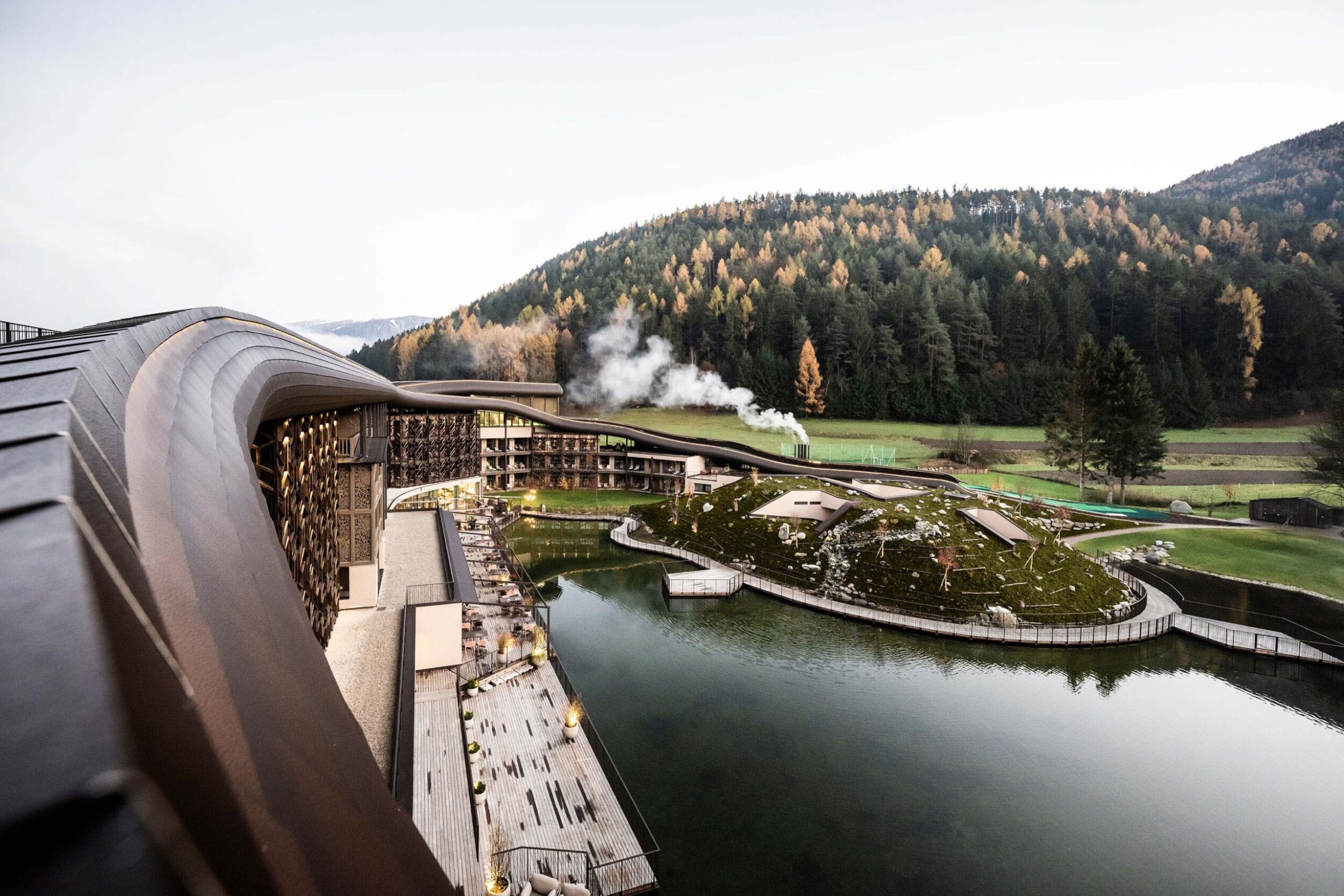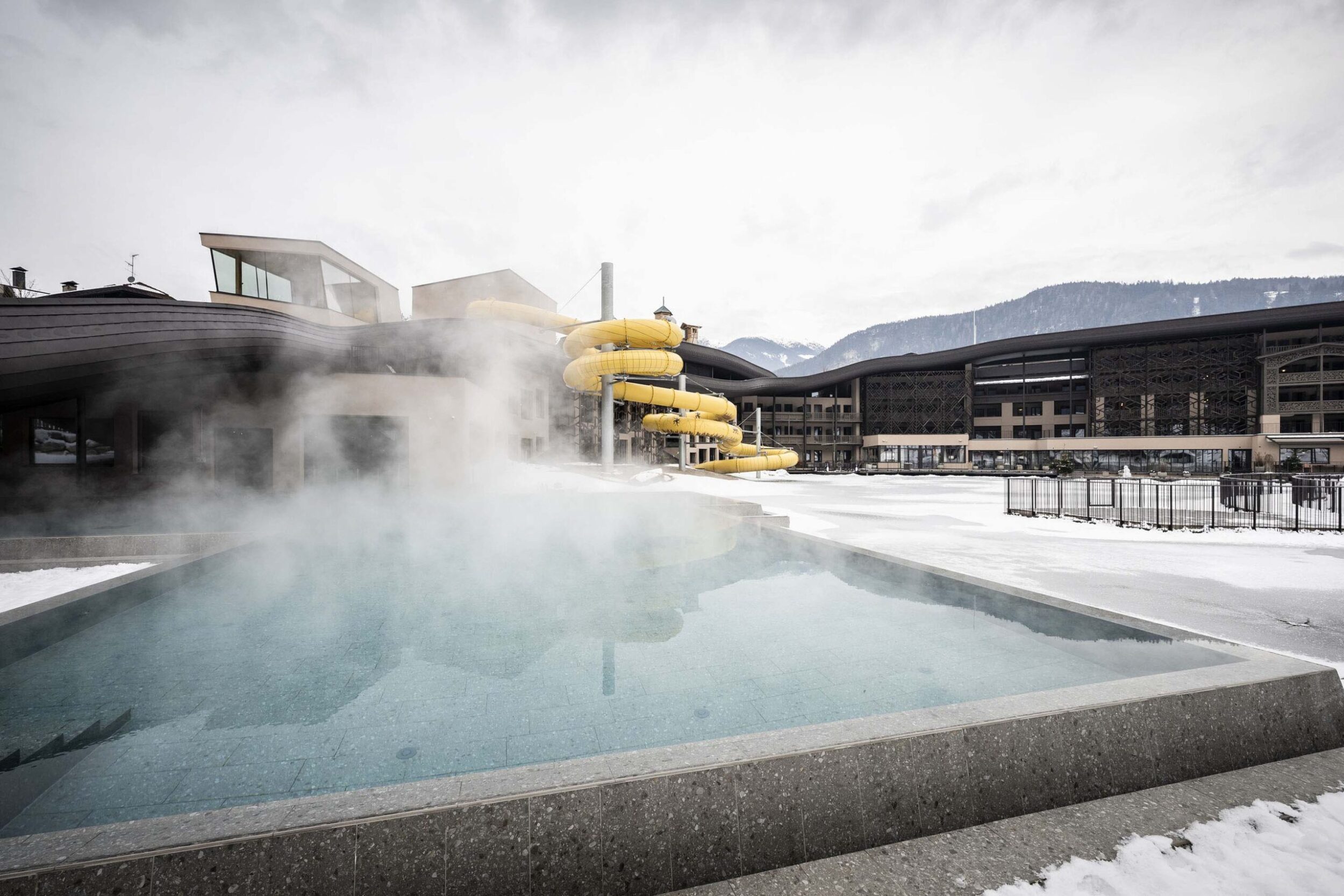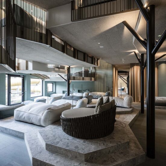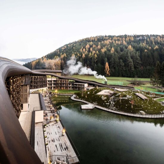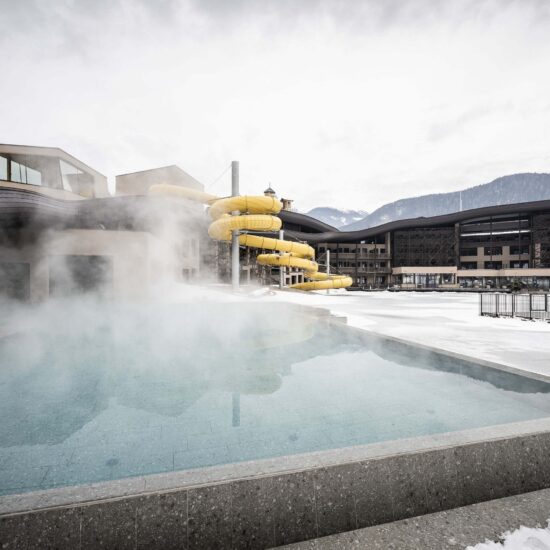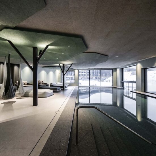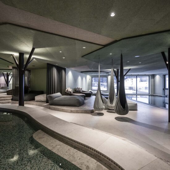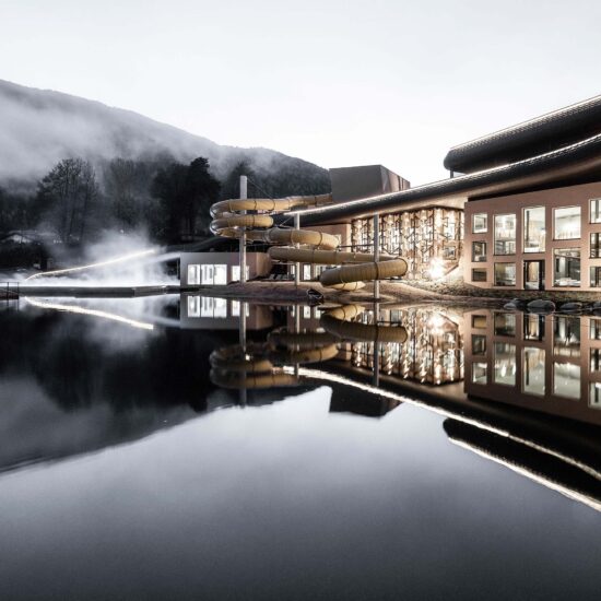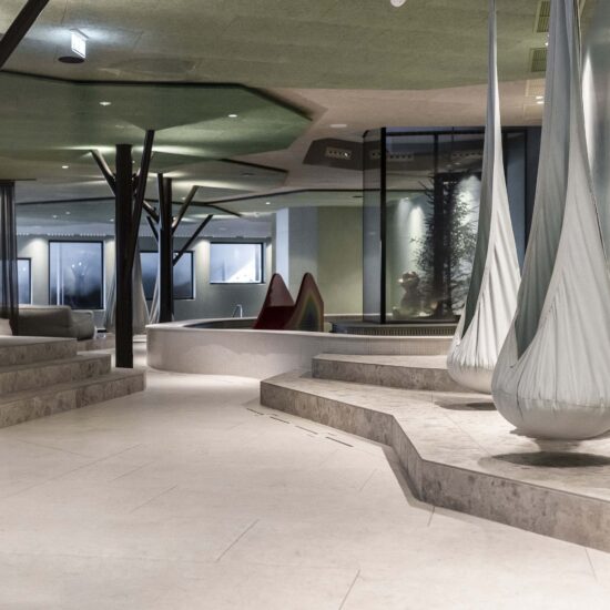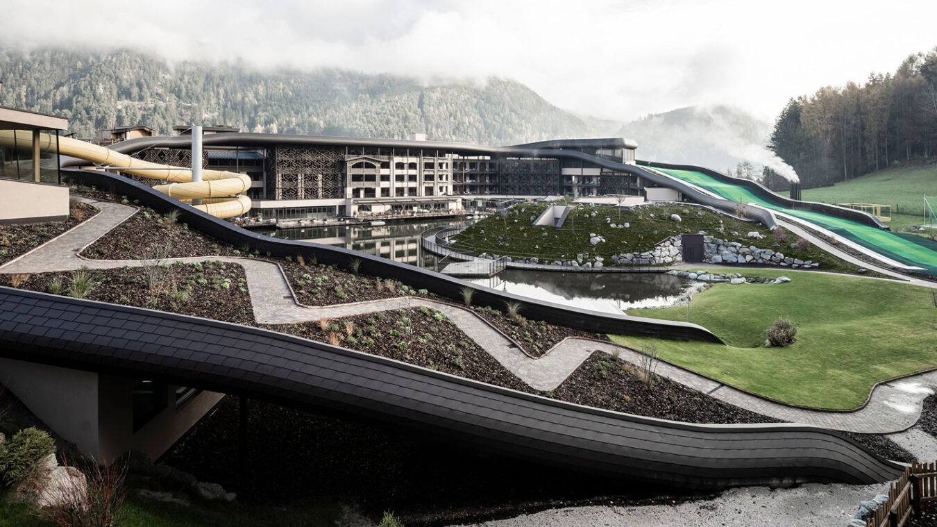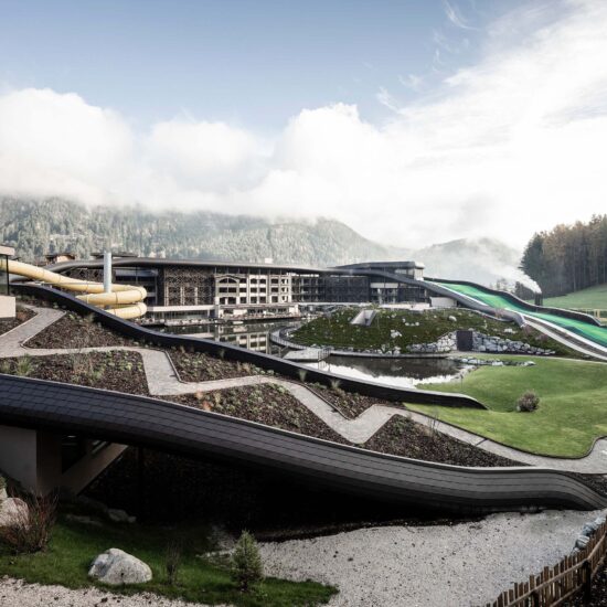 Noa – one of the leading mountain architecture firms – has few rivals when it comes to giving expression to different spirits and intentions. Its architects have once again achieved this with ease – and in this case perhaps with a touch of fun – when renovating the well known Falkensteiner Family Resort Lido at Casteldarne, in the Puster Valley, which specialises in accommodating families with children. The owners, who manage 30 hospitality locations in six adjoining towns, asked the firm to enlarge the facility and add new functions, while maintaining its specific vocation.