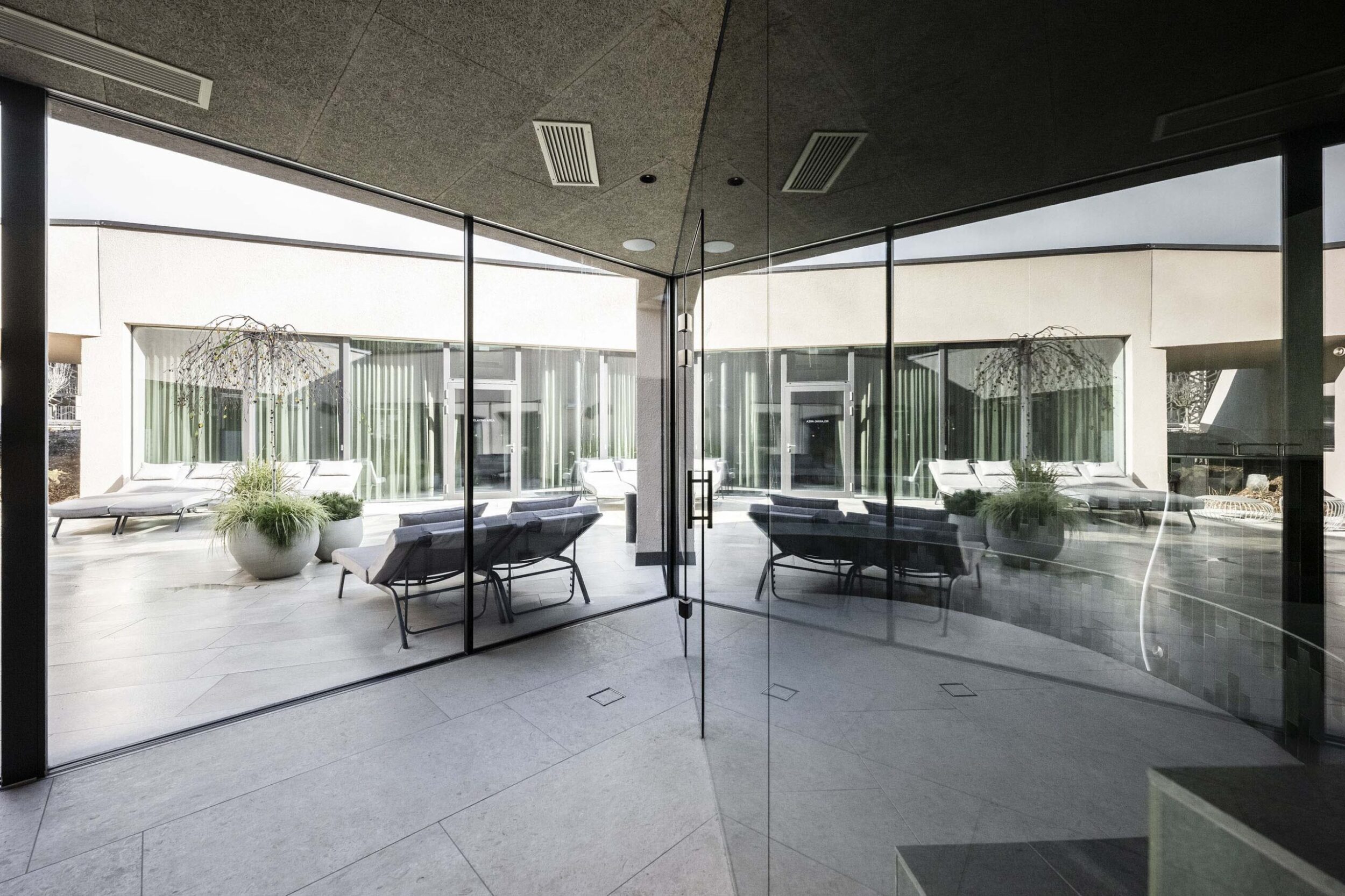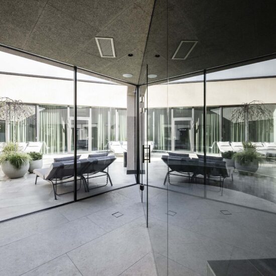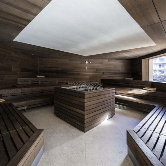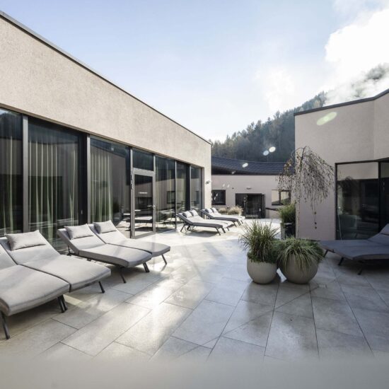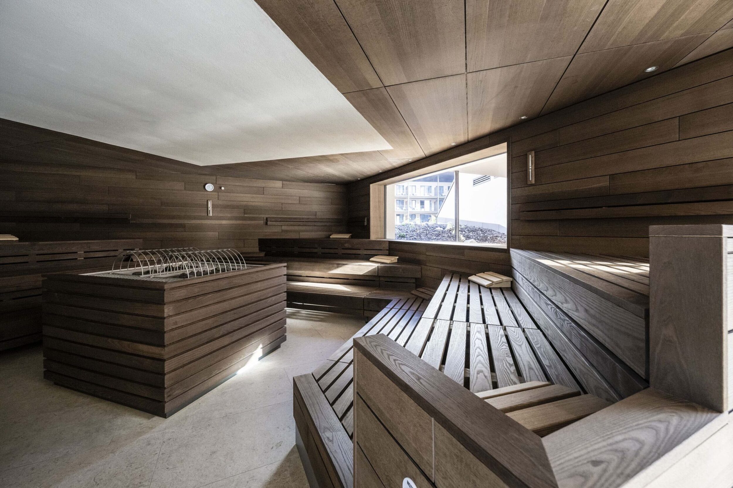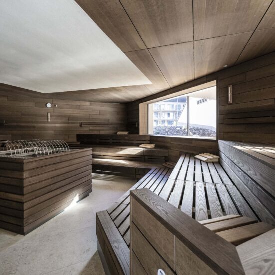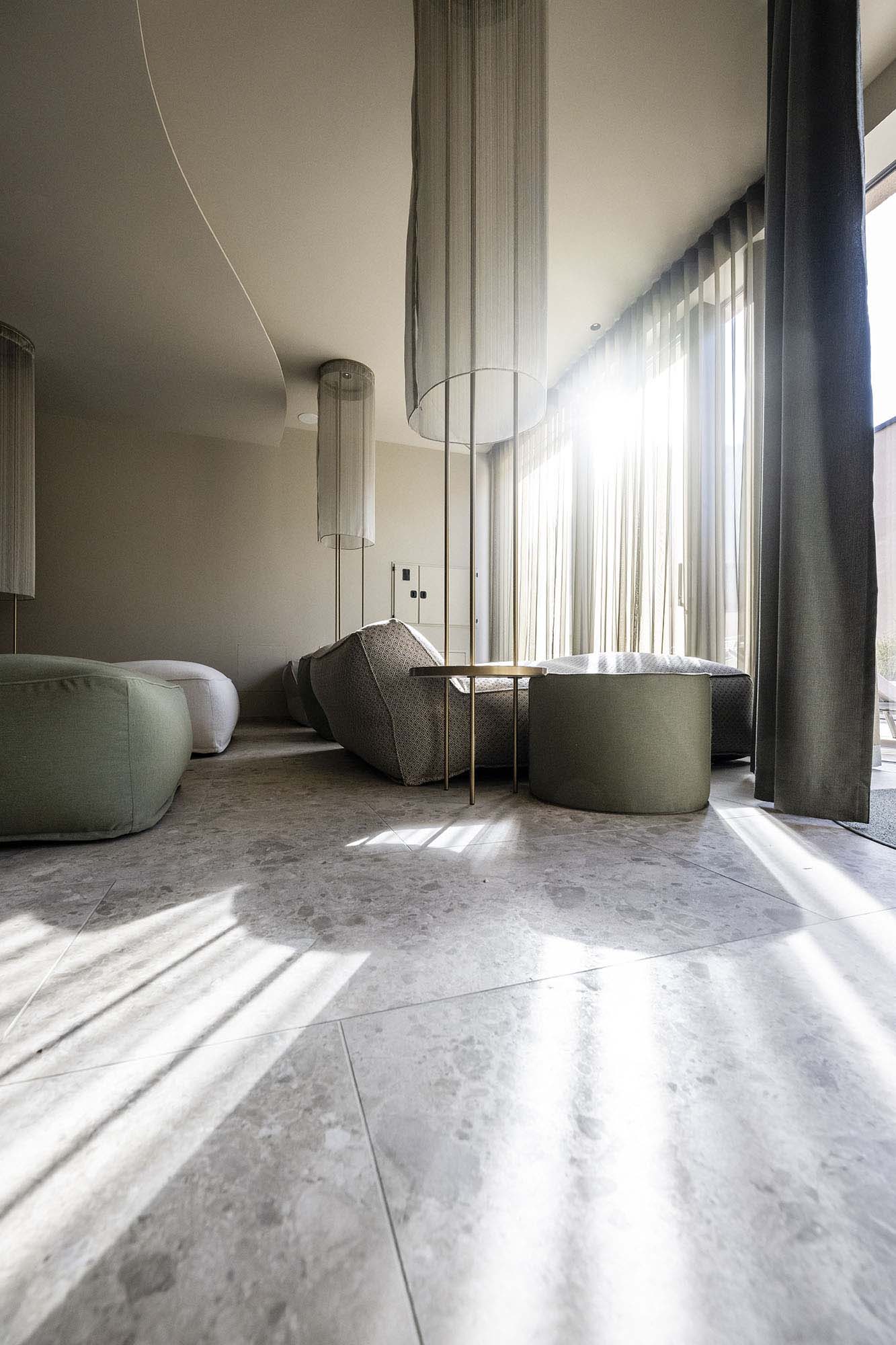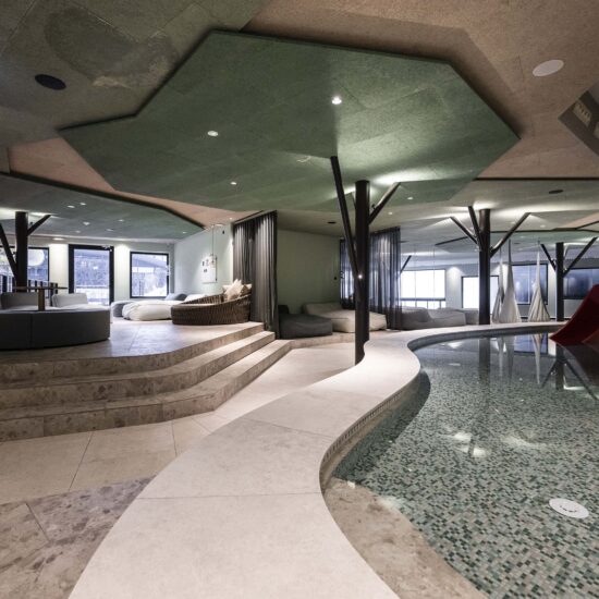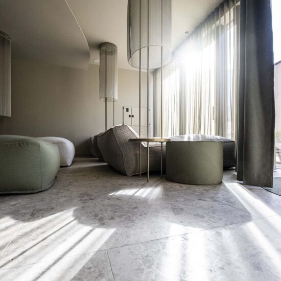 The zone around the large heated pool which extends outdoors – making this area particularly attractive in the winter months – is finished with natural Realstone_Navigli, a stone-effect stoneware (30×60 cm) with a high-tech surface featuring a very pleasant texture combined with impeccably anti-slip properties, while its outdoor area is defined by the warm, neutral shade of the Realstone_Jerusalem XT20 Noce variant in 50×100 cm size and 20 mm thickness. Also outdoors, the communal relaxation areas are paved with the elegant, understated, frostproof Season porcelain stoneware.
