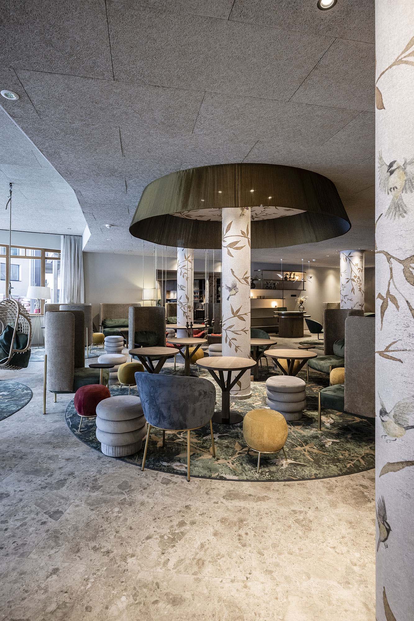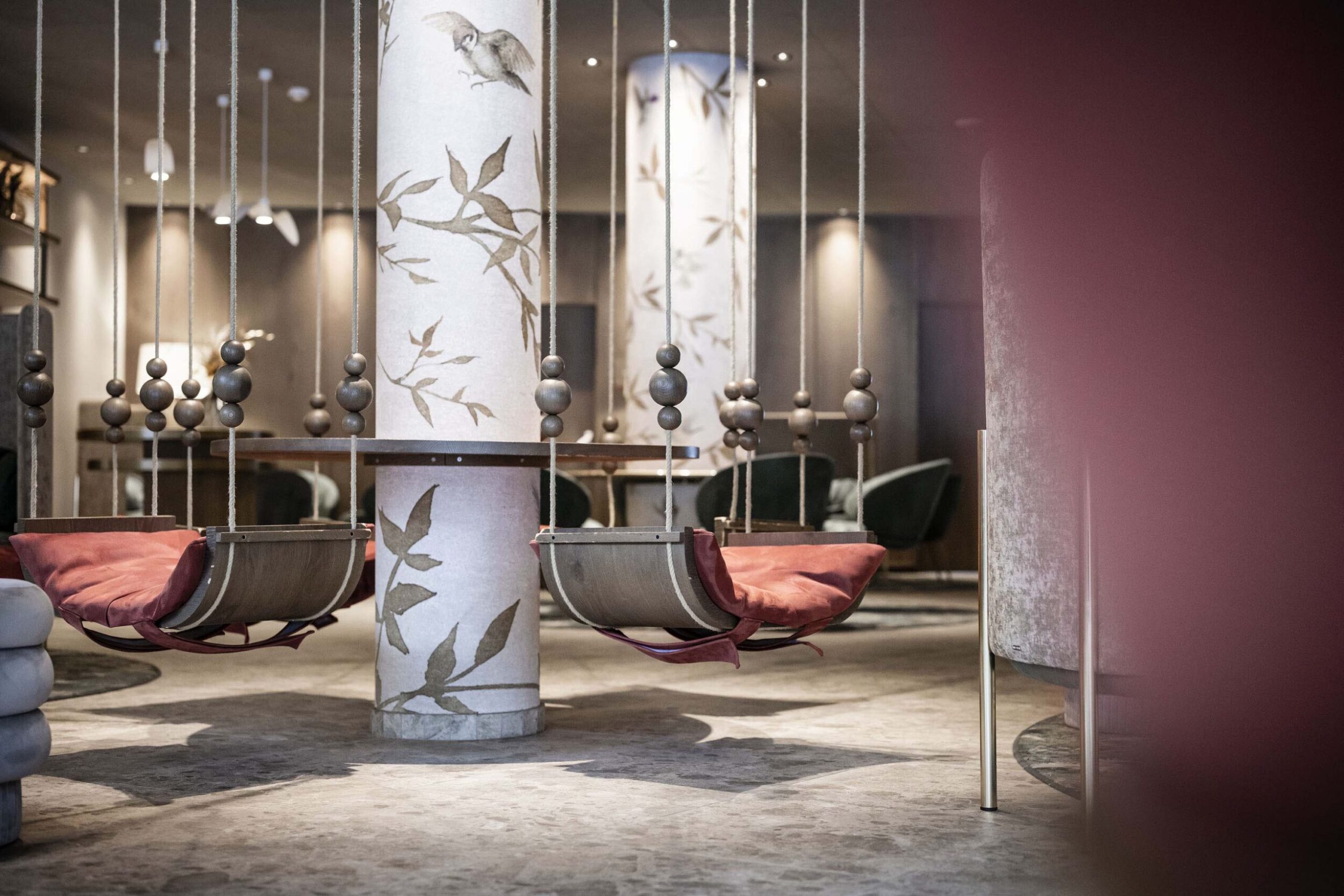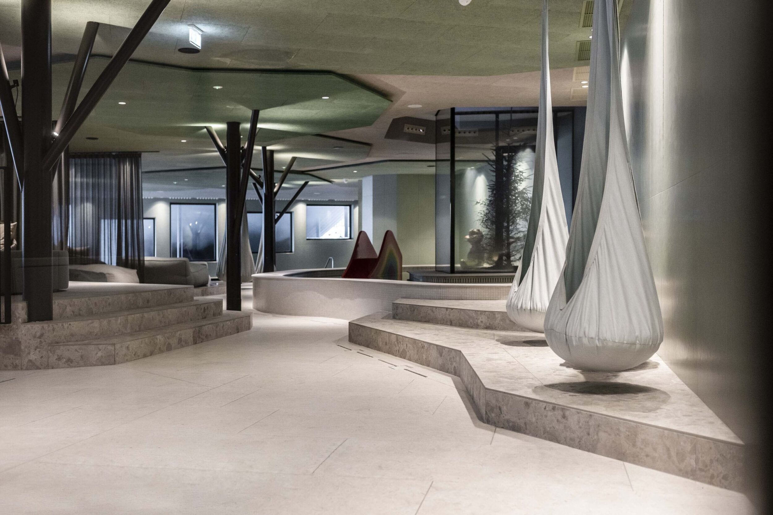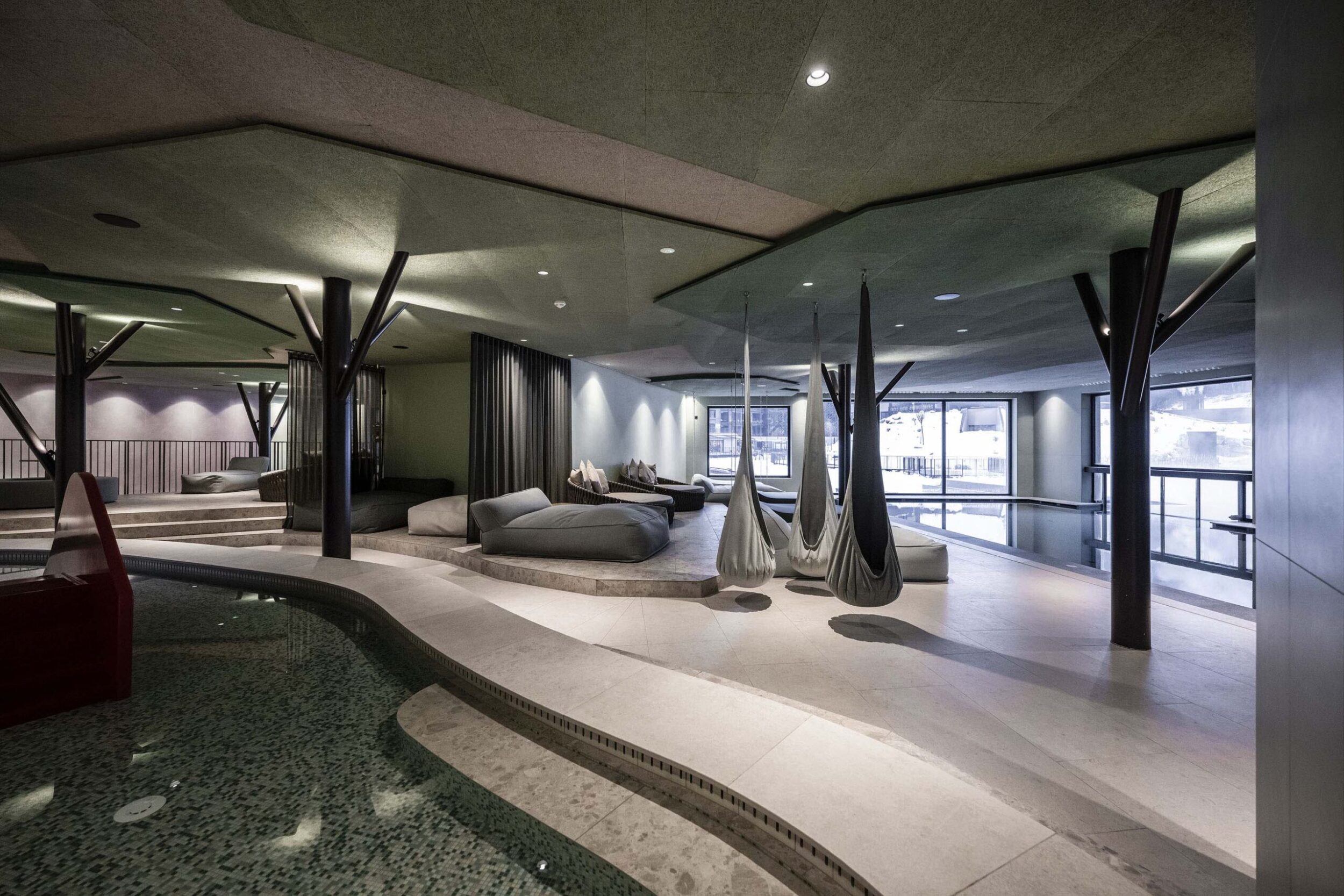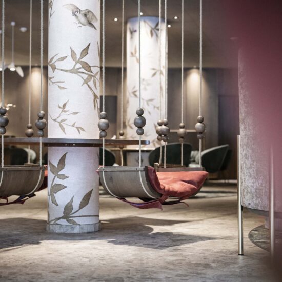 The design of the interiors, conceived to ensure fun for kids and relaxation for their parents, has a similar unity. The concept is clear right from reception, with decorated pillars that evoke the surrounding woodland, roundabouts and swings. The 36 new rooms, added to the 82 existing ones, adopt a new, communicating model, with separate zones for parents and children.