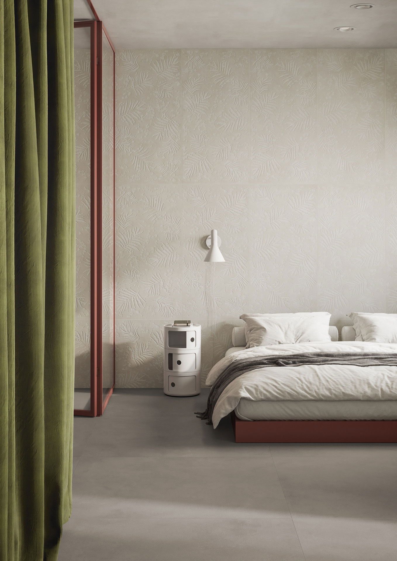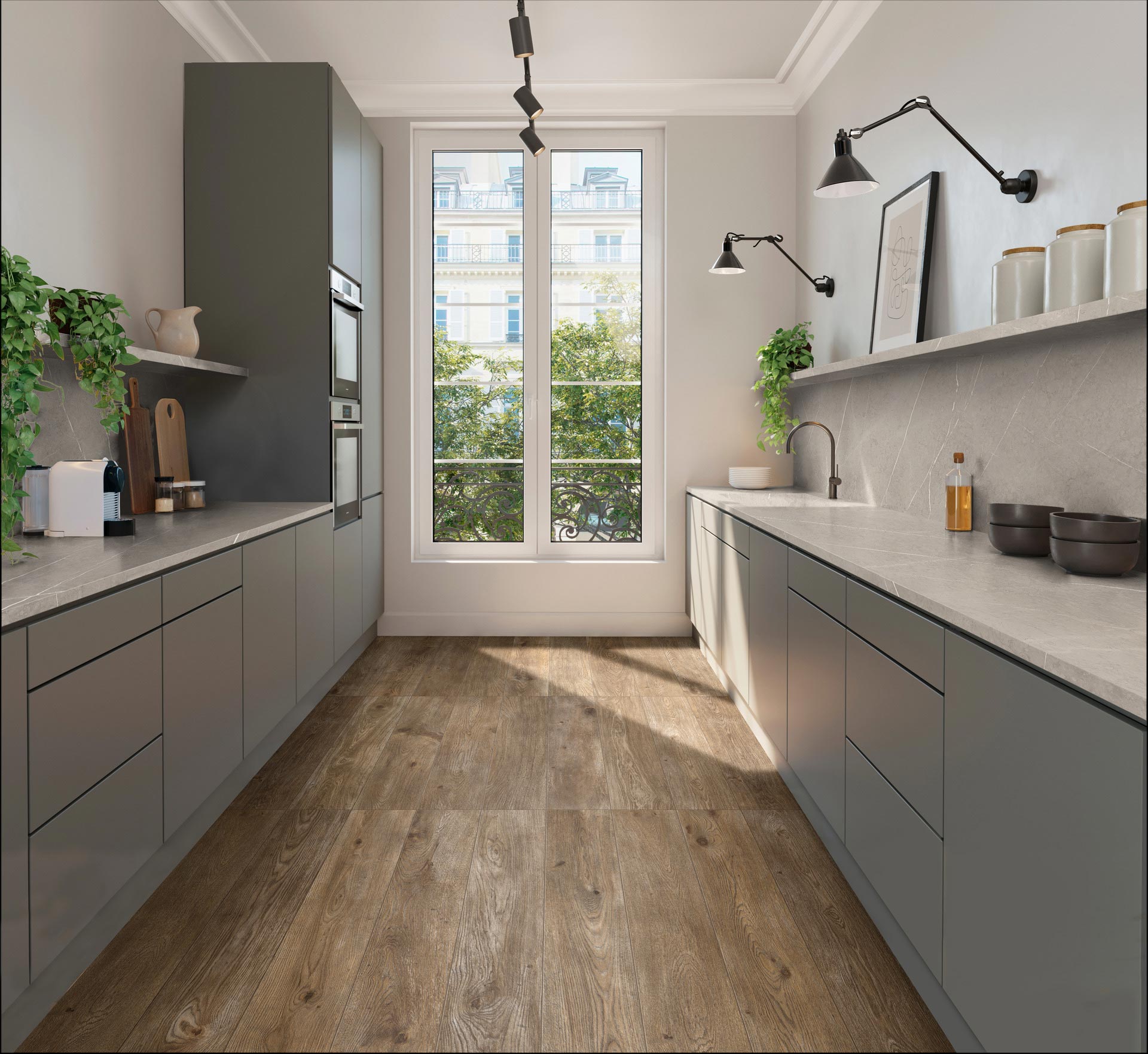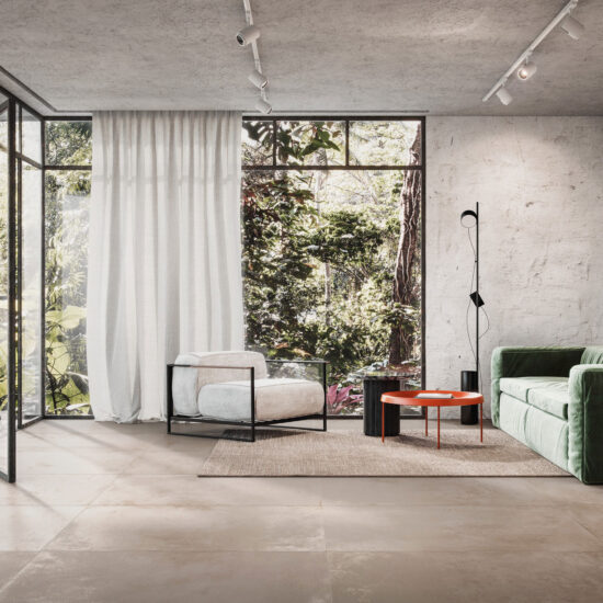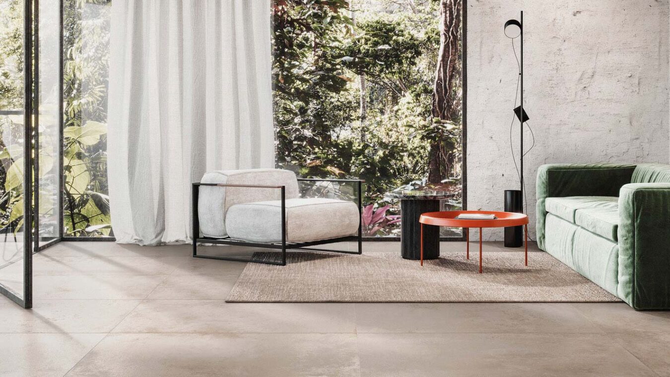 By choosing a concrete or marble effect stoneware floor covering or a parquet with a running-bond or herringbone layout, you can clearly proclaim your adoption of a style and an idea of what a home should be.