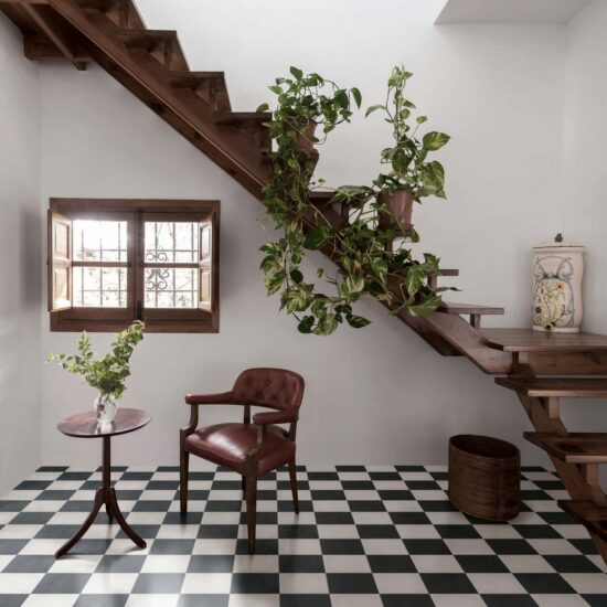 Let’s imagine we’re in town and walk into an apartment in a residential block. Behind us is a stairwell with marble flooring, its walls painted in pale, light, neutral colors. Daylight floods in through the large windows, which offer glimpses of greenery and perhaps the balconies of the building opposite.