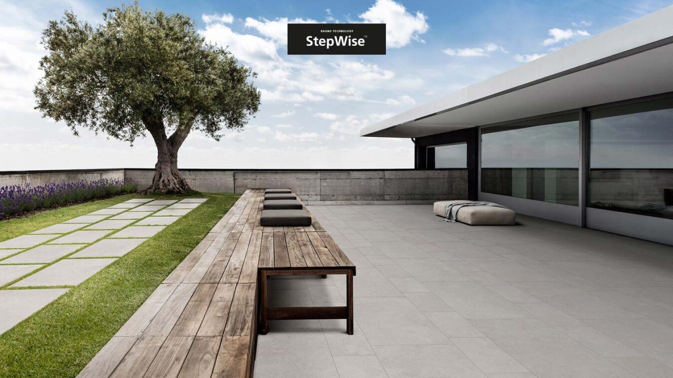 The new Ragno stonewares made with the StepWise technology are also treated mechanically over their entire surface to enhance their soft appearance, while also providing a high dynamic coefficient of friction (DCOF, ANSI American National Standard Institute). This coefficient measures the performance of tiles when wet: 0.42 Newton is the standard for surfaces) when installed indoors. StepWise offers a DCOF of 0.60 Newton, far better than the standard requirement.