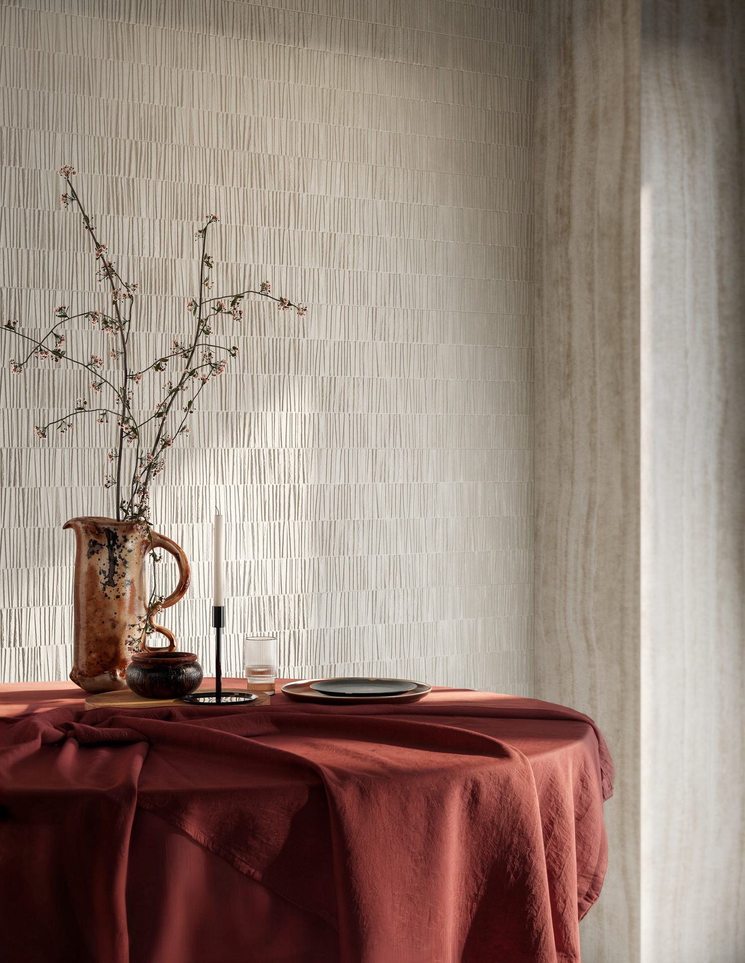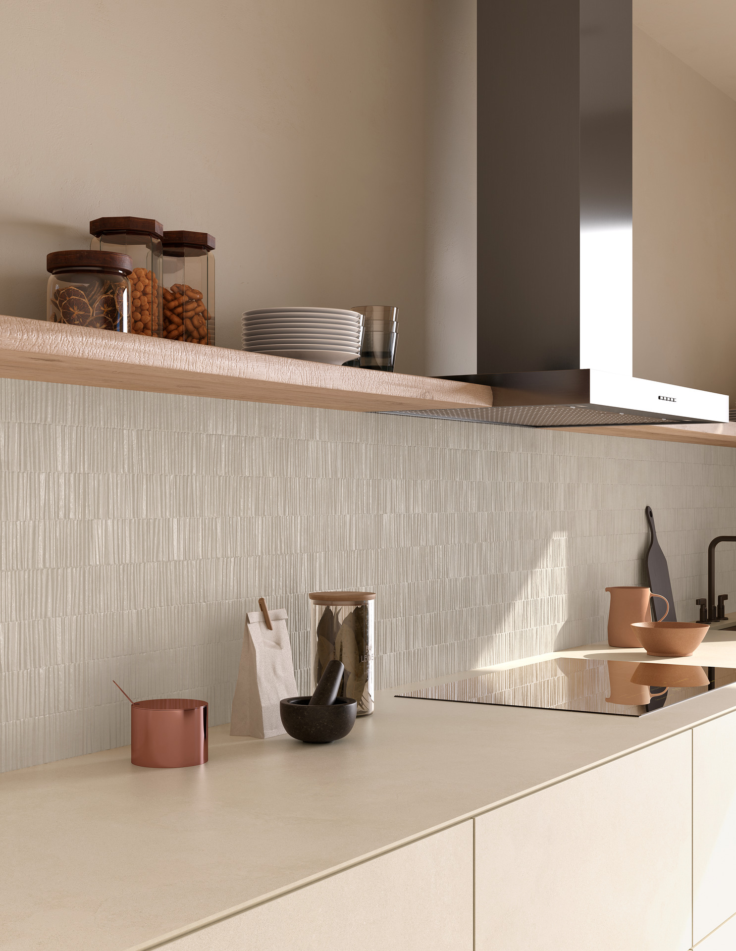 The series is available in a unique 33×100 cm format and in two neutral, versatile shades: Pomice, the lighter one, and Calce, slightly darker. Alongside the two base tiles, there are two three-dimensional structures and one decorative piece that amplify the expressive power of the project.