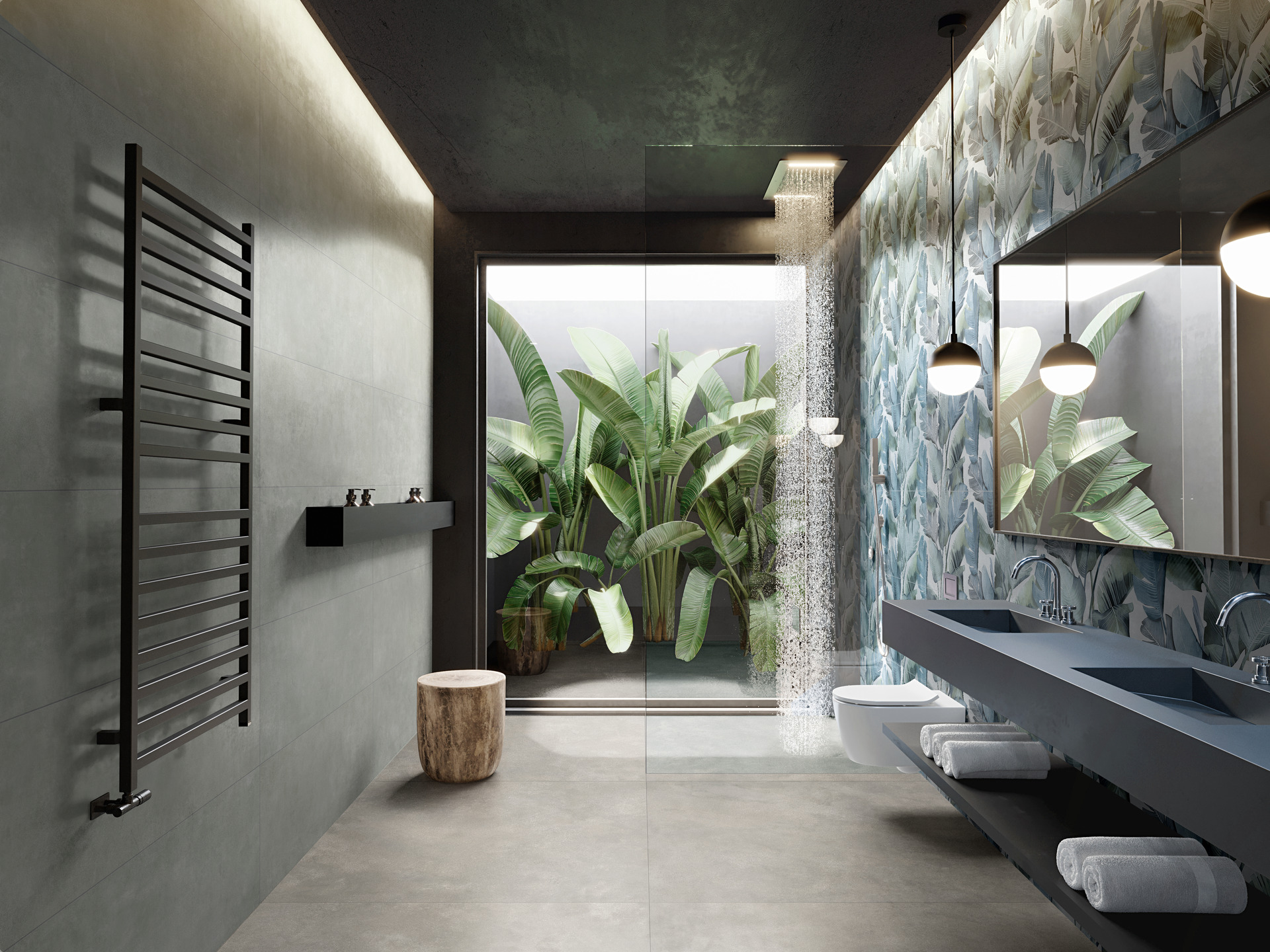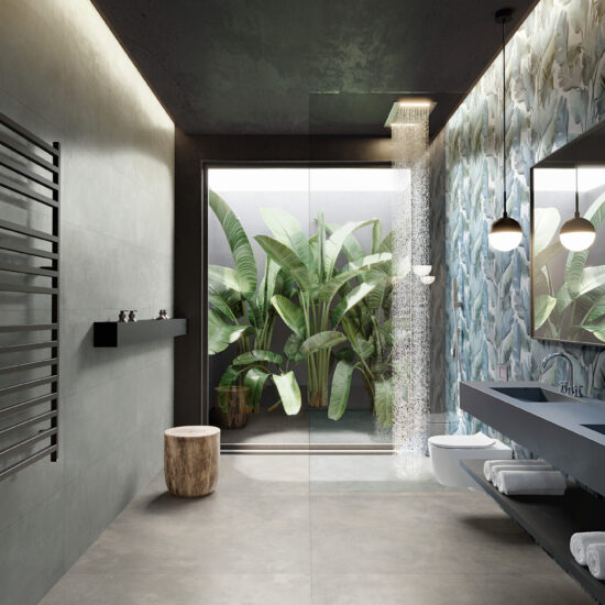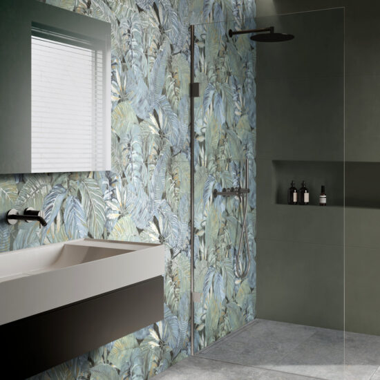 Even in small rooms, decors can be skilfully deployed to achieve an exciting visual effect without crowding the interior: for example, identifying the washbasin area with a covering with a botanical theme, framed with monochrome tiles, creates depth and dynamism without disrupting the room’s overall harmony.