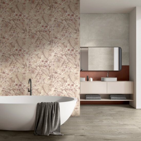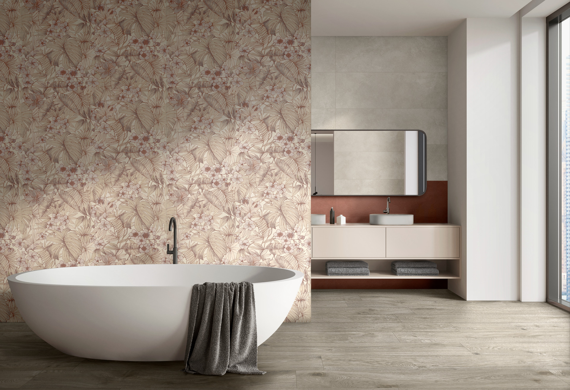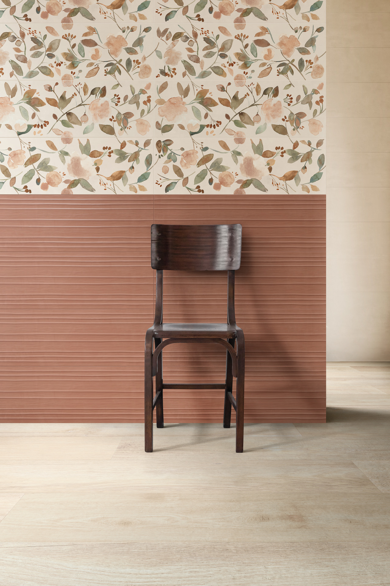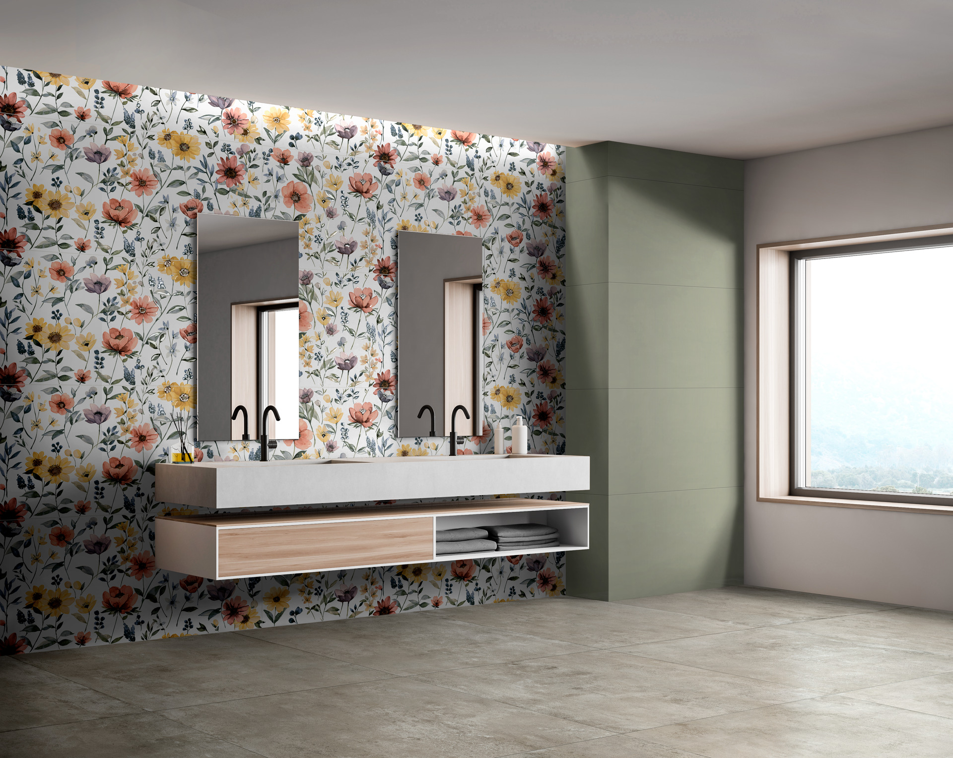 Wallpaper-effect floral tiles are an excellent way of defining a room’s identity and creating a welcoming, refined mood. The choice of color is fundamental: if the covering is in pastel shades such as powder pink or blue, or sage green, the ideal combination may be with natural materials like pale wood or linen, for a soft, relaxing effect. For example, the Stratford and Stratford Wall collections interpret the wallpaper effect with subtle floral motifs on neutral, powdery backgrounds, perfect for light-filled, minimalist interiors.