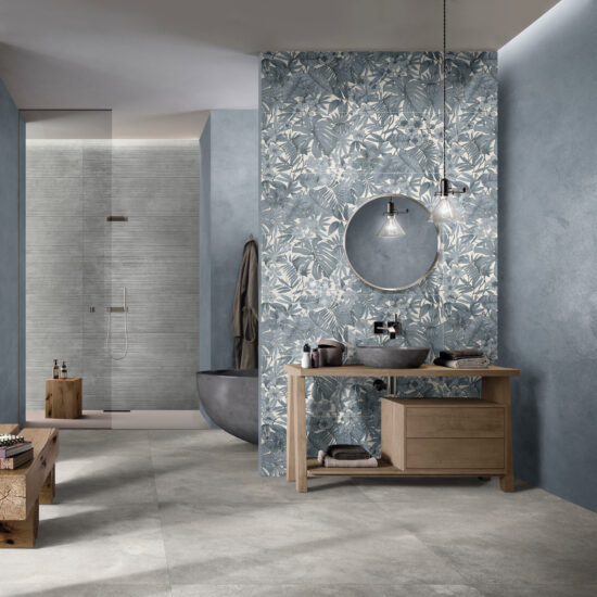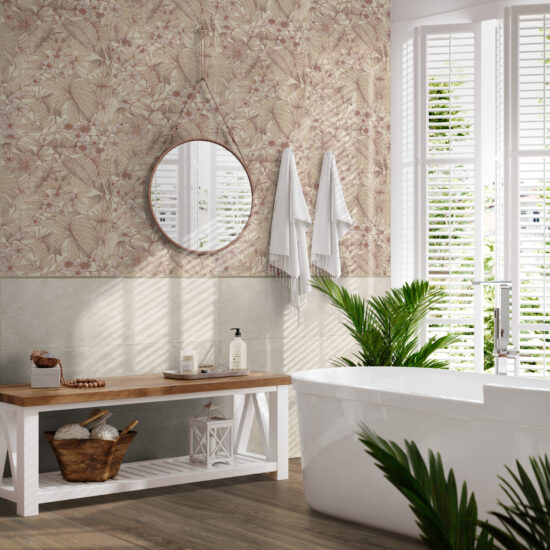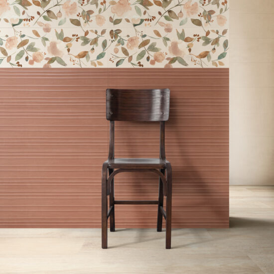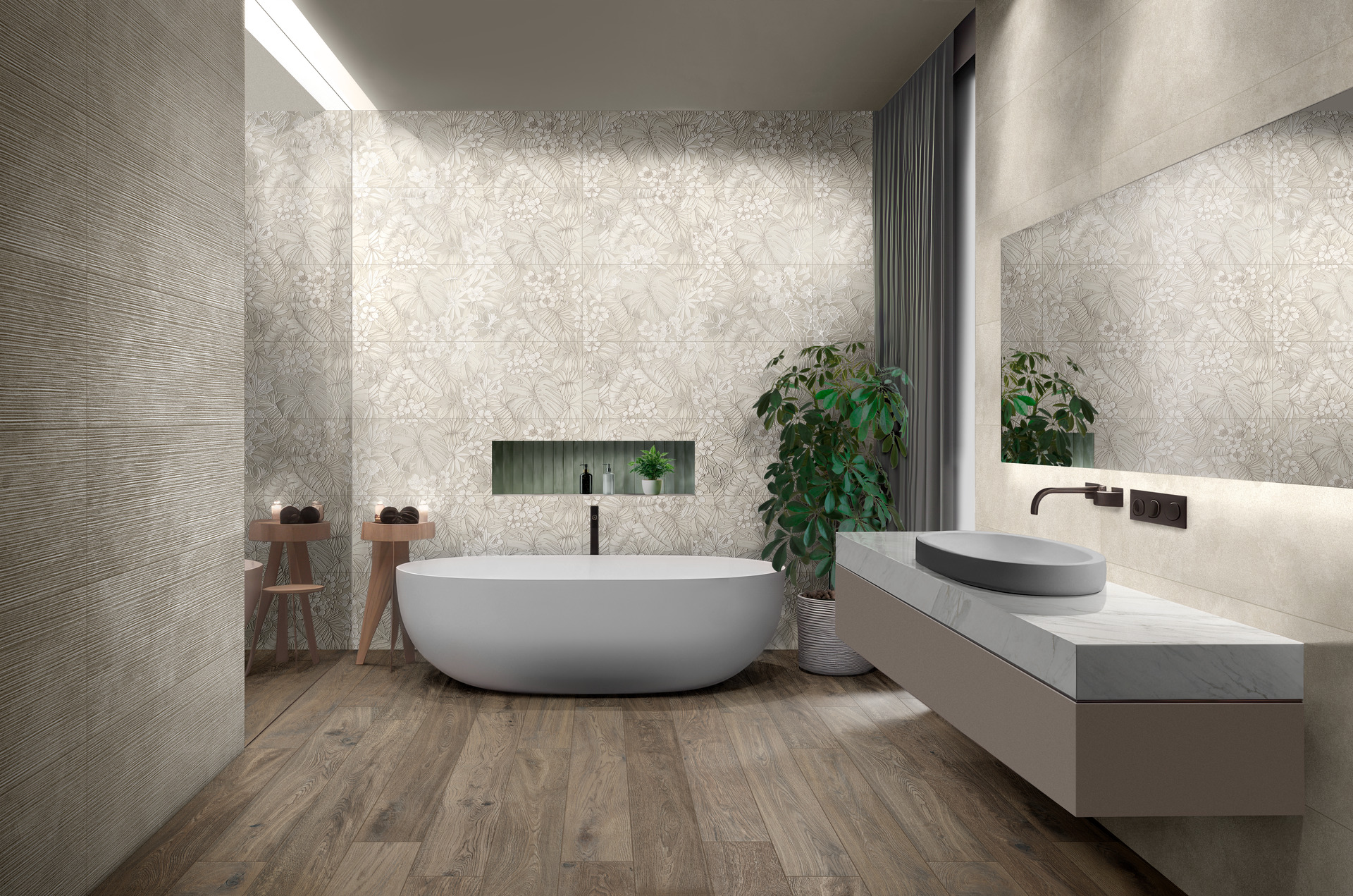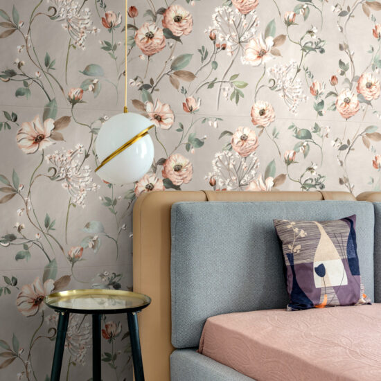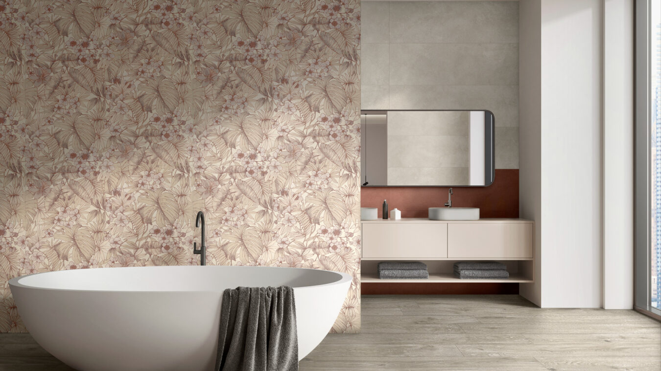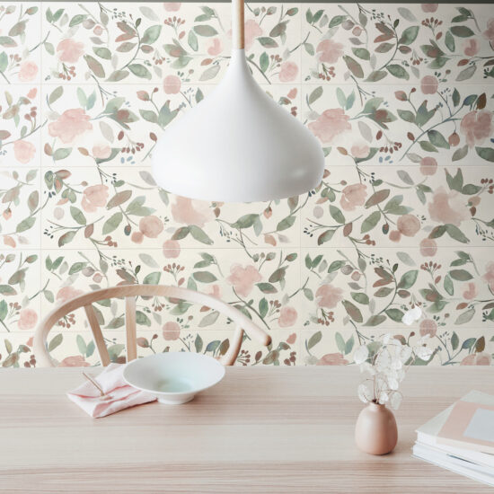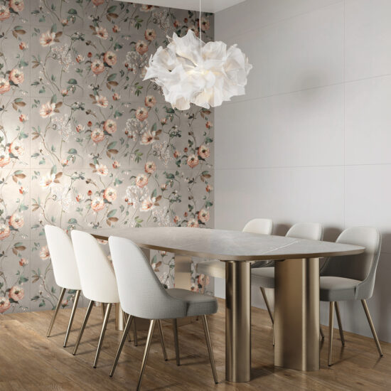Wallpaper-effect floral tiles are an excellent way of defining a room’s identity and creating a welcoming, refined mood. The choice of color is fundamental: if the covering is in pastel shades such as powder pink or blue, or sage green, the ideal combination may be with natural materials like pale wood or linen, for a soft, relaxing effect. For example, the Stratford and Stratford Wall collections interpret the wallpaper effect with subtle floral motifs on neutral, powdery backgrounds, perfect for light-filled, minimalist interiors.