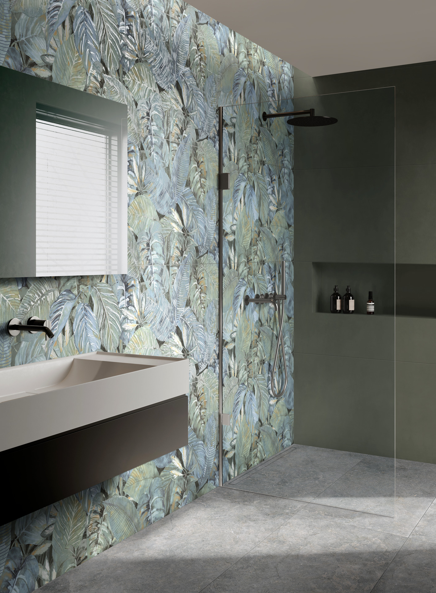 For lovers of past beauties, floral tiles with a more vintage character are an appealing choice with a strong visual impact. Inspired by classical ideas of nature and period wallpapers, these surfaces evoke sophisticated ambiences where decoration becomes a crucial factor. Stylised flowers and solid colors like the olive green, blue and beige of the Papers collection combine with rich patterns in the design of chic, eclectic interiors.