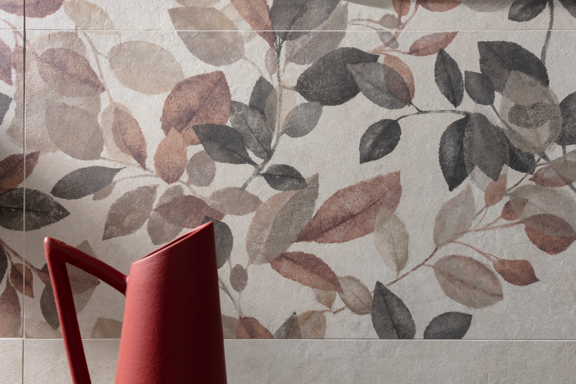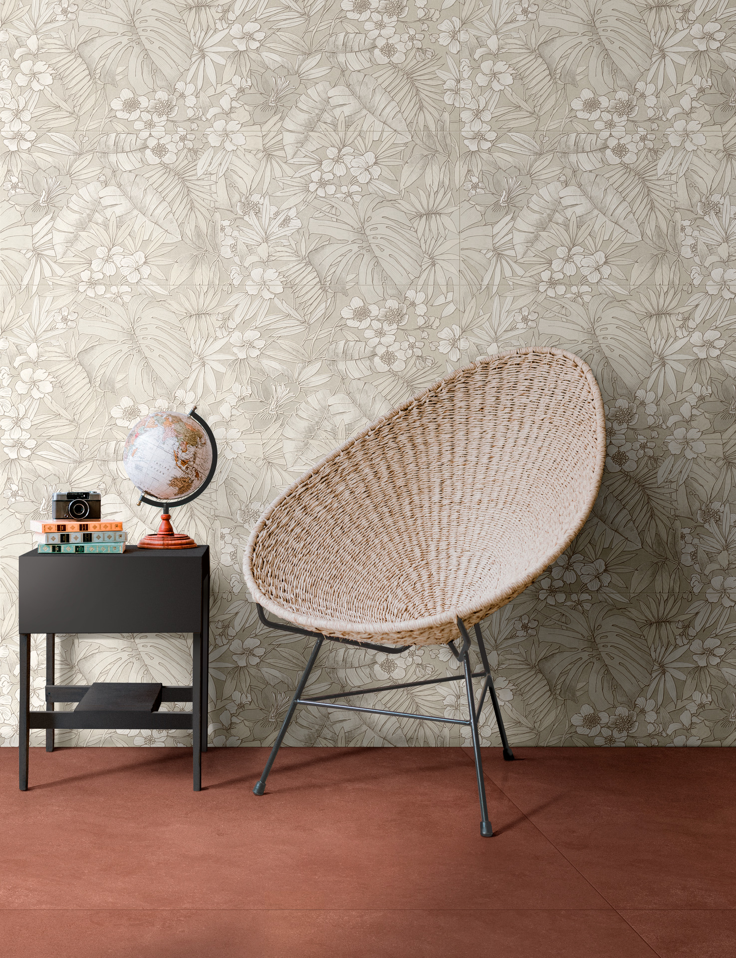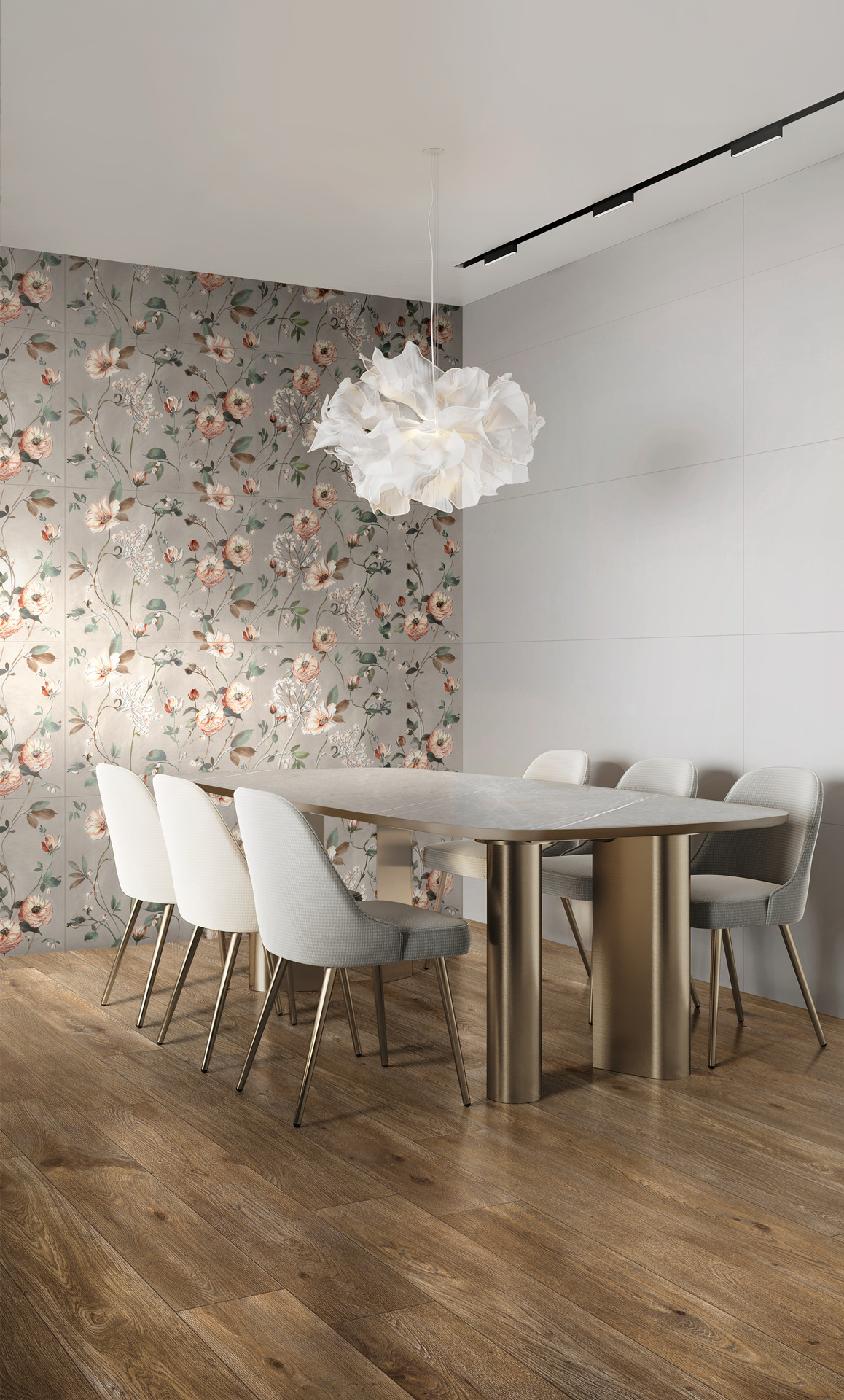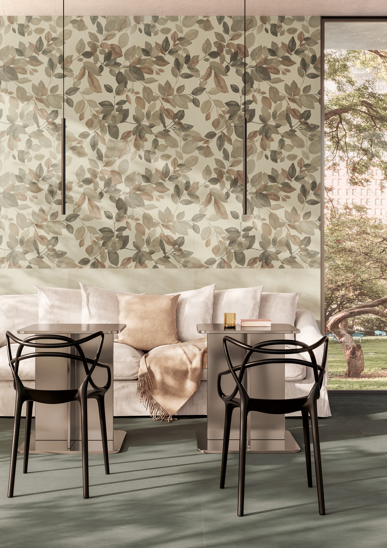 Nature regains a leading role in home design, through floral patterns that cover walls with unprecedented elegance. Stylised or lush, subtle or emphatic, botanical motifs are gaining ground in contemporary interior design with wallpaper-effect ceramic wall coverings that combine decorative beauty with technical convenience.