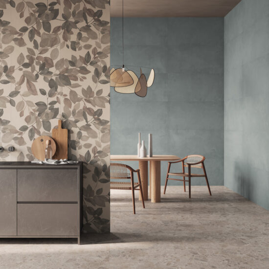 No longer just a romantic echo of the past, it’s now a daring, sophisticated design statement for modern, eclectic or minimalist rooms. Ceramic surfaces become the canvases for oversize flowers, interwoven tendrils, stylised foliage and patterns inspired by botanical art, with an exciting, surprising visual richness. Ragno’s floral wallpaper-effect collections interpret this trend to perfection, with wallpaper-look ceramic coverings that combine beautiful decoration with the practical benefits of porcelain stoneware. Each of them portrays an individual vision of the floral decorative style: layered, elegant, modern or artistic. The result is a new approach to home design, where ceramics are central to a natural aesthetic with a strong emotional appeal.