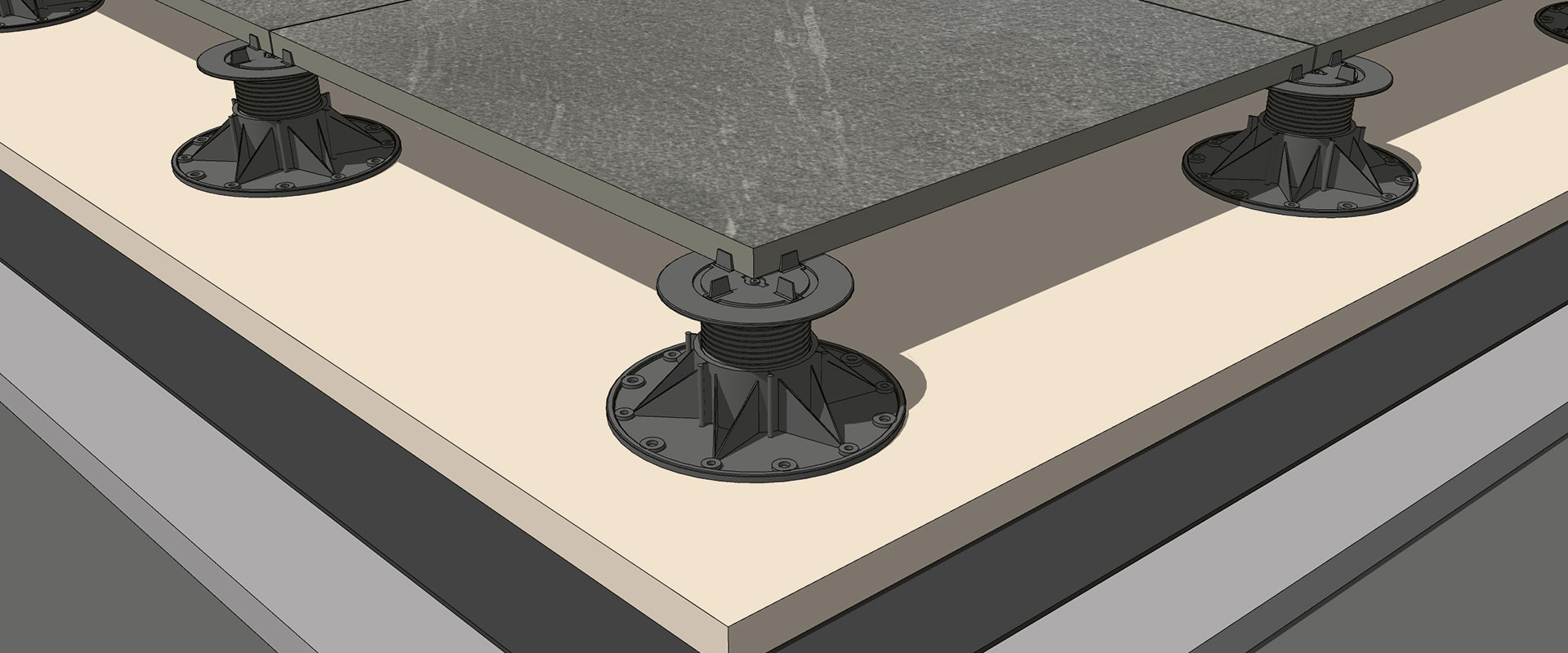 • For a greater increase in thermal insulation/energy performance, thermal insulating panels of suitable density can be added directly between the waterproofing layer and the adjustable raised floor pedestals.